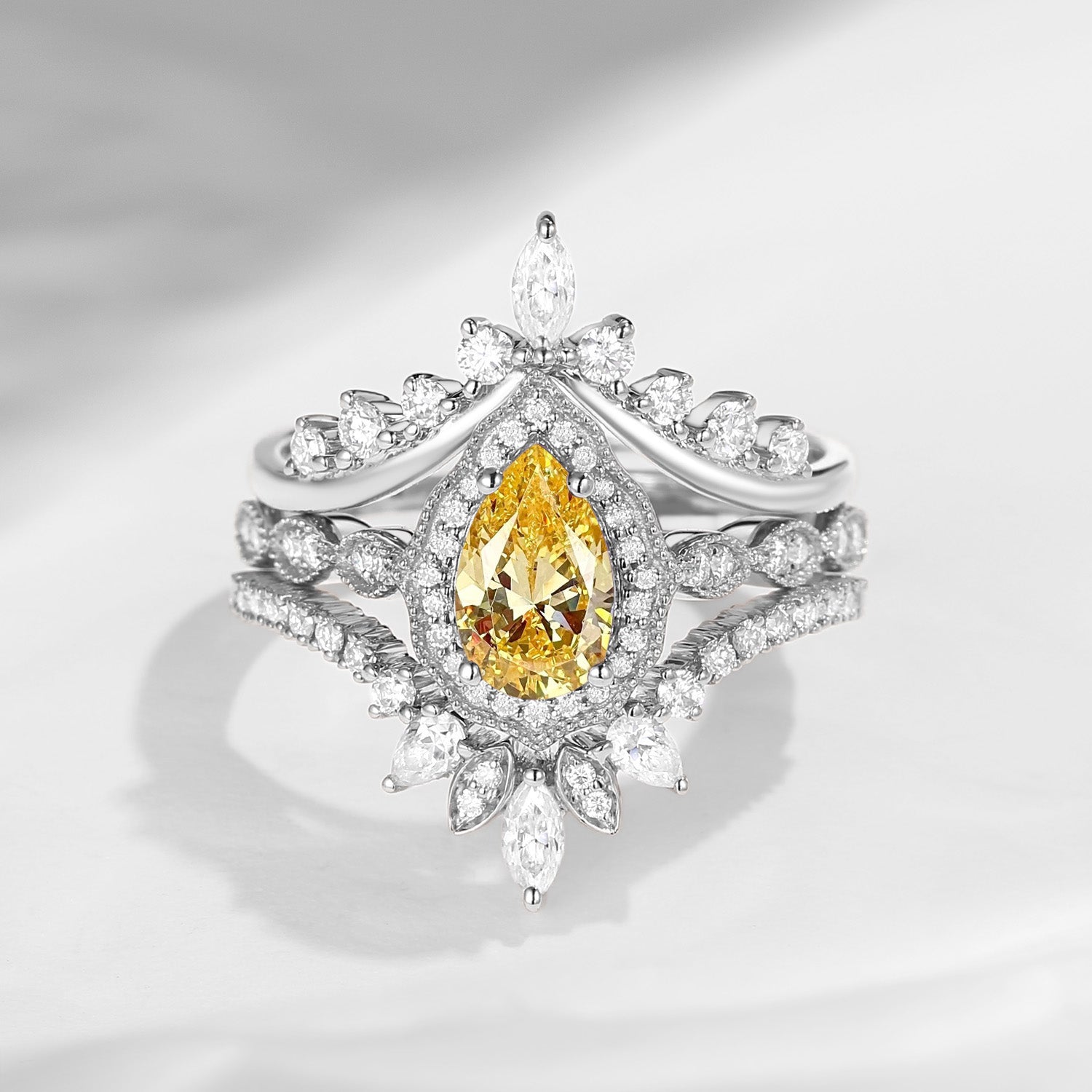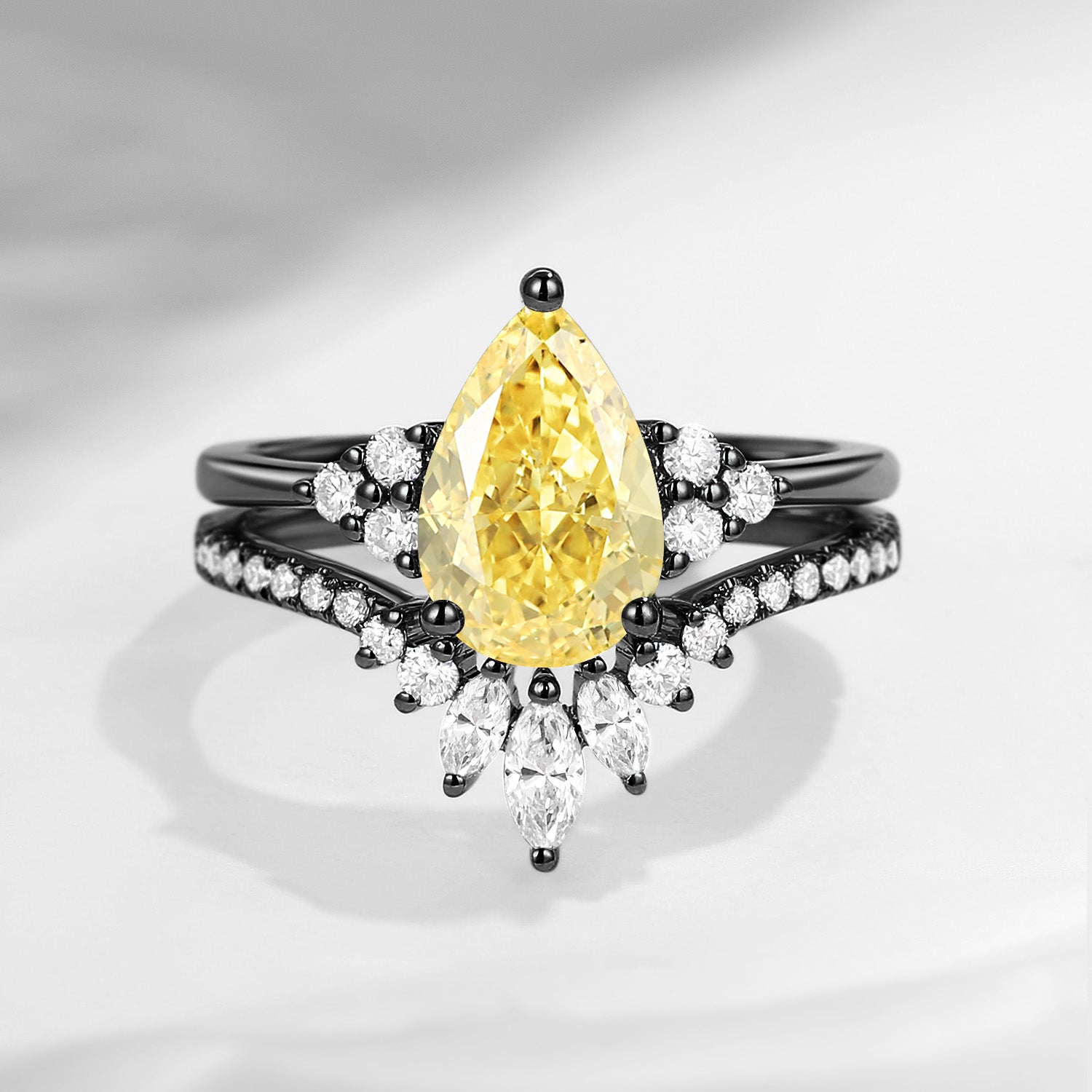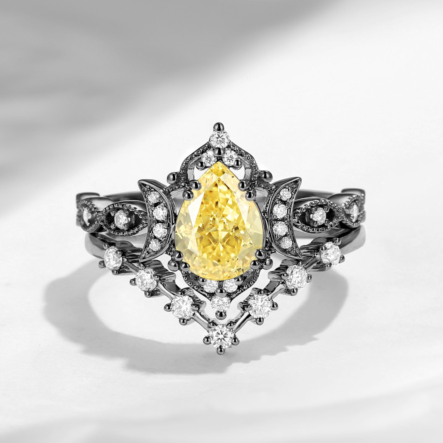 Crescent Moon | Pear Cut Yellow Lab Diamond Galaxy Engagement Ring Set 2pcs