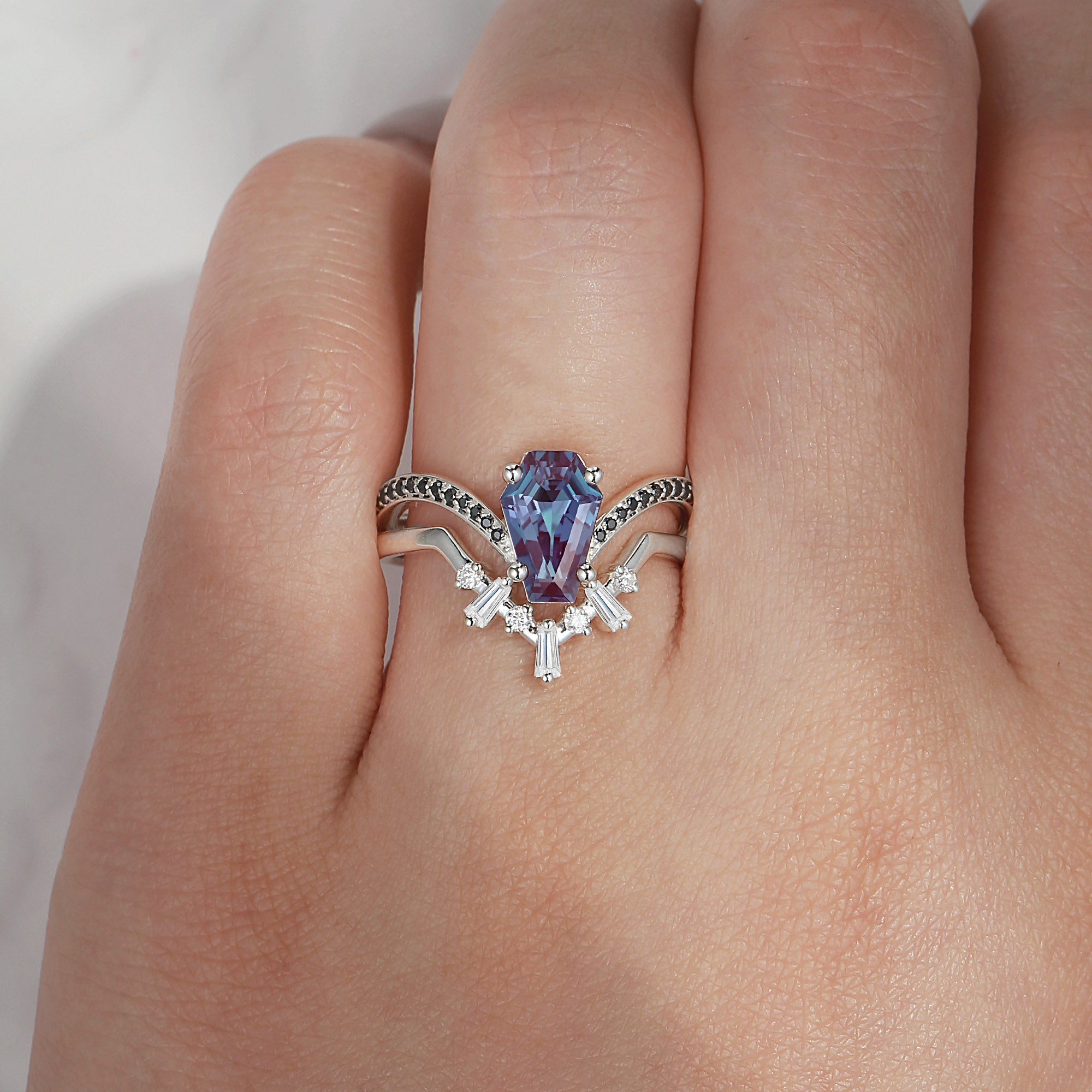 Vintage Coffin Cut Lab Alexandrite Curved Bridal Set 2pcs