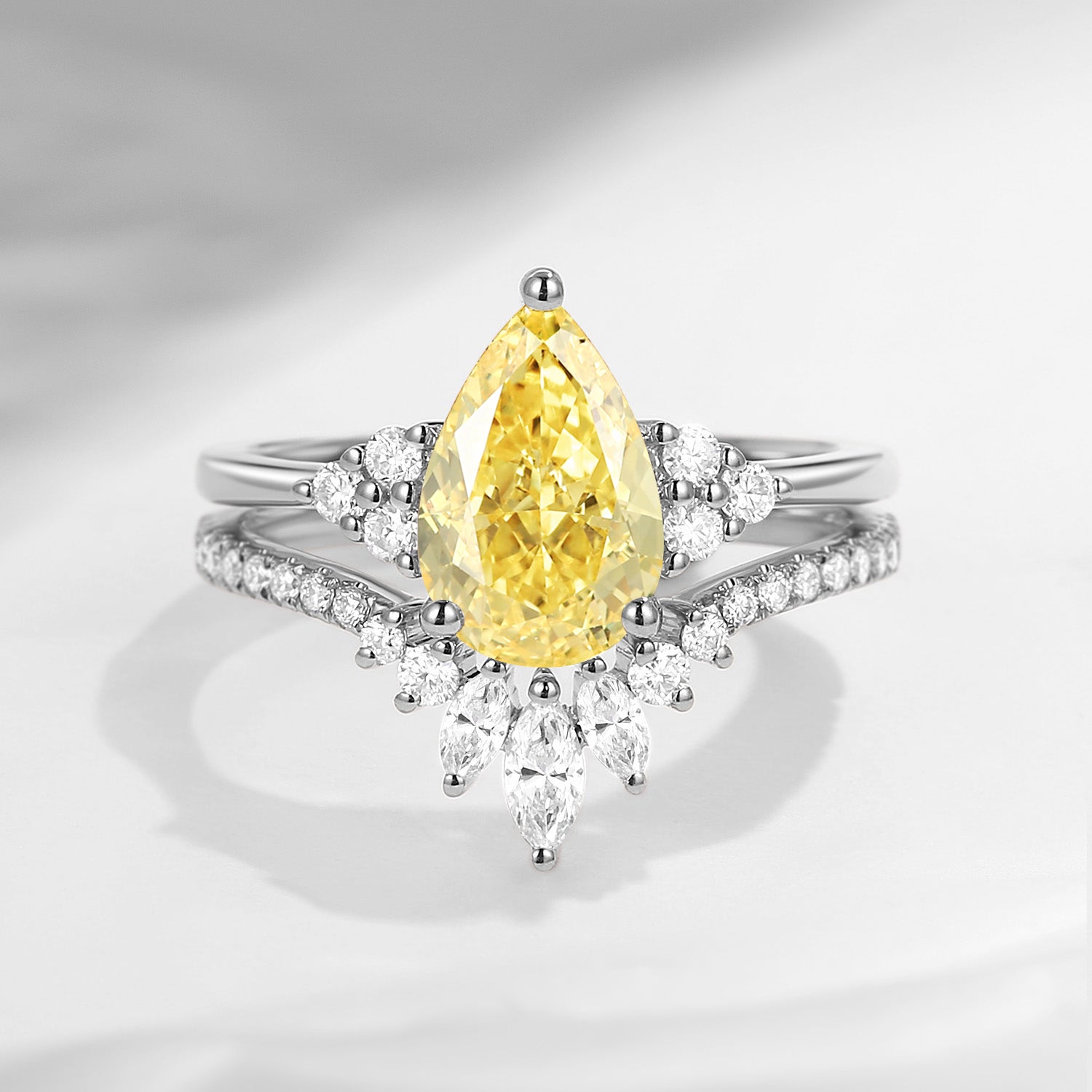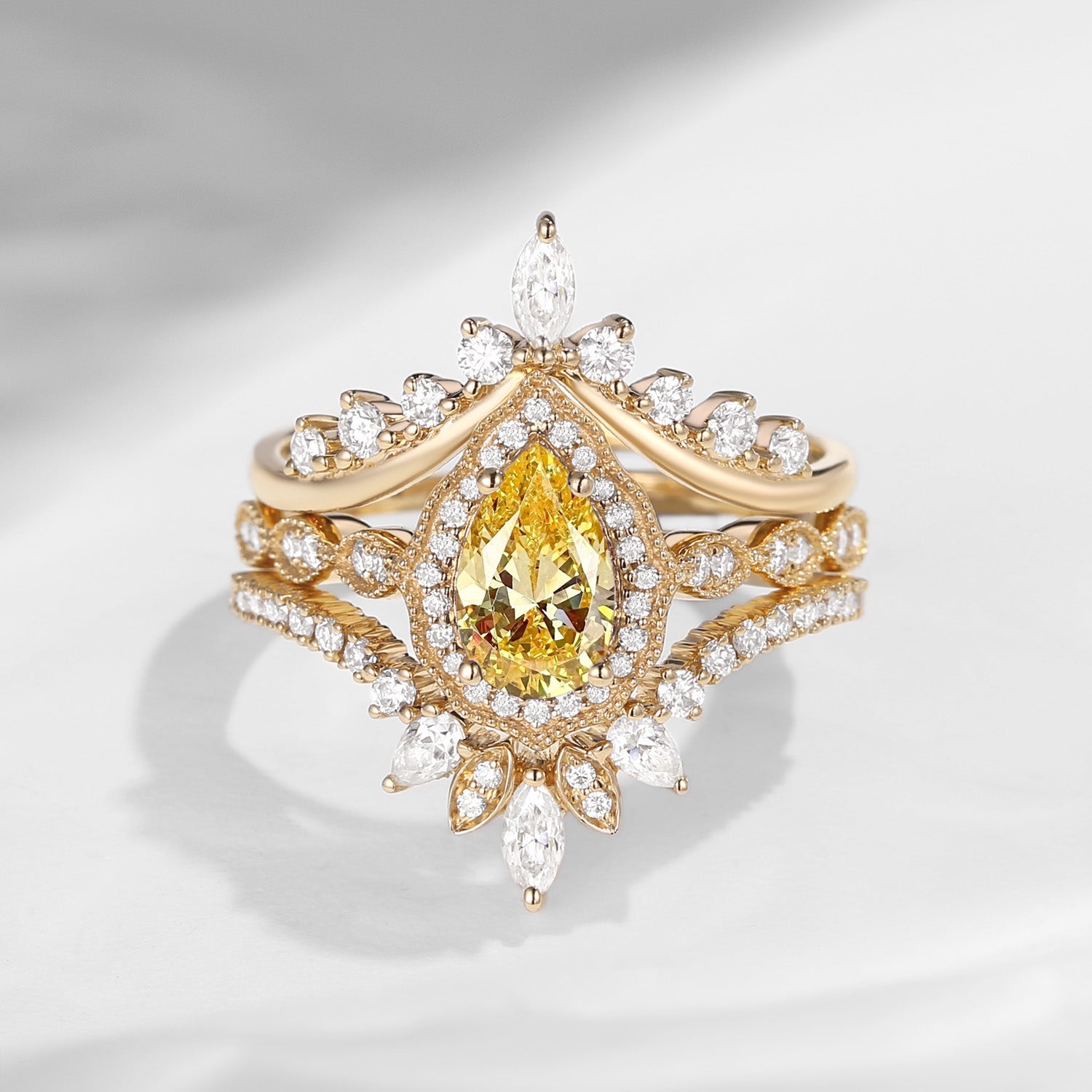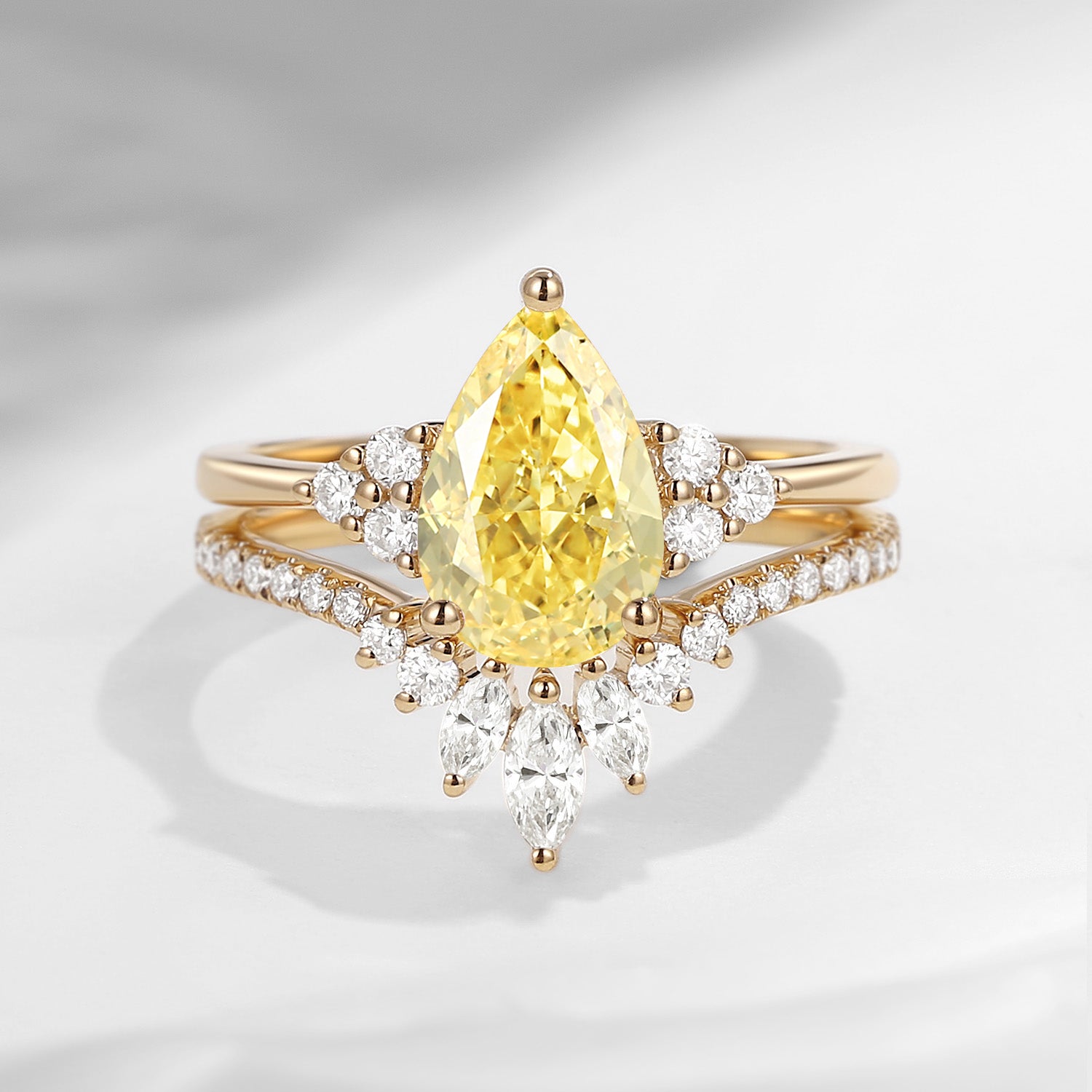 Pear Cut Yellow Lab Diamond Cluster Engagement Ring Set 2pcs - Vivian