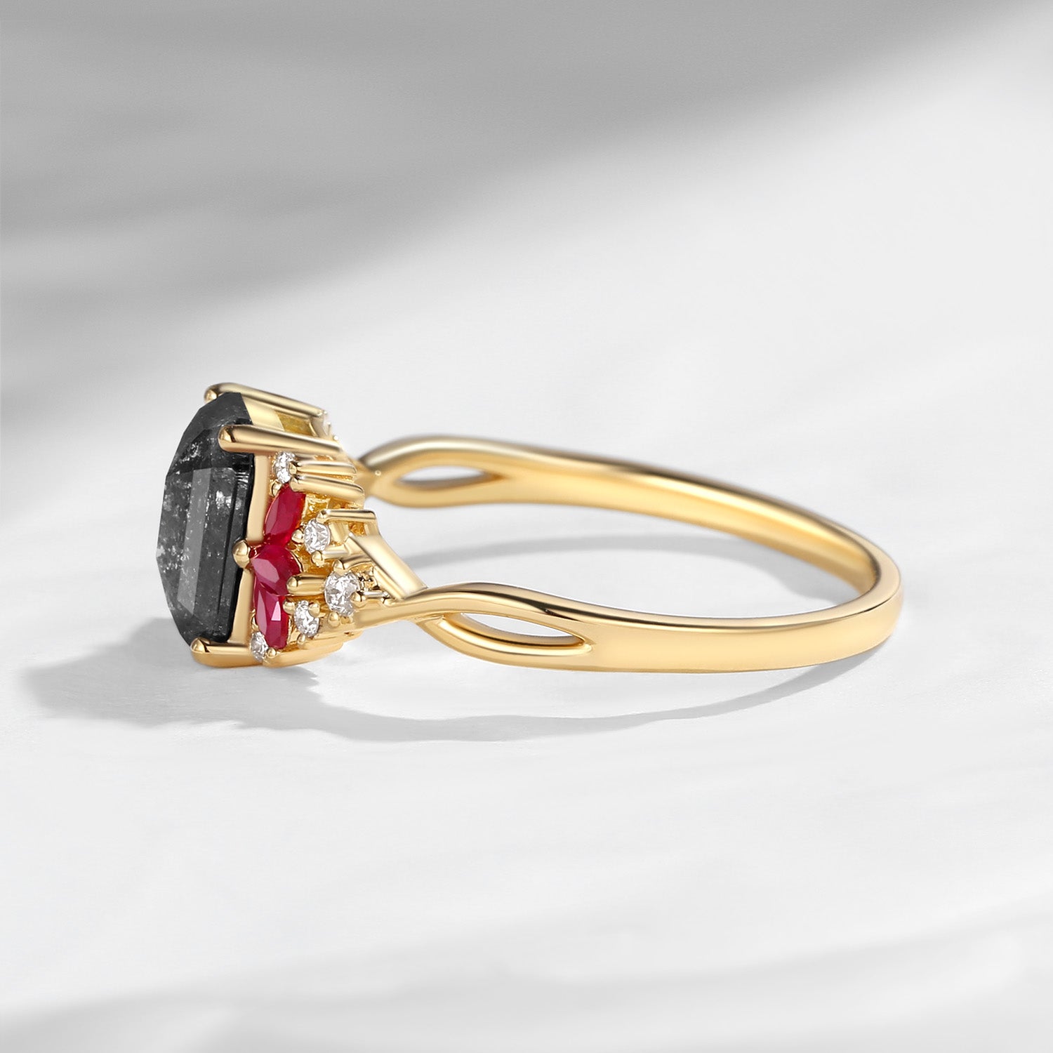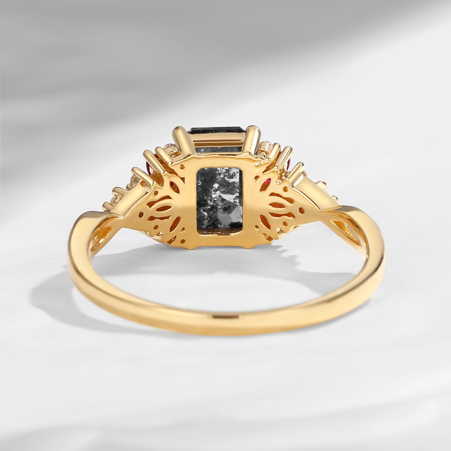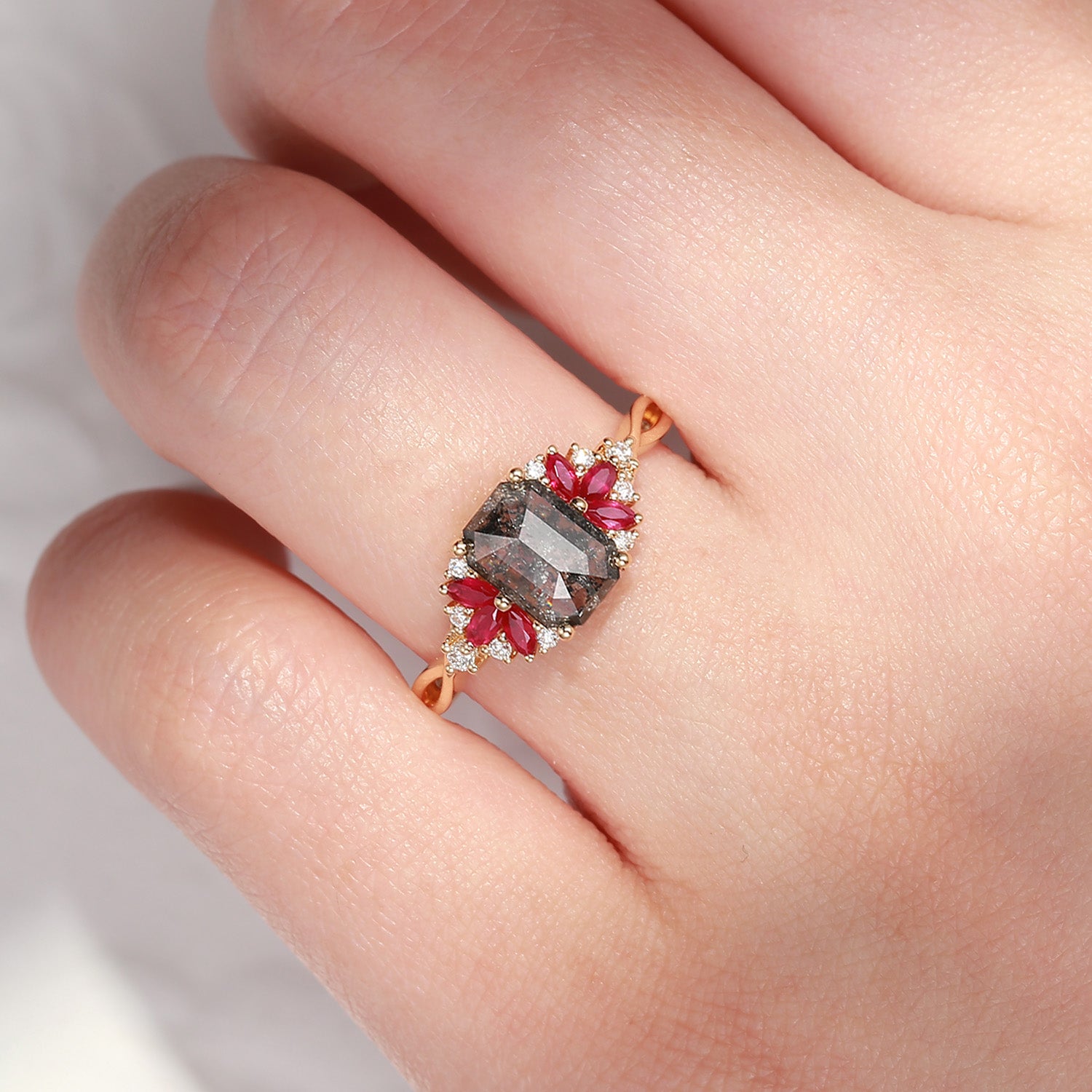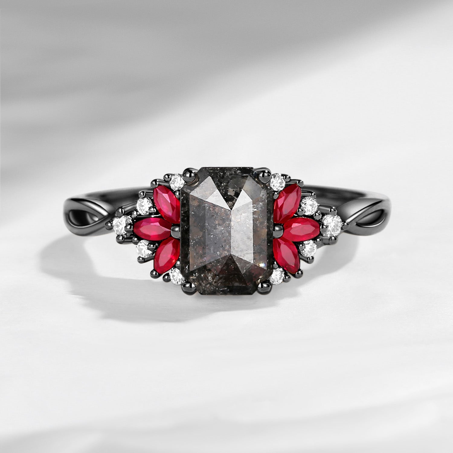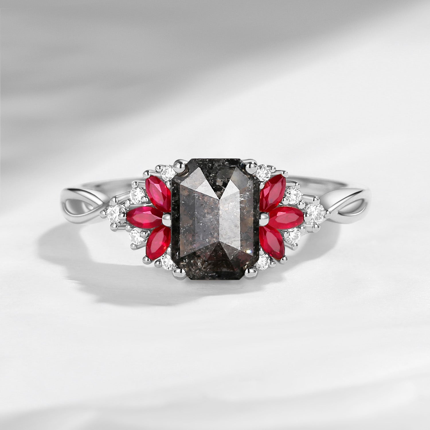Cluster Emerald Cut Salt And Pepper Diamond & Ruby Twist Engagement Ring