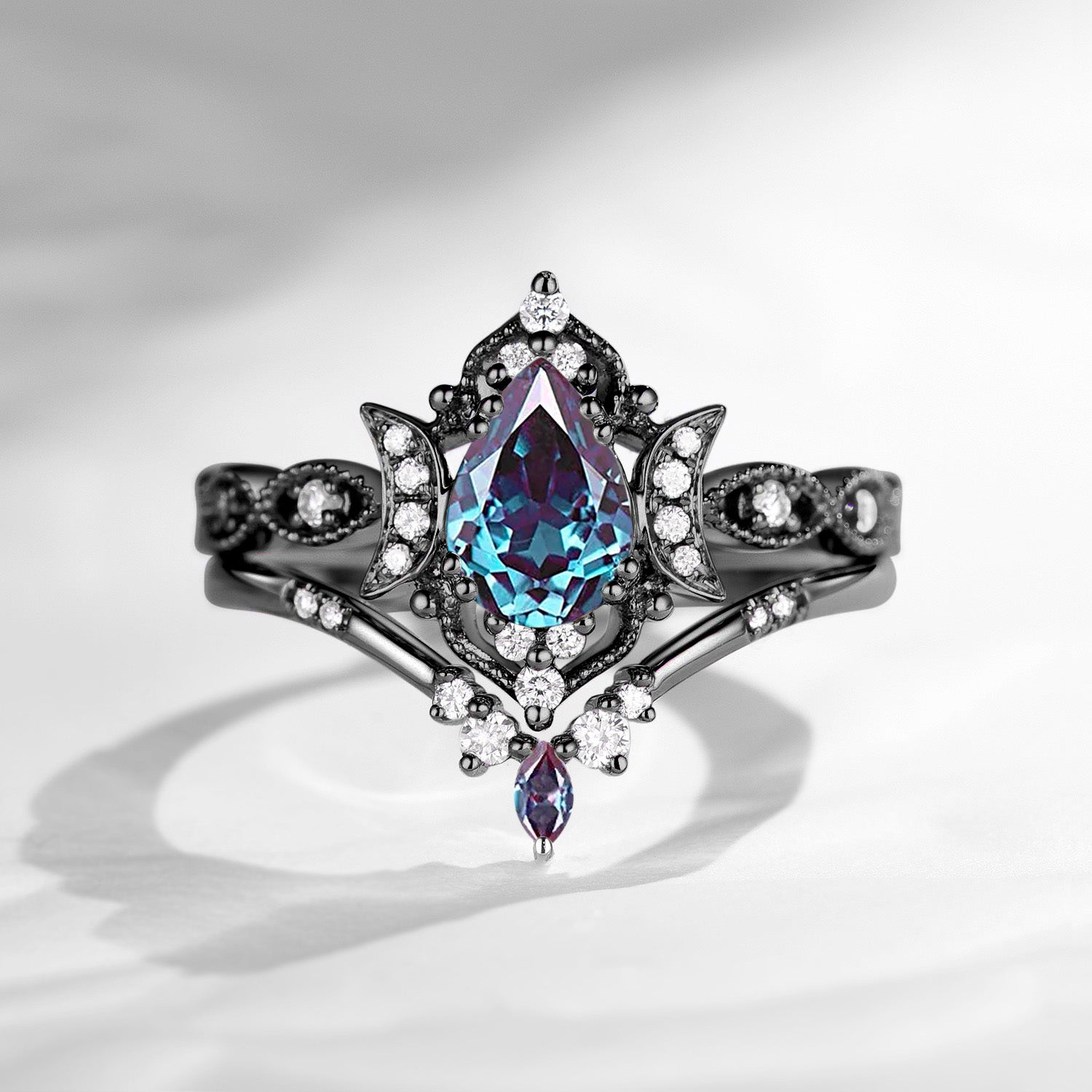 Crescent Moon | Pear Cut Moss Agate 'Ultra Galaxy' Black Gold Engagement Ring Set 2pcs