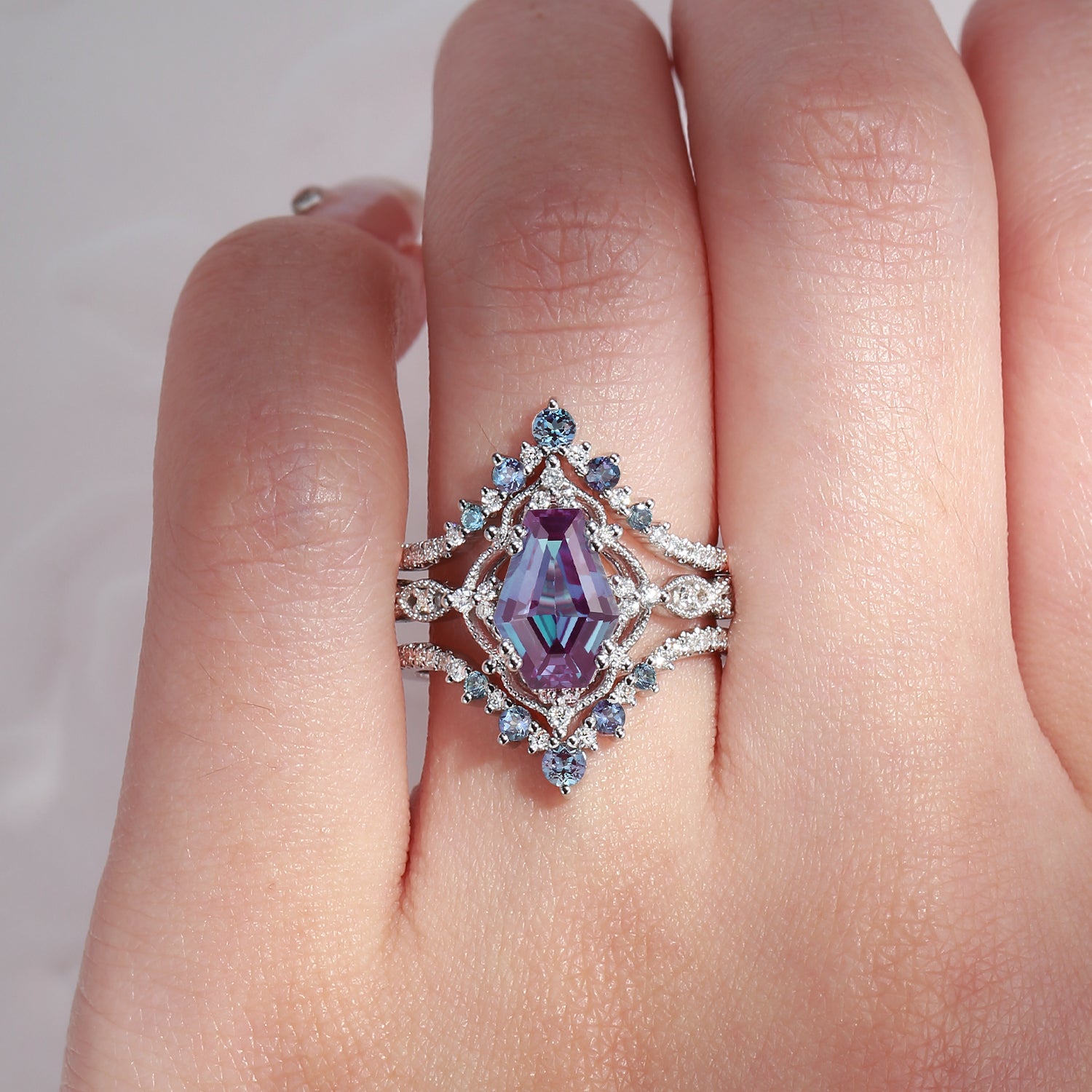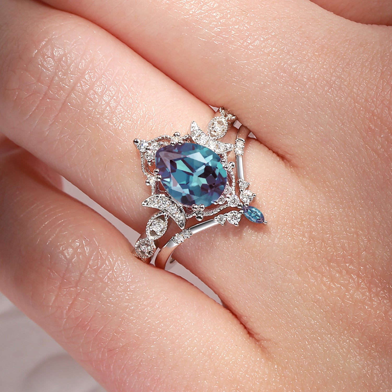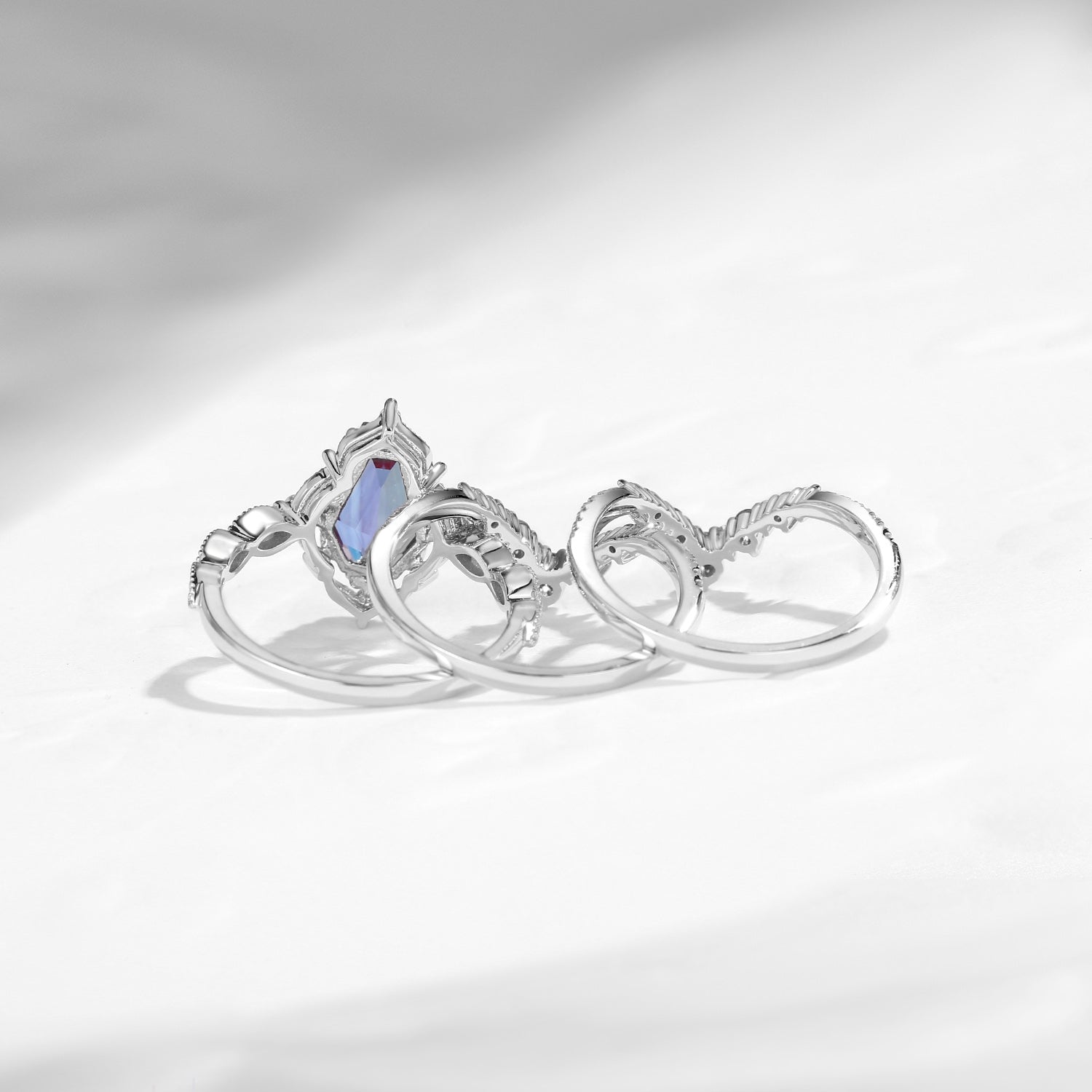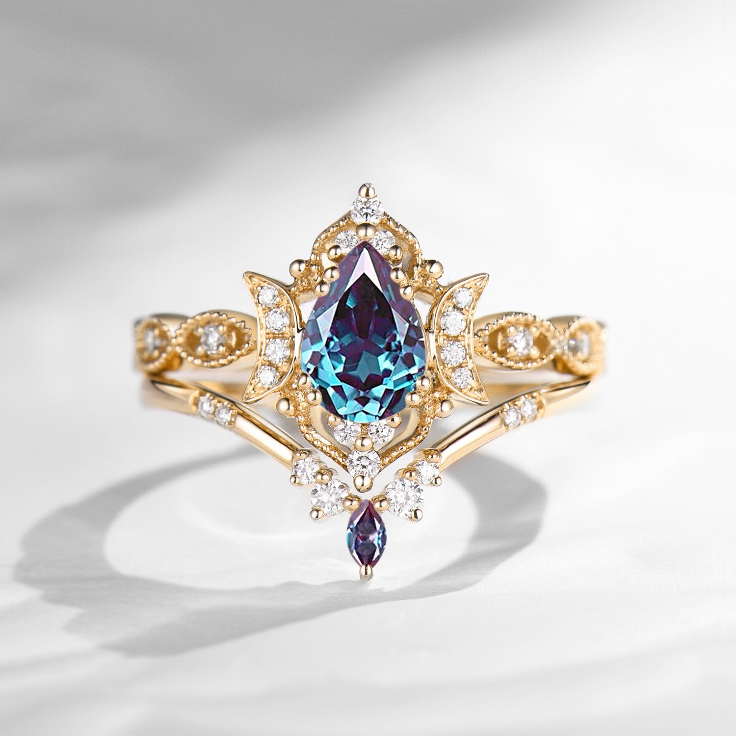 Crescent Moon | Blue Moonlight 18K Unique Alexandrite Engagement Ring Set 2pcs - Luna