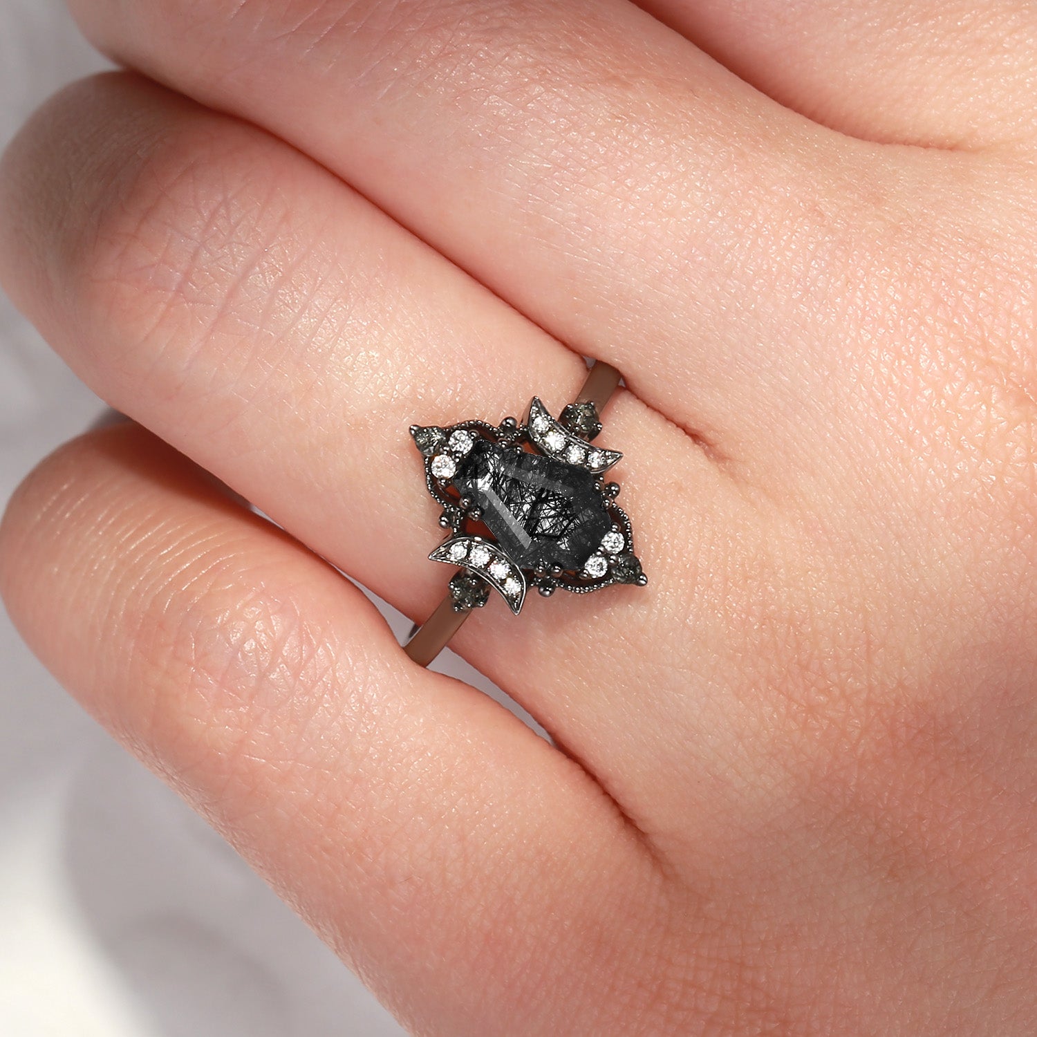 Crescent Moon | Vintage Style Coffin Cut Black Rutilated Quartz 'Evermore' Black Gold Engagement Ring