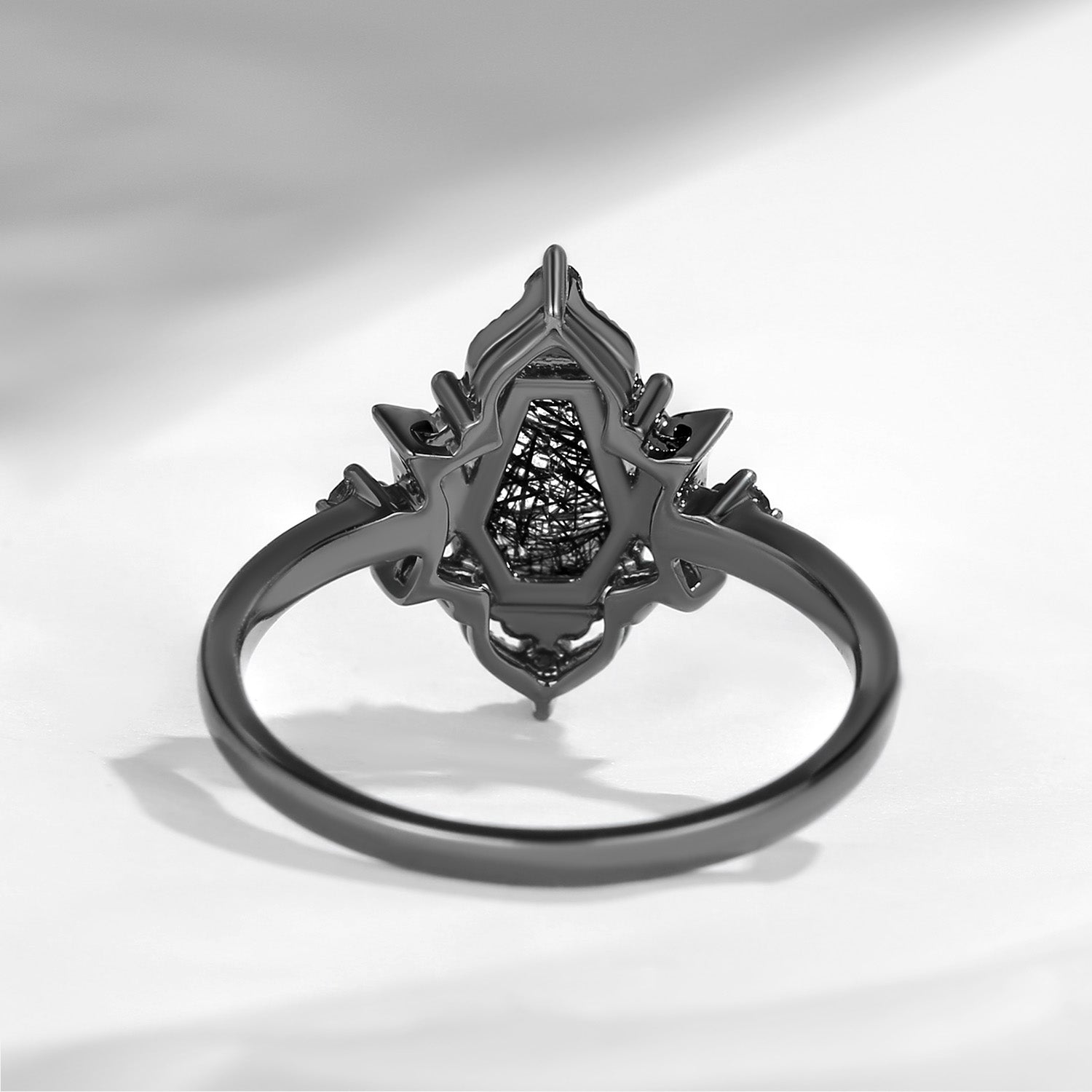 Classic Coffin Shaped Black Rutilated Quartz Black Gold Engagement Ring
