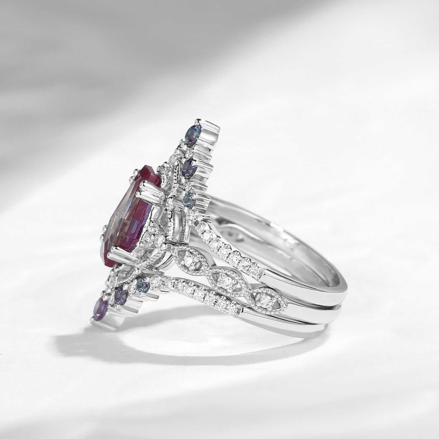 Coffin Cut Lab Alexandrite Vintage White Gold Bridal Set 2pcs - Bat Ring