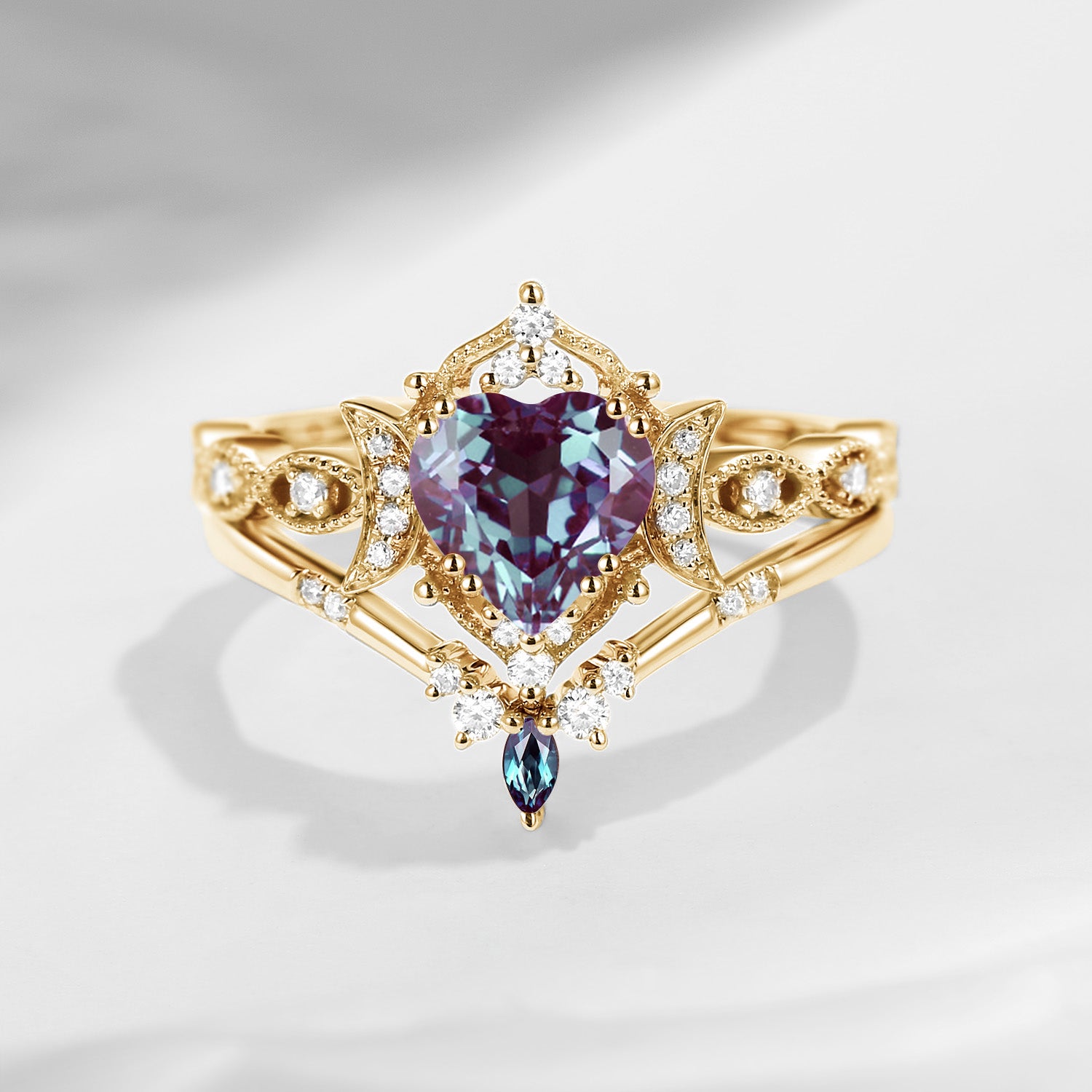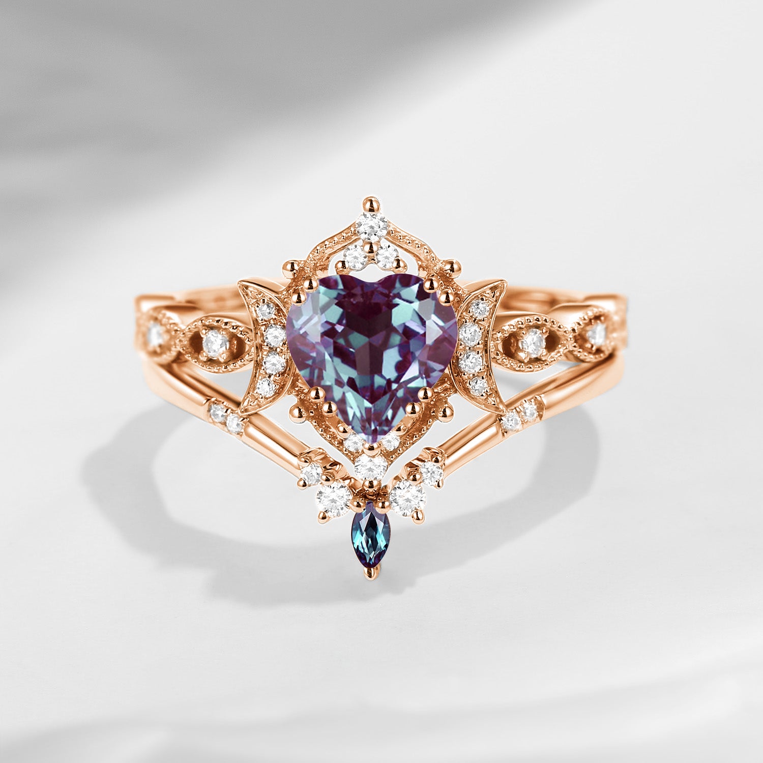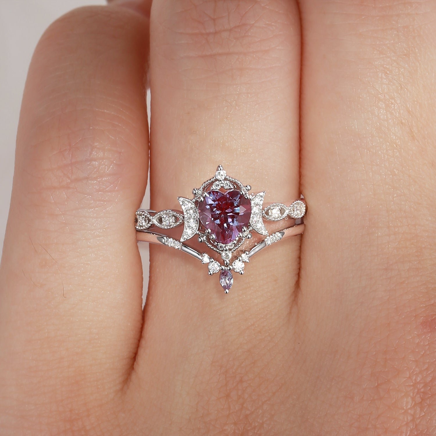 Crescent Moon | 18K Heart Shaped Lab Alexandrite Engagement Ring Set 2pcs - Luna