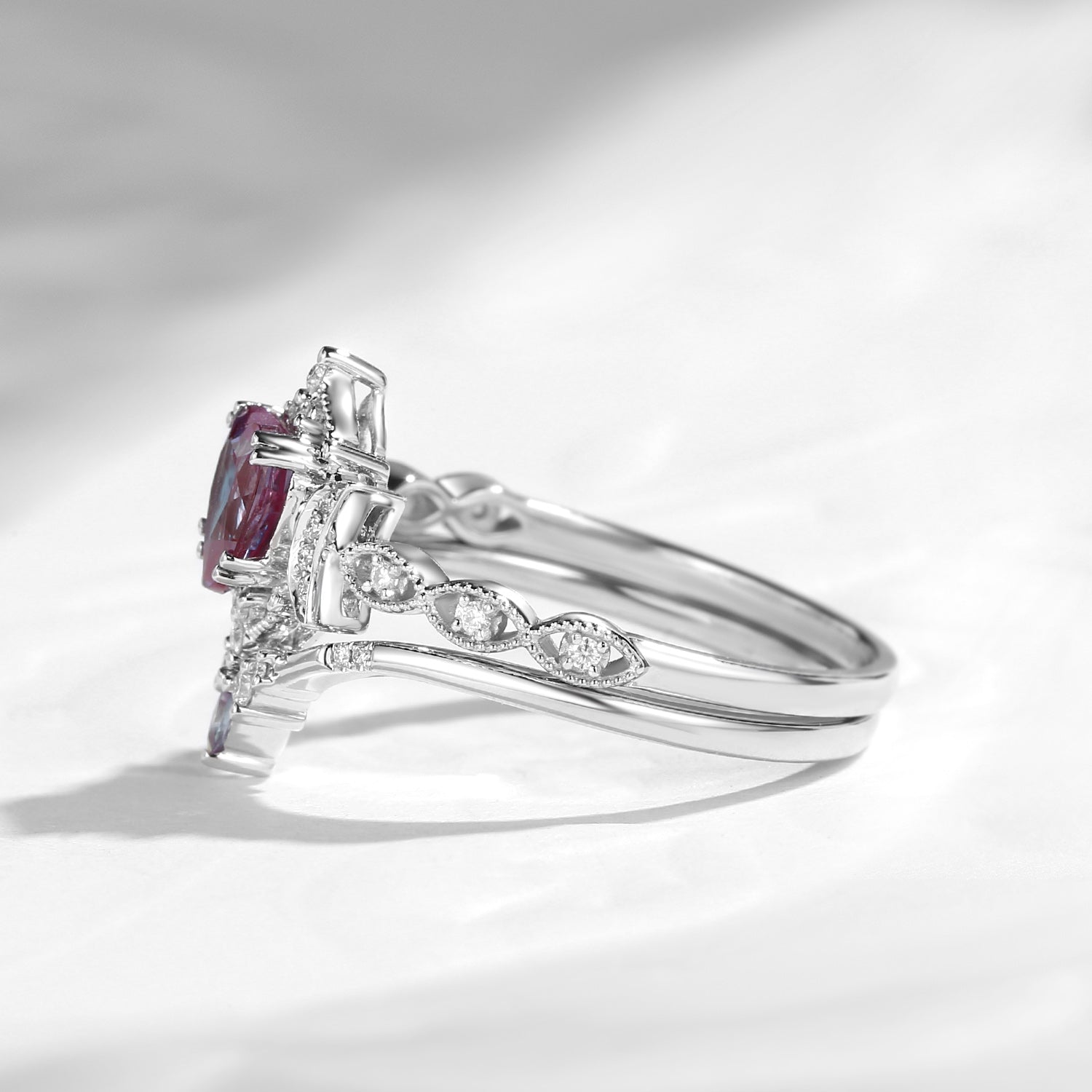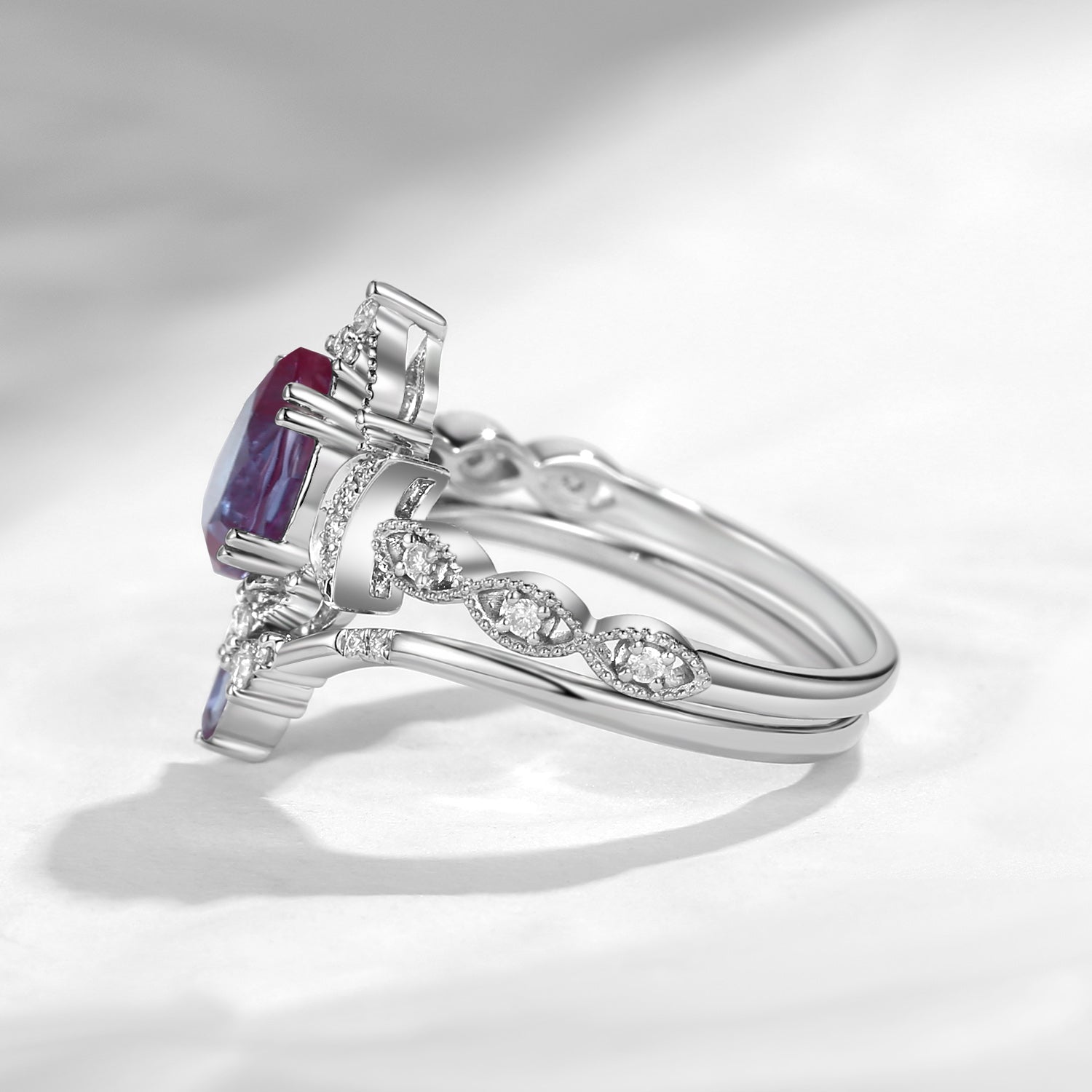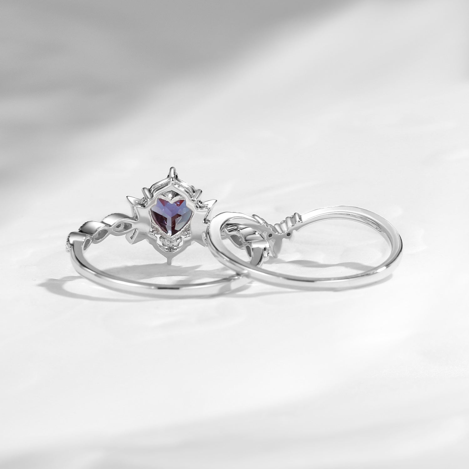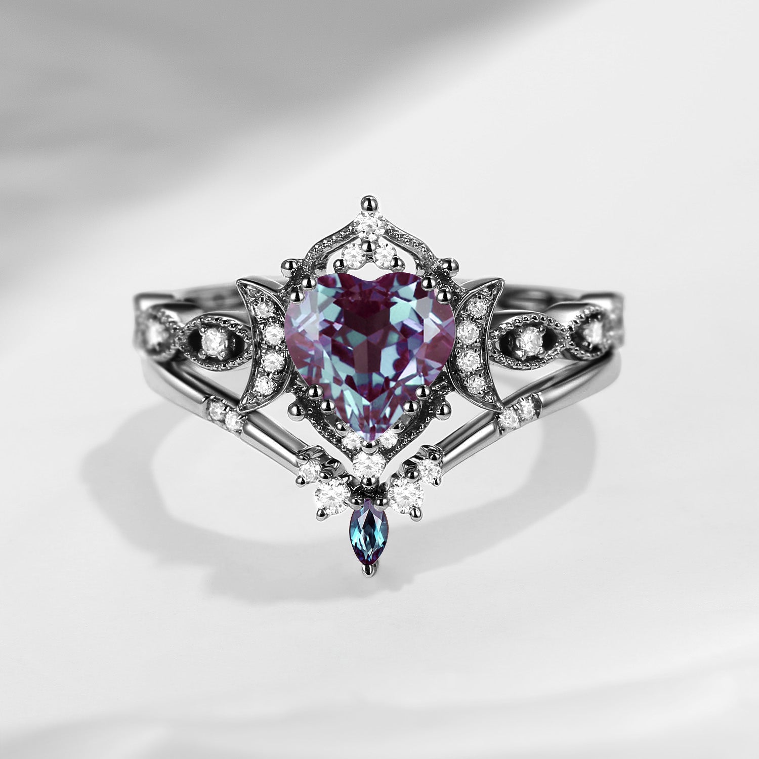 Crescent Moon | 18K Heart Shaped Lab Alexandrite Engagement Ring Set 2pcs - Luna