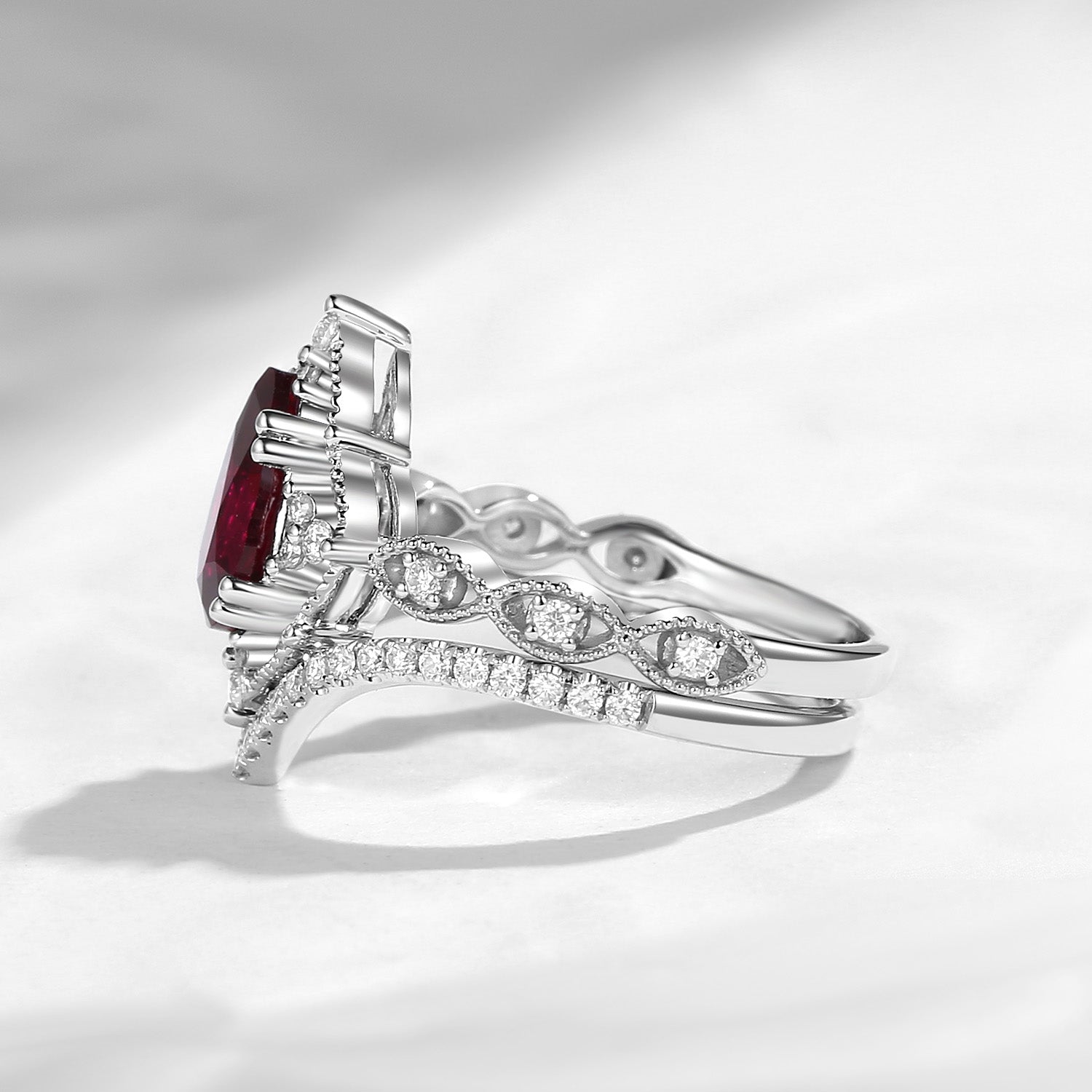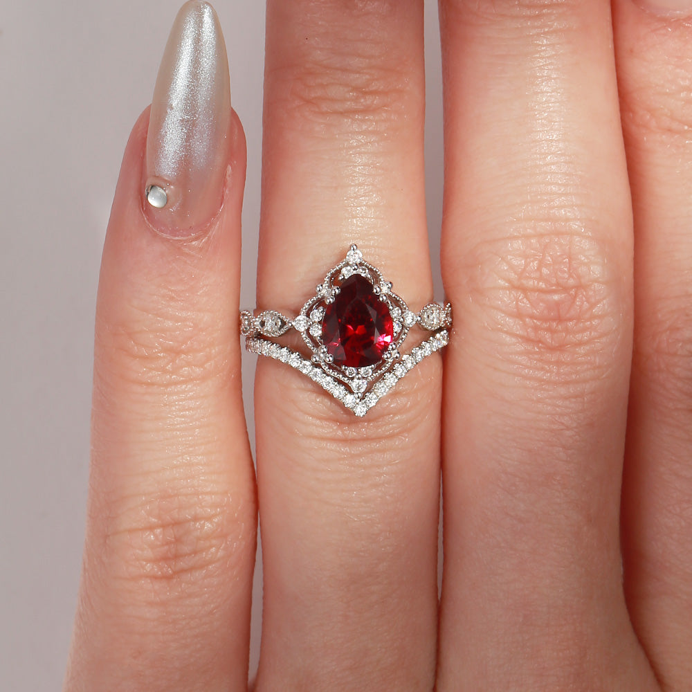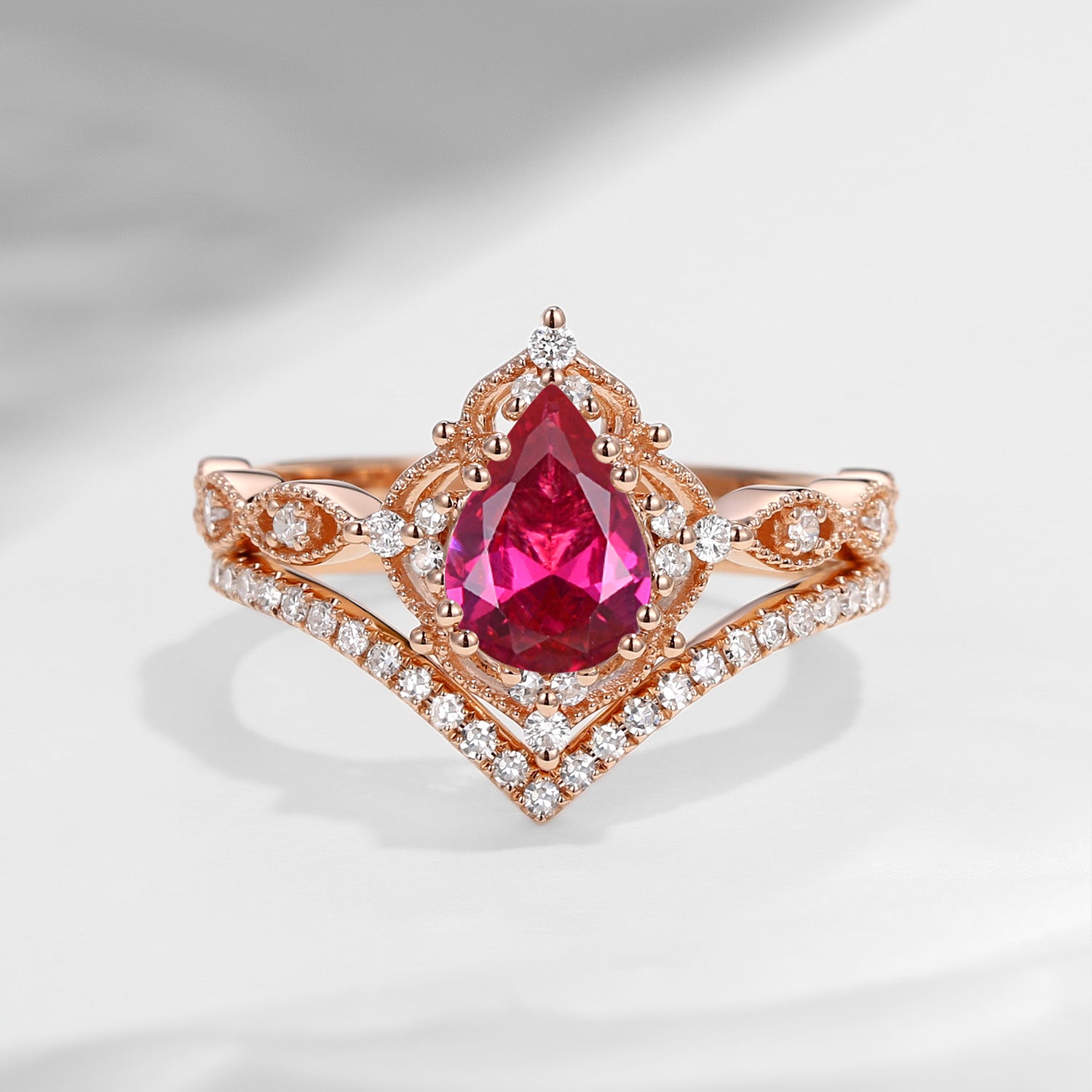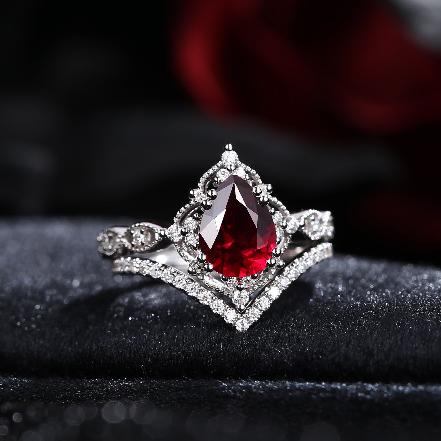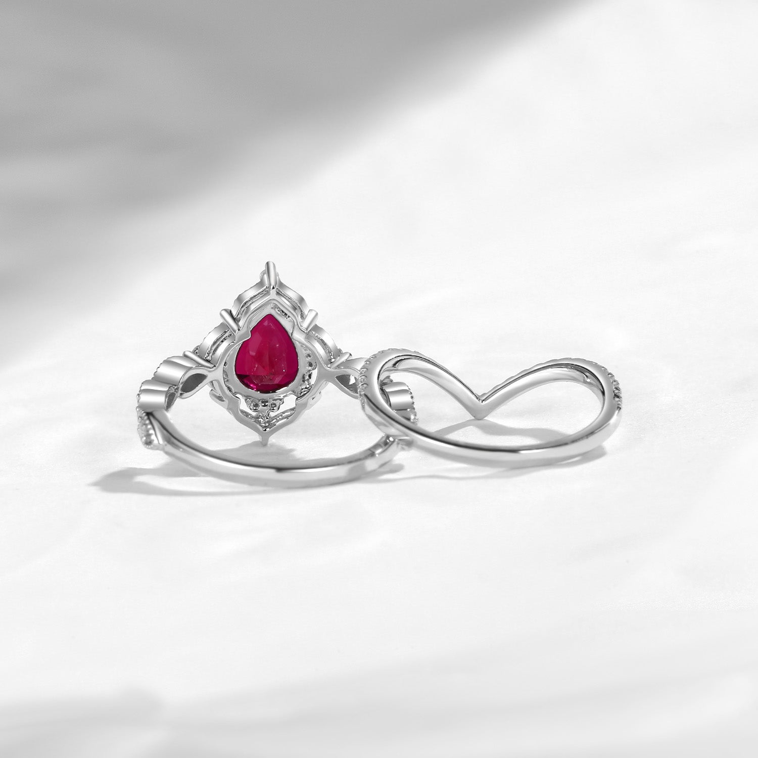 1.5ct Pear Shaped Lab Ruby Engagement Ring Set 2pcs - Evelyn