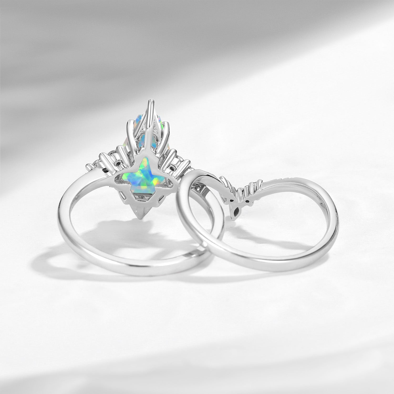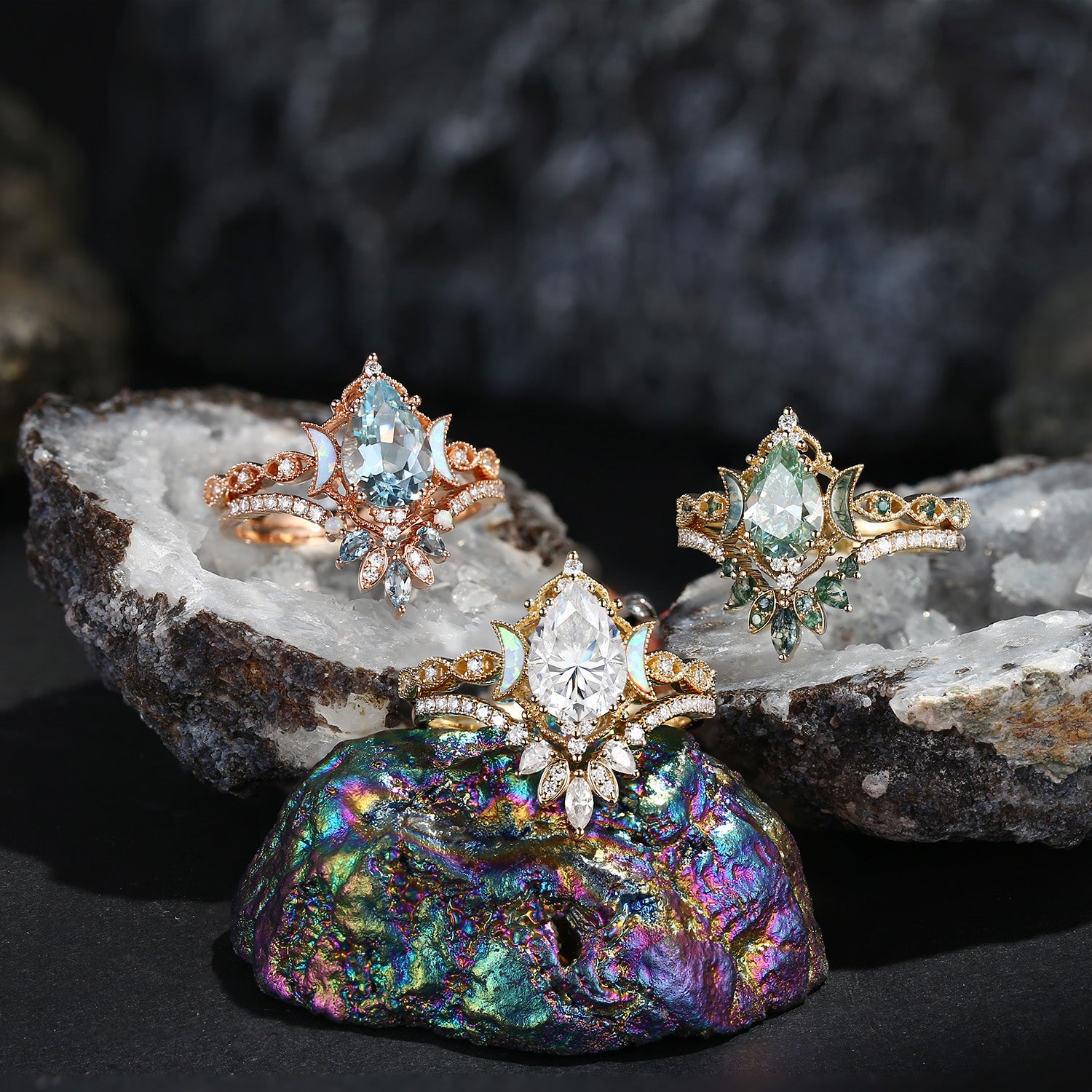 Crescent Moon | Pear Cut Lab Opal 'Ultra Galaxy' Engagement Ring Set 2pcs