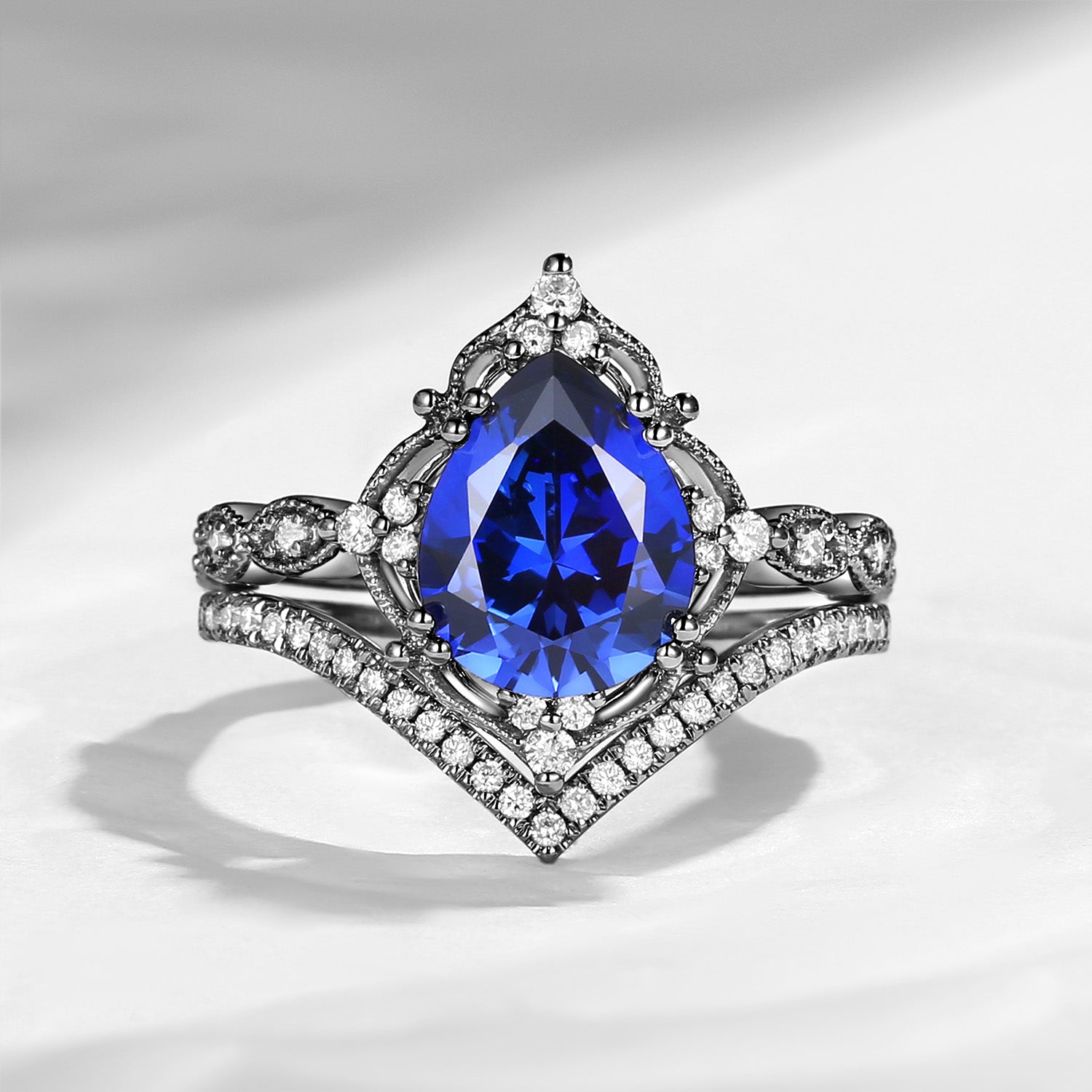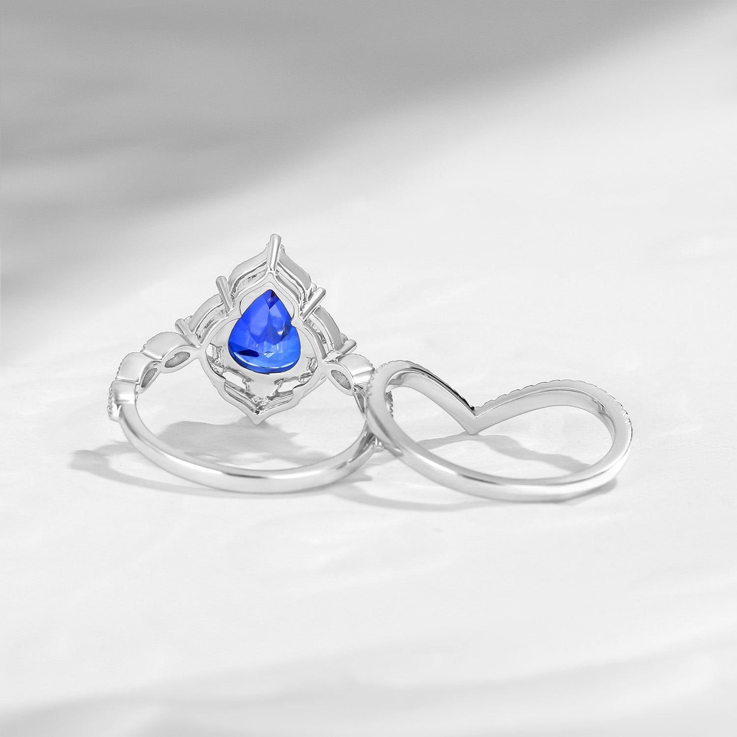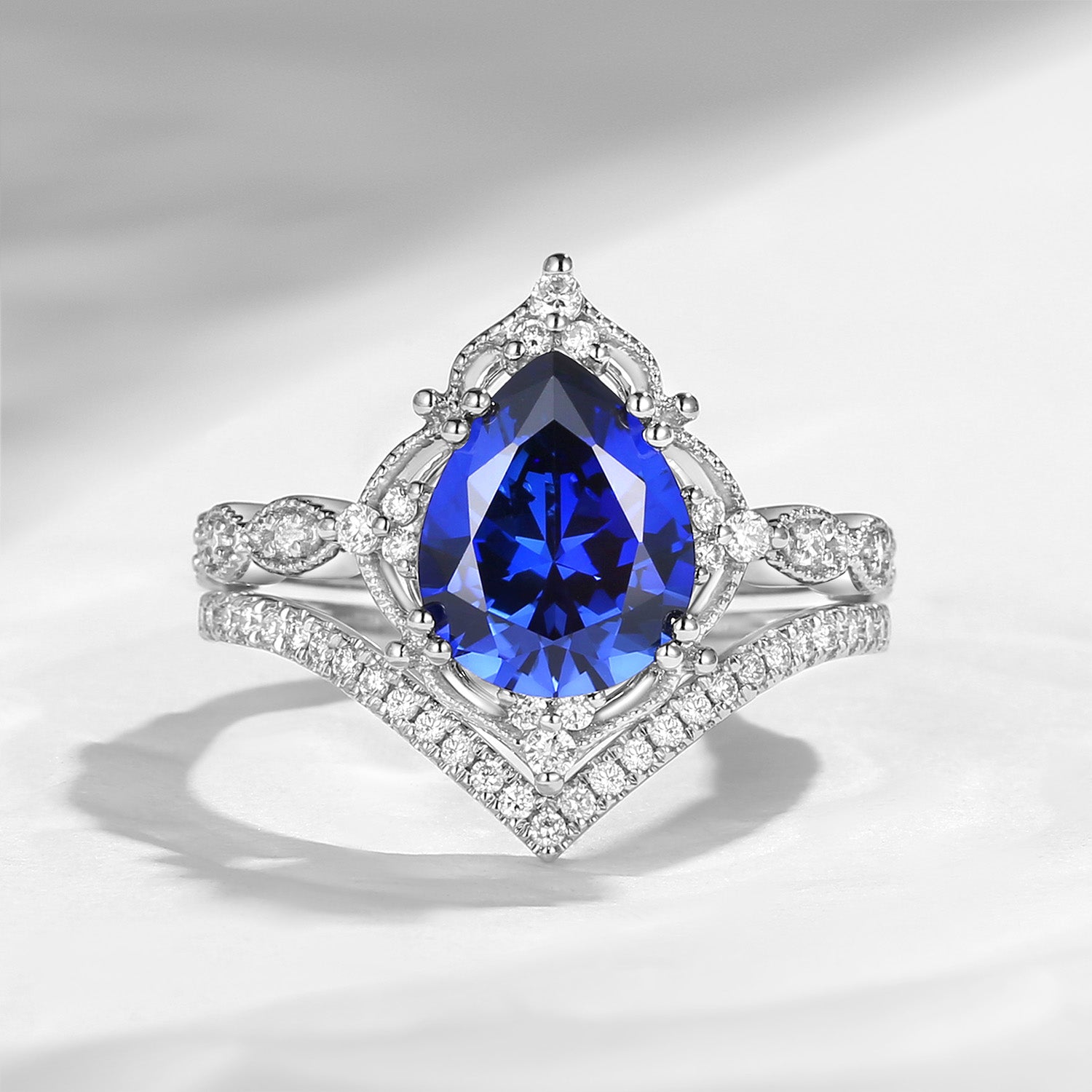 1.5ct Pear Shaped Lab Sapphire Engagement Ring Set 2pcs - Evelyn