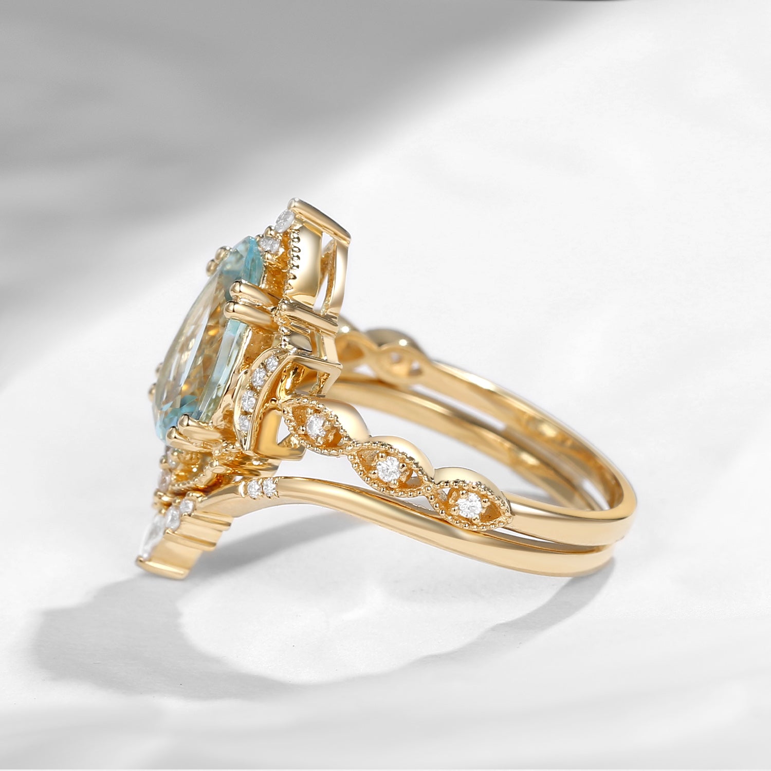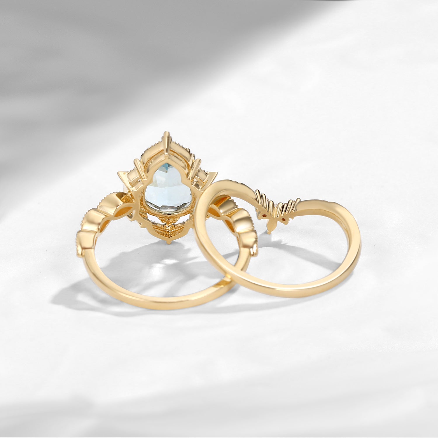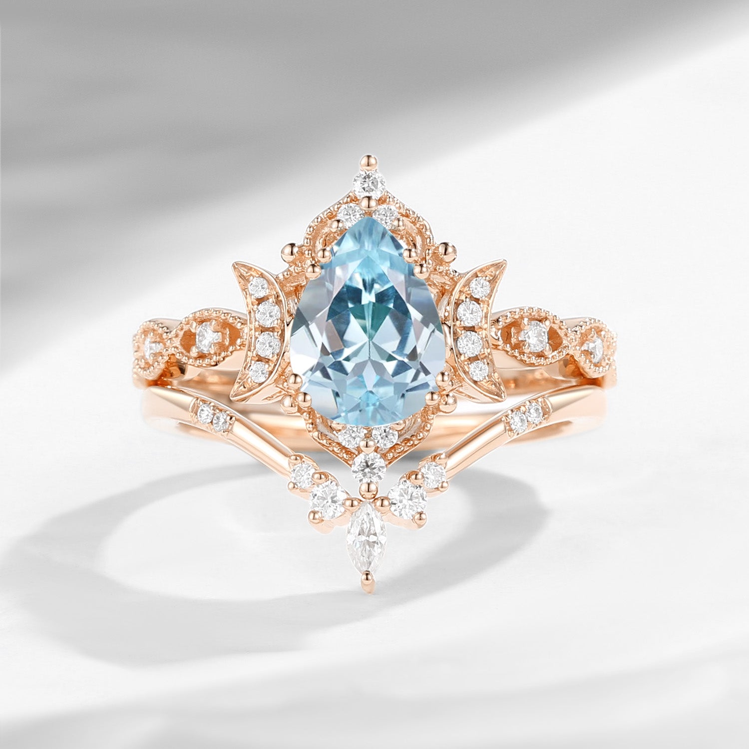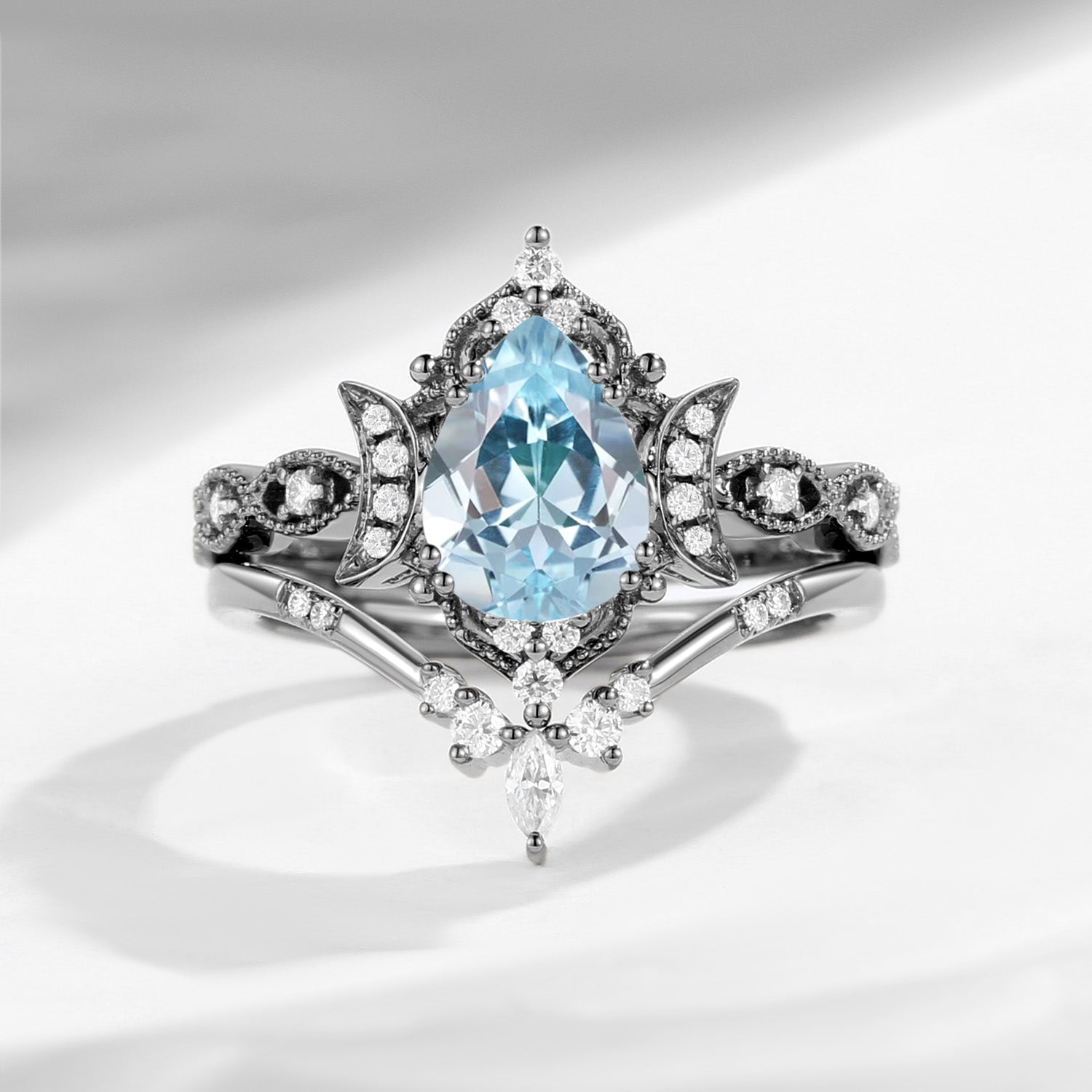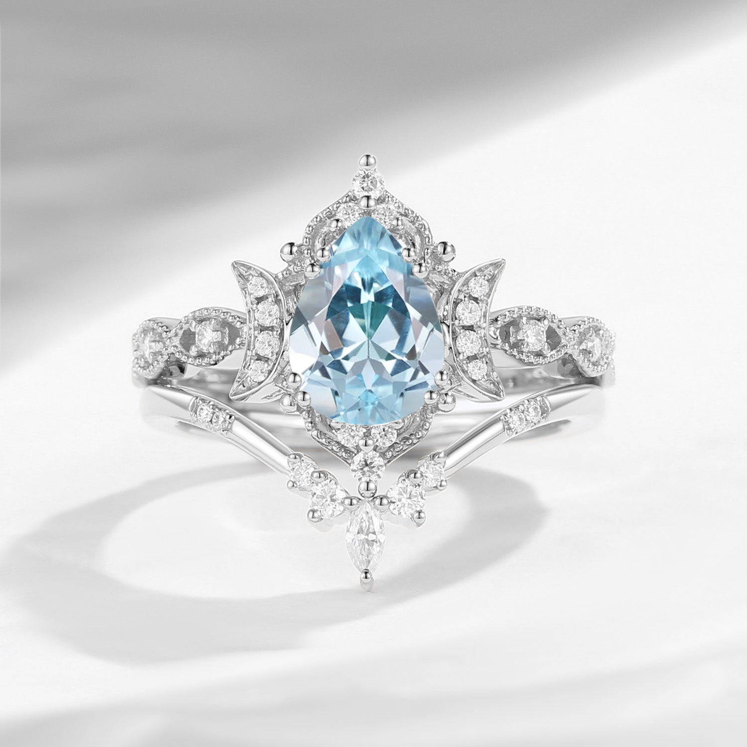 Crescent Moon | Pear Cut Natural Aquamarine Engagement Ring Sets 2pcs - Luna