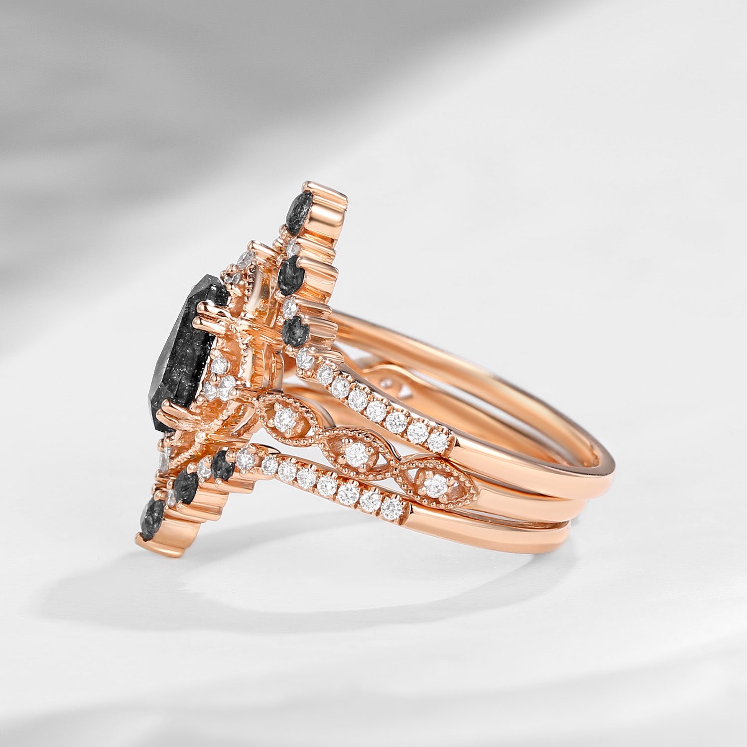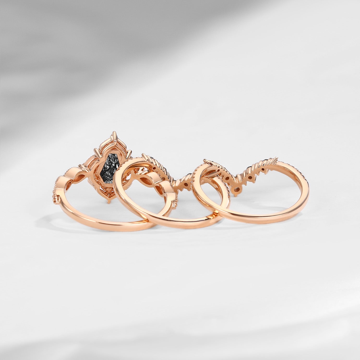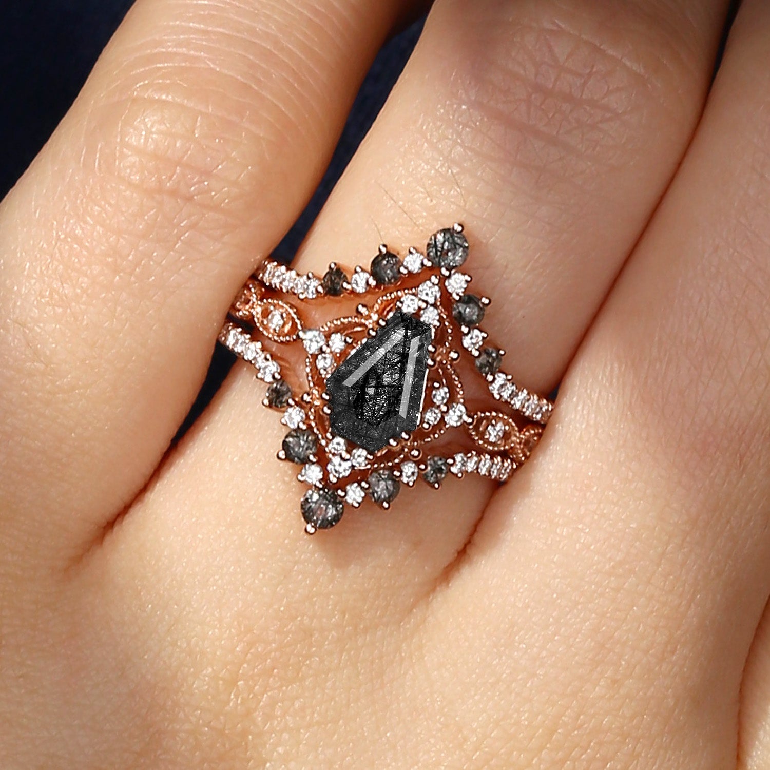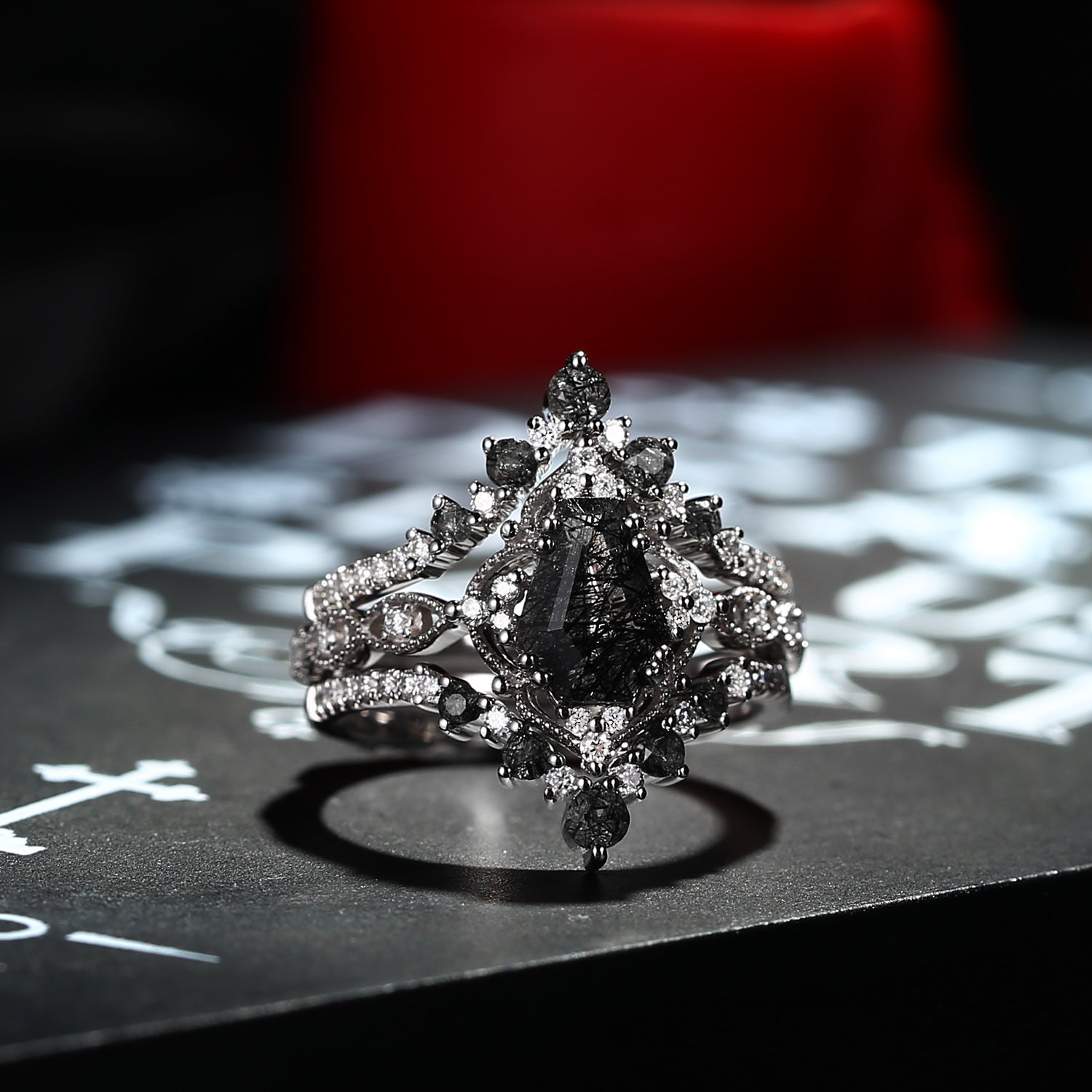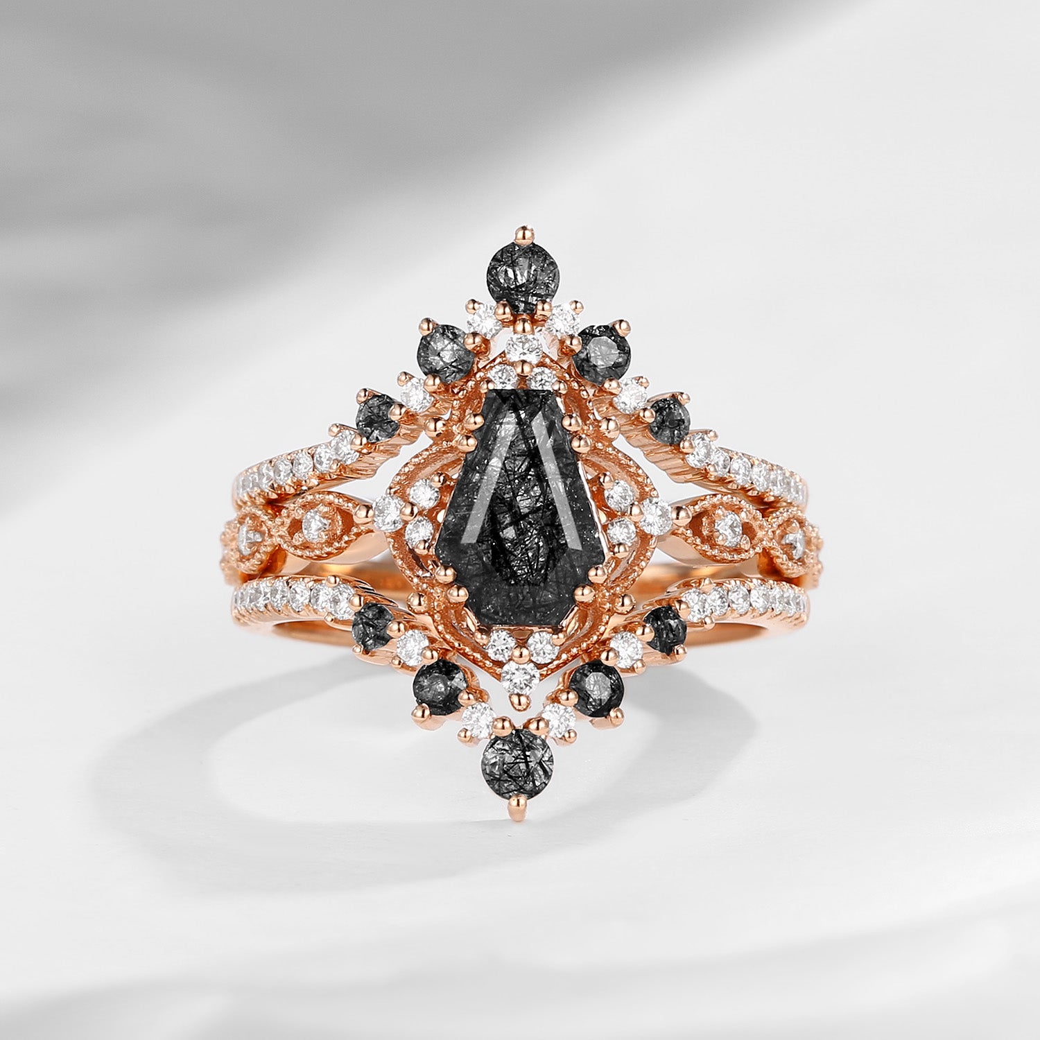 Vintage Inspired Coffin Cut Black Rutilated Quartz Ring Bridal Set 3pcs
