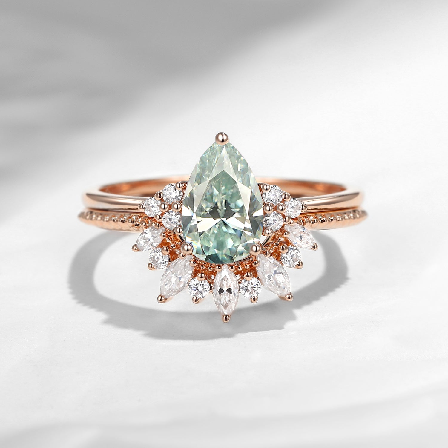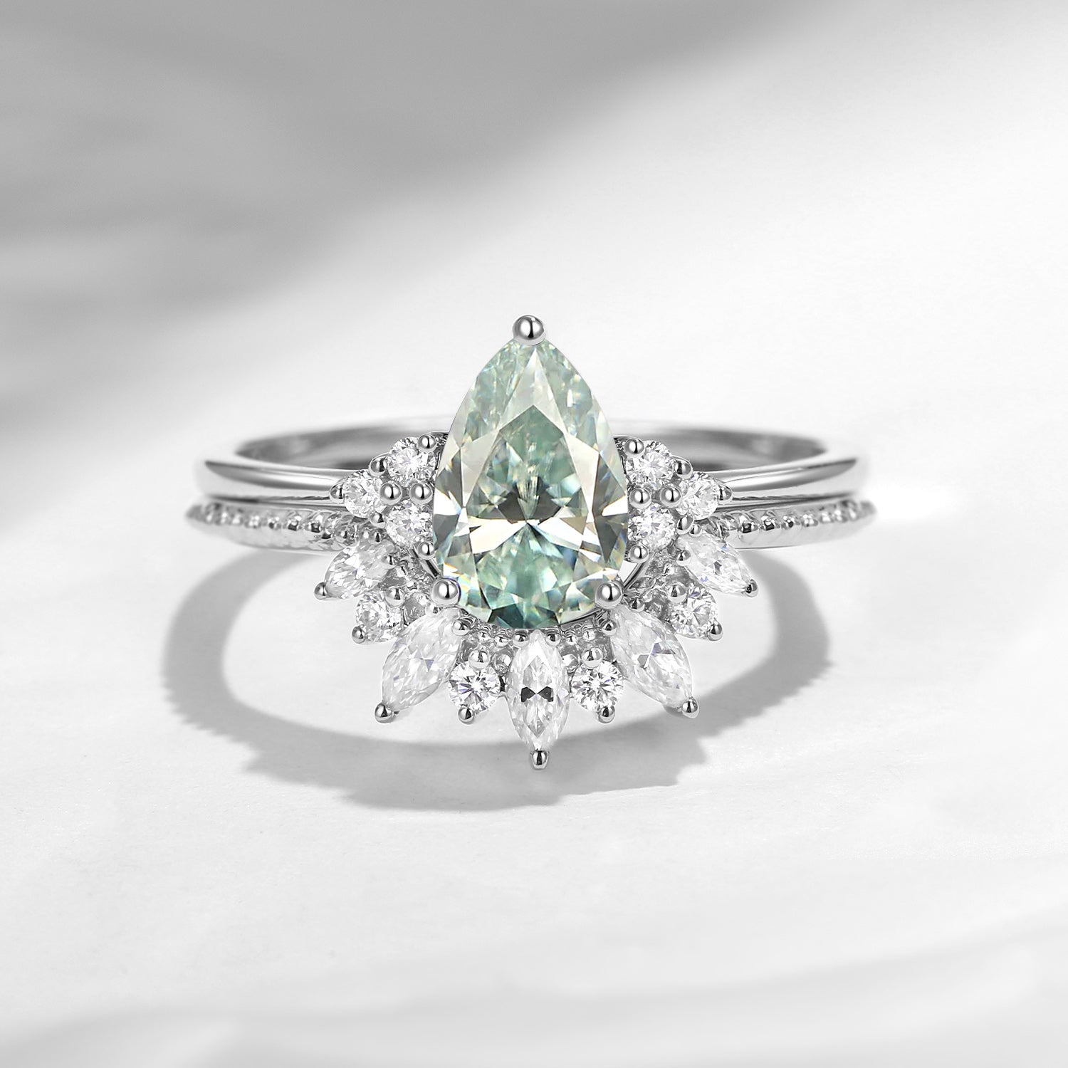 Cluster Pear Cut Mint Moissanite Engagement Halo Ring Set 2pcs
