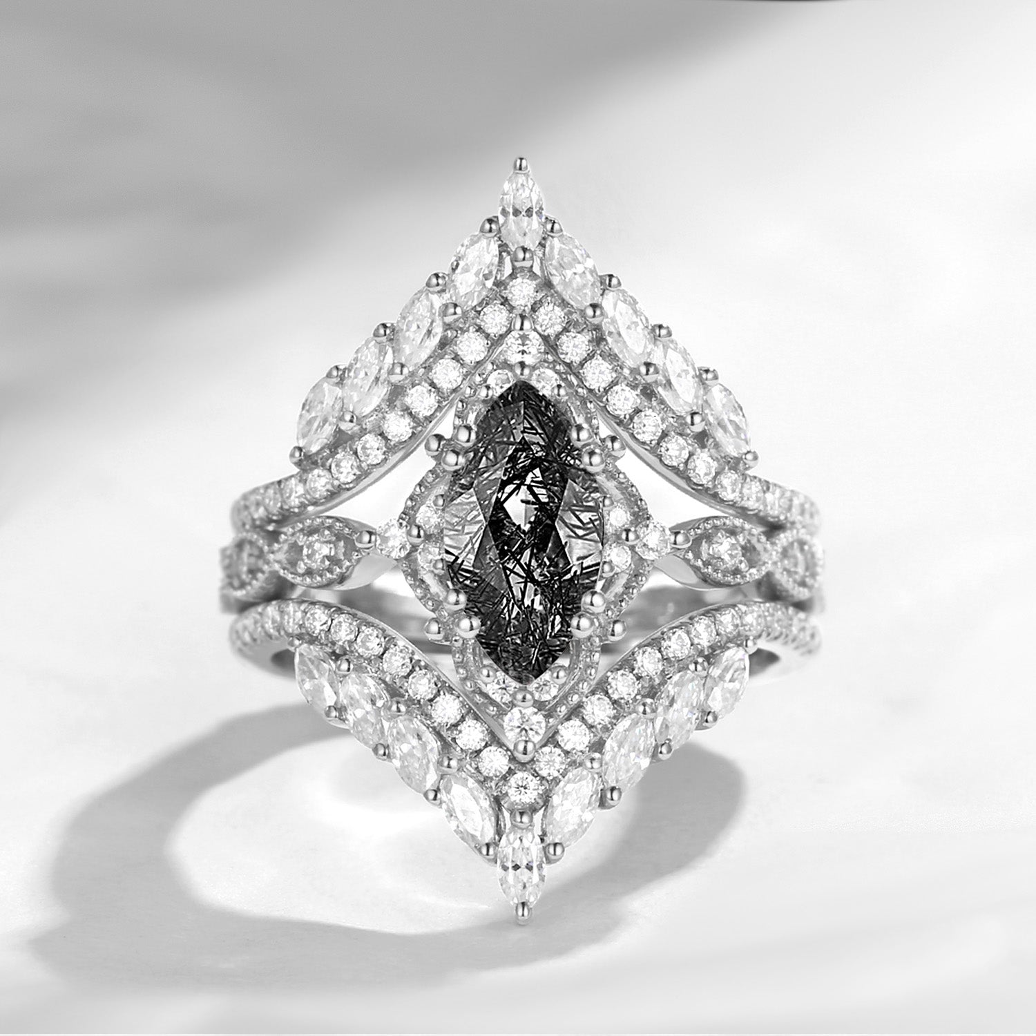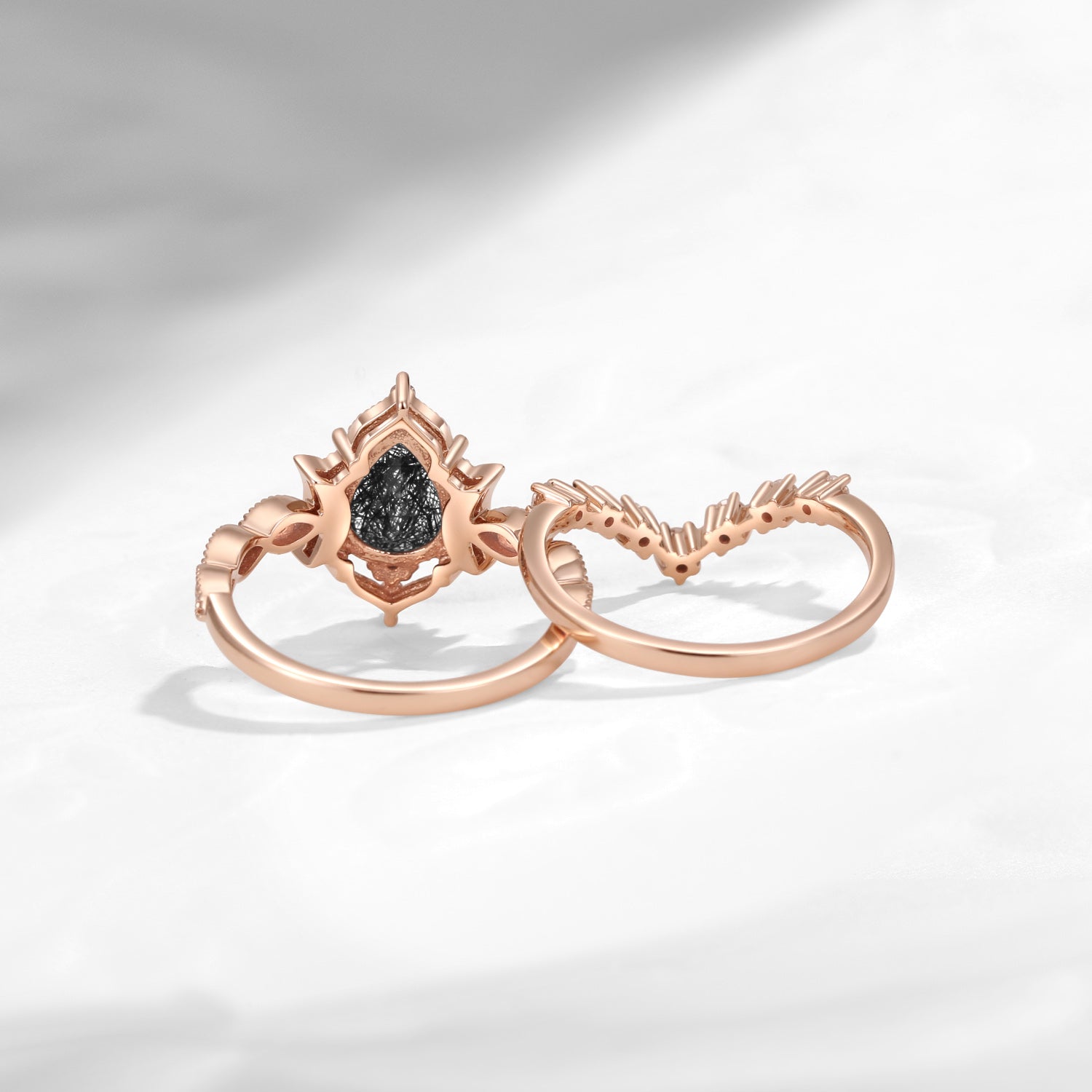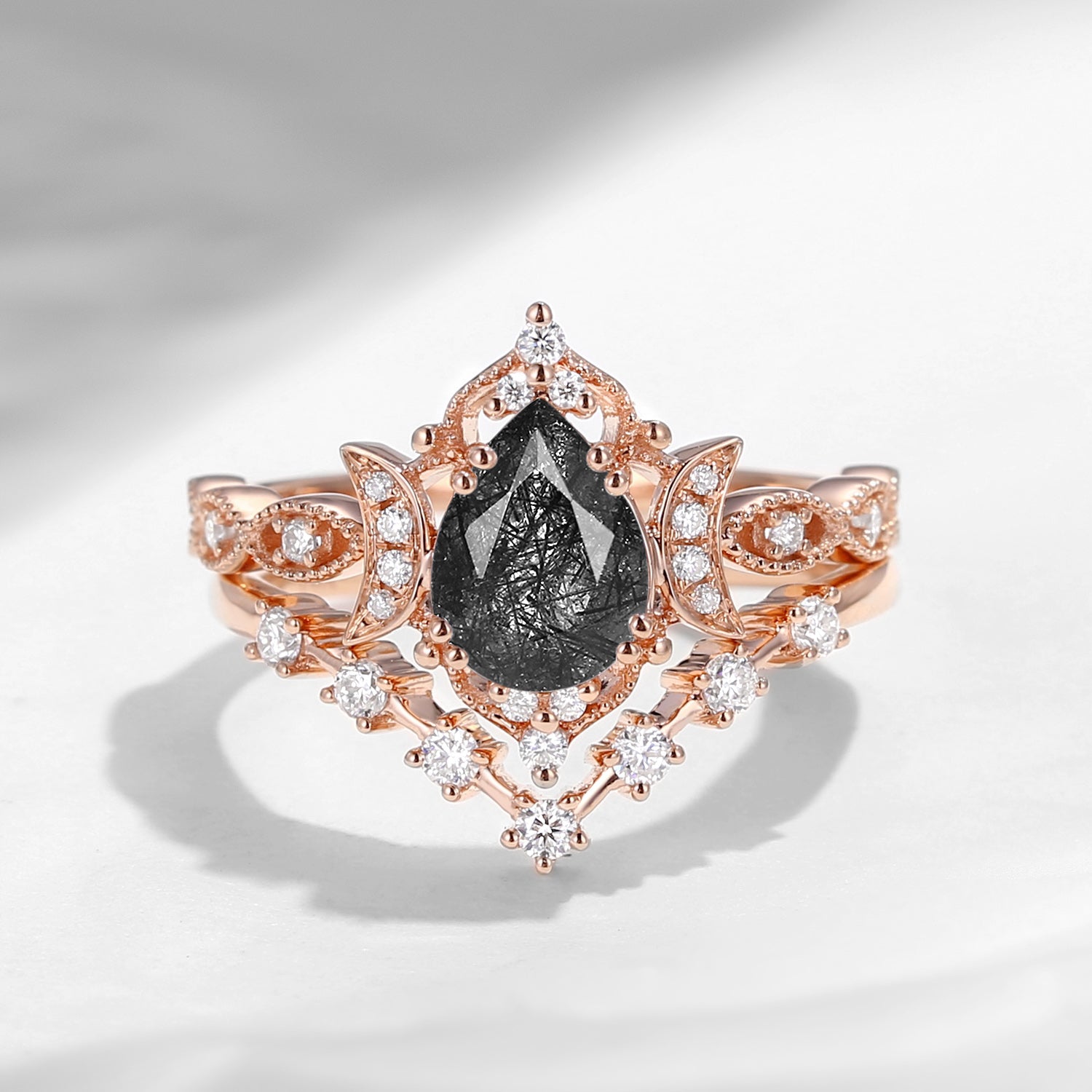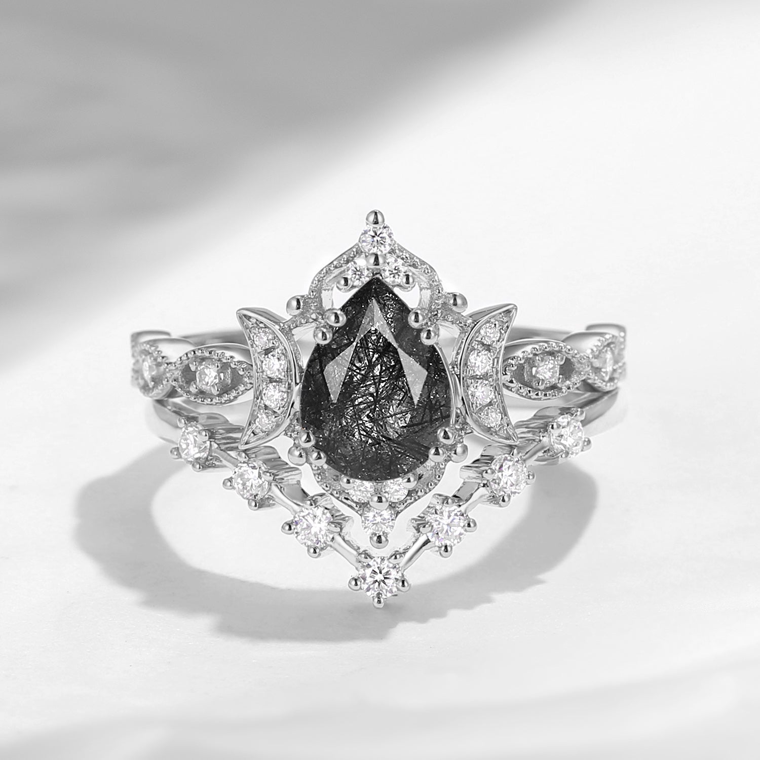 Crescent Moon | Pear Cut Black Rutilated Quartz Galaxy Engagement Ring Set 2PCS