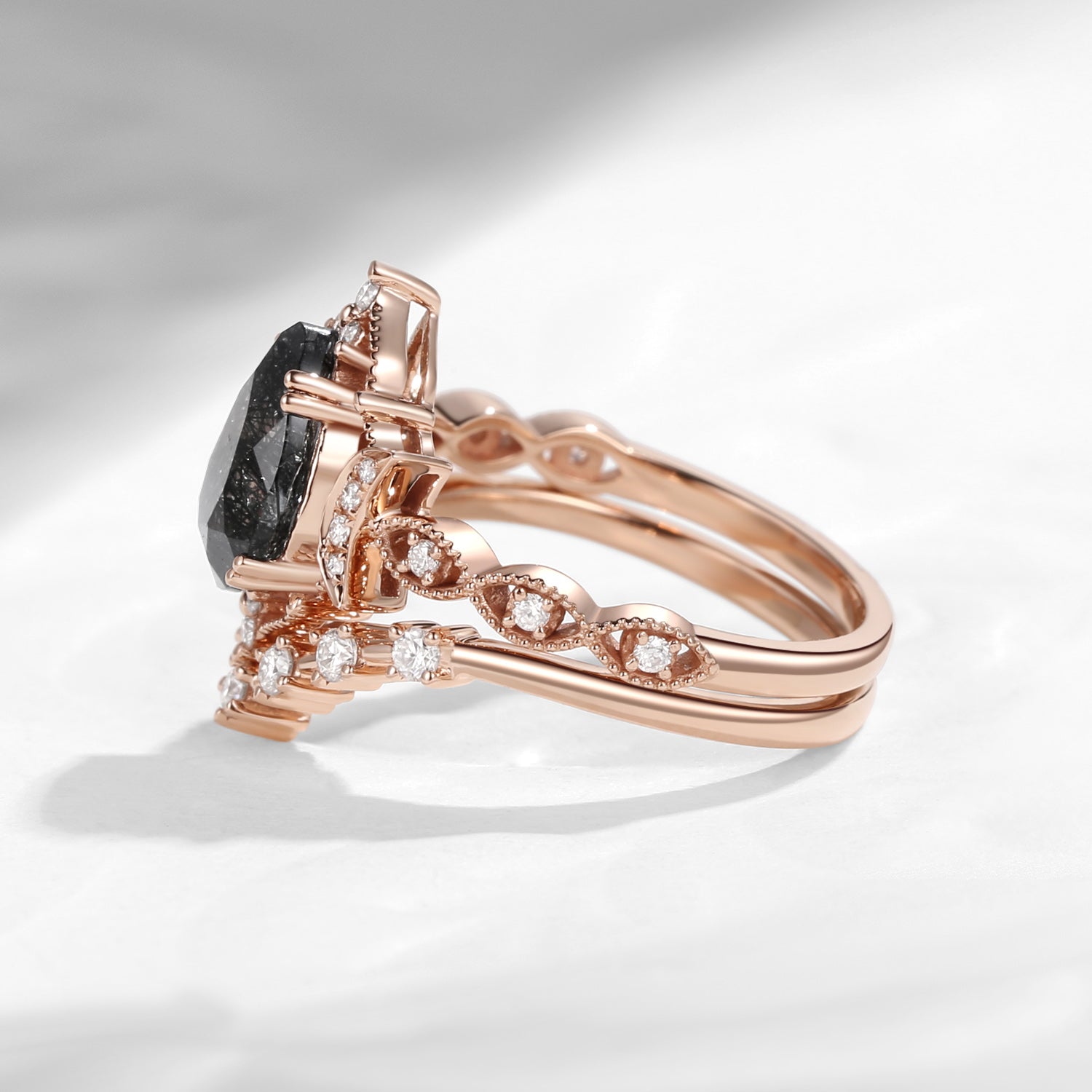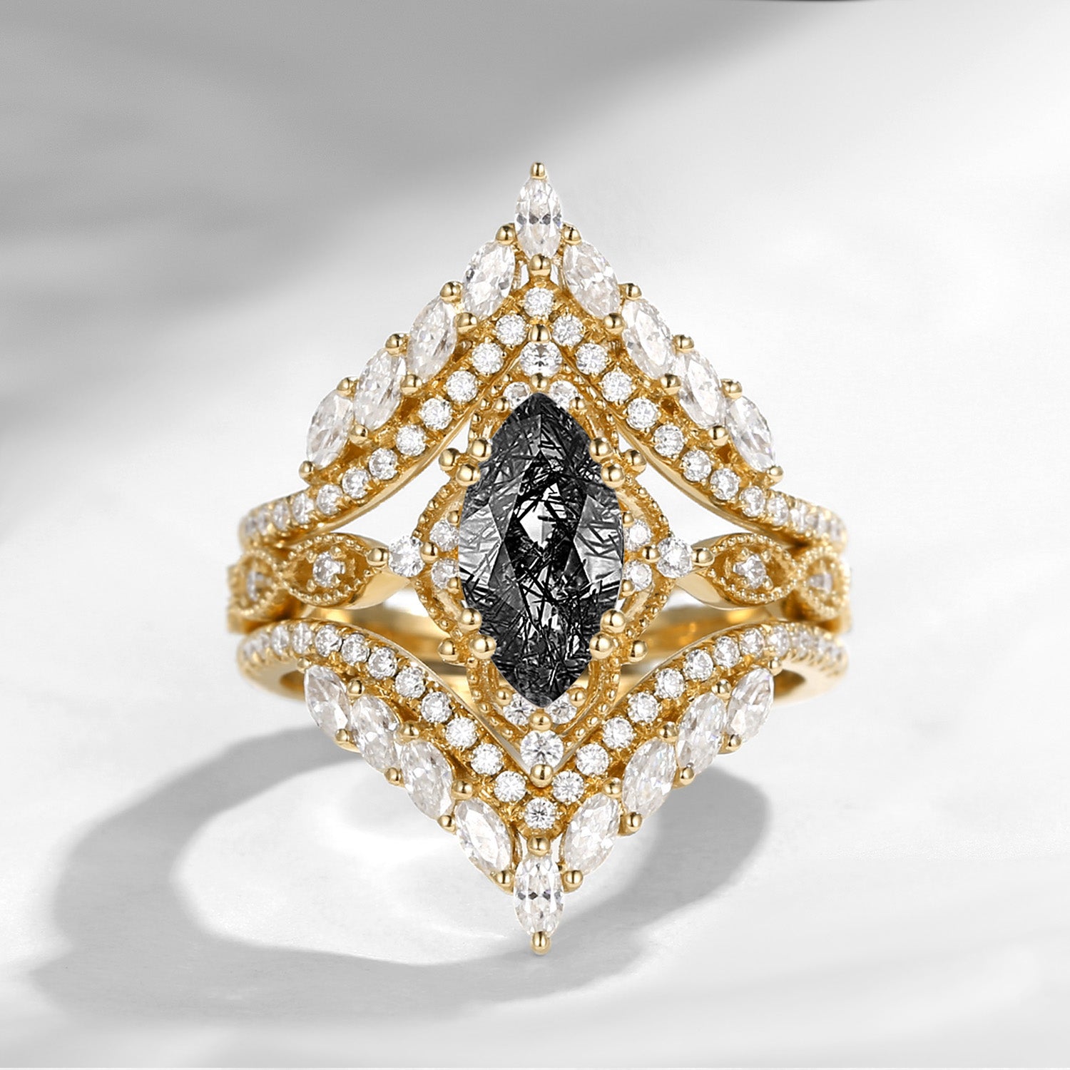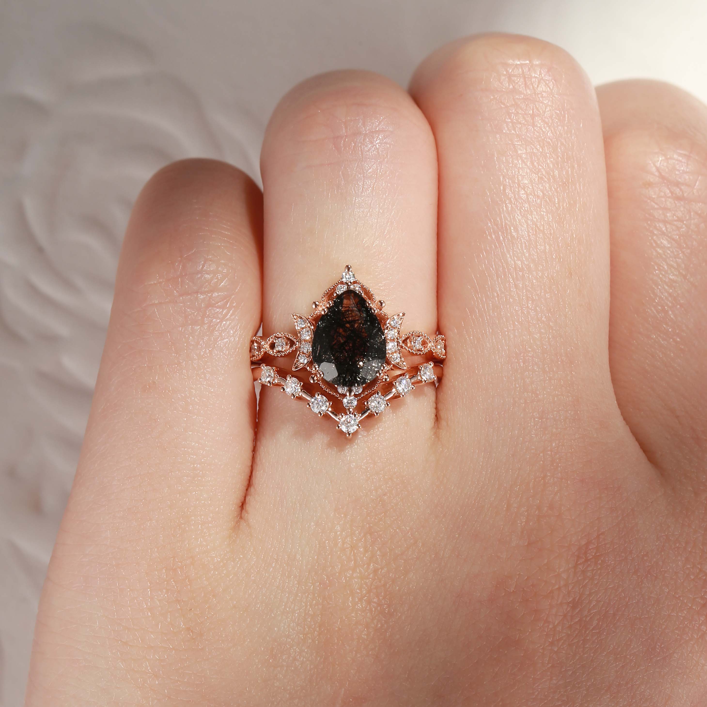 Vintage Pear Cut Black Rutilated Quartz Engagement Ring Cage Ring Set 2pcs