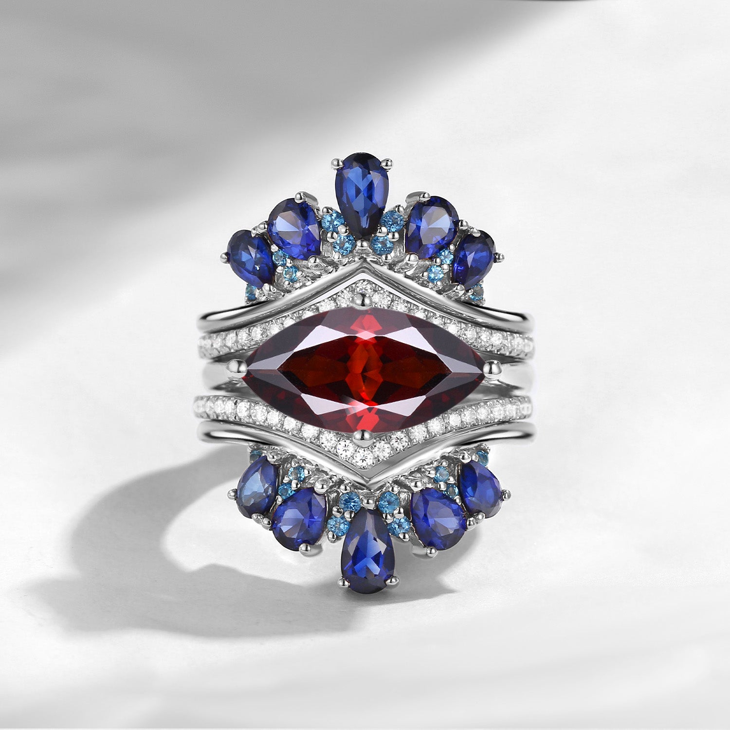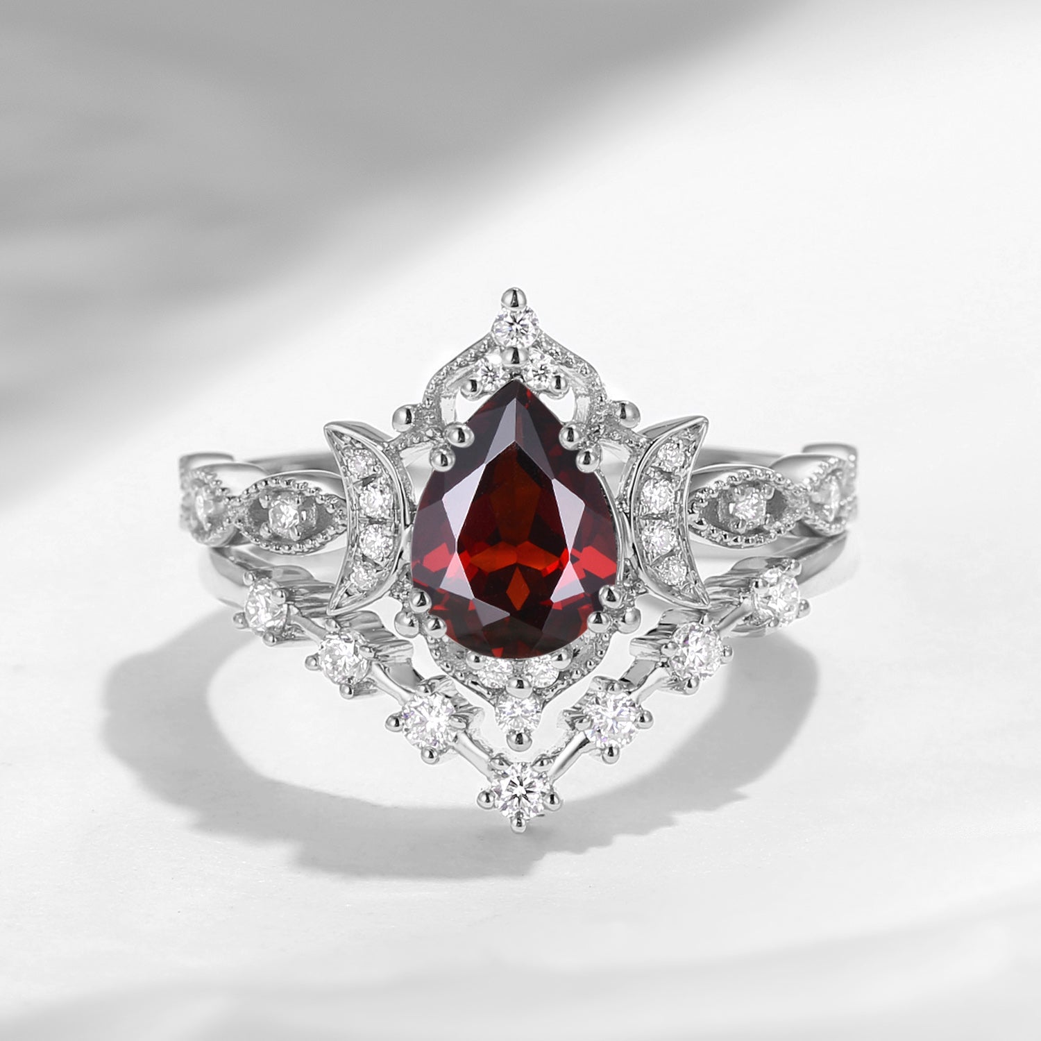 Crescent Moon | Pear Cut Garnet Galaxy Engagement Ring Set 2PCS