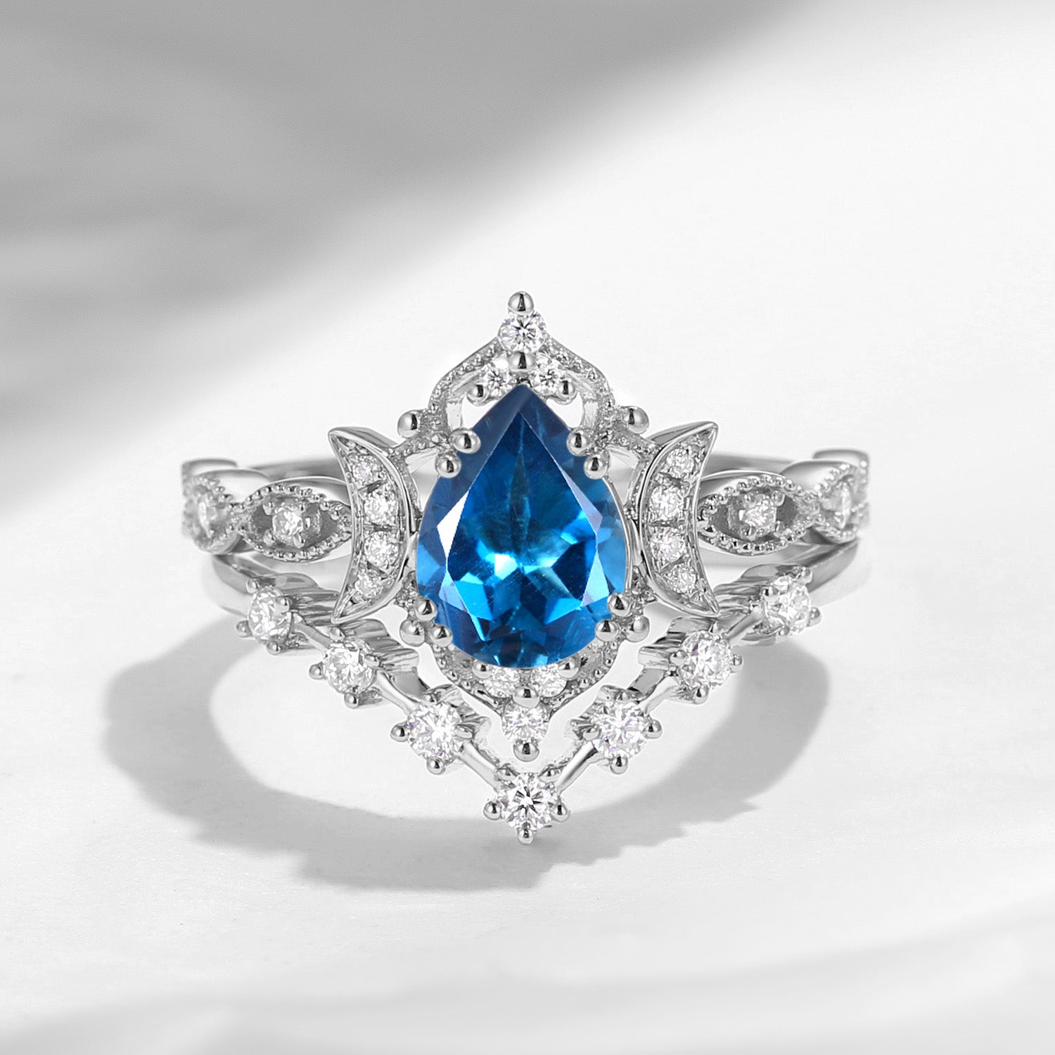 Crescent Moon | Pear Cut Blue Topaz Galaxy Engagement Ring Set 2PCS