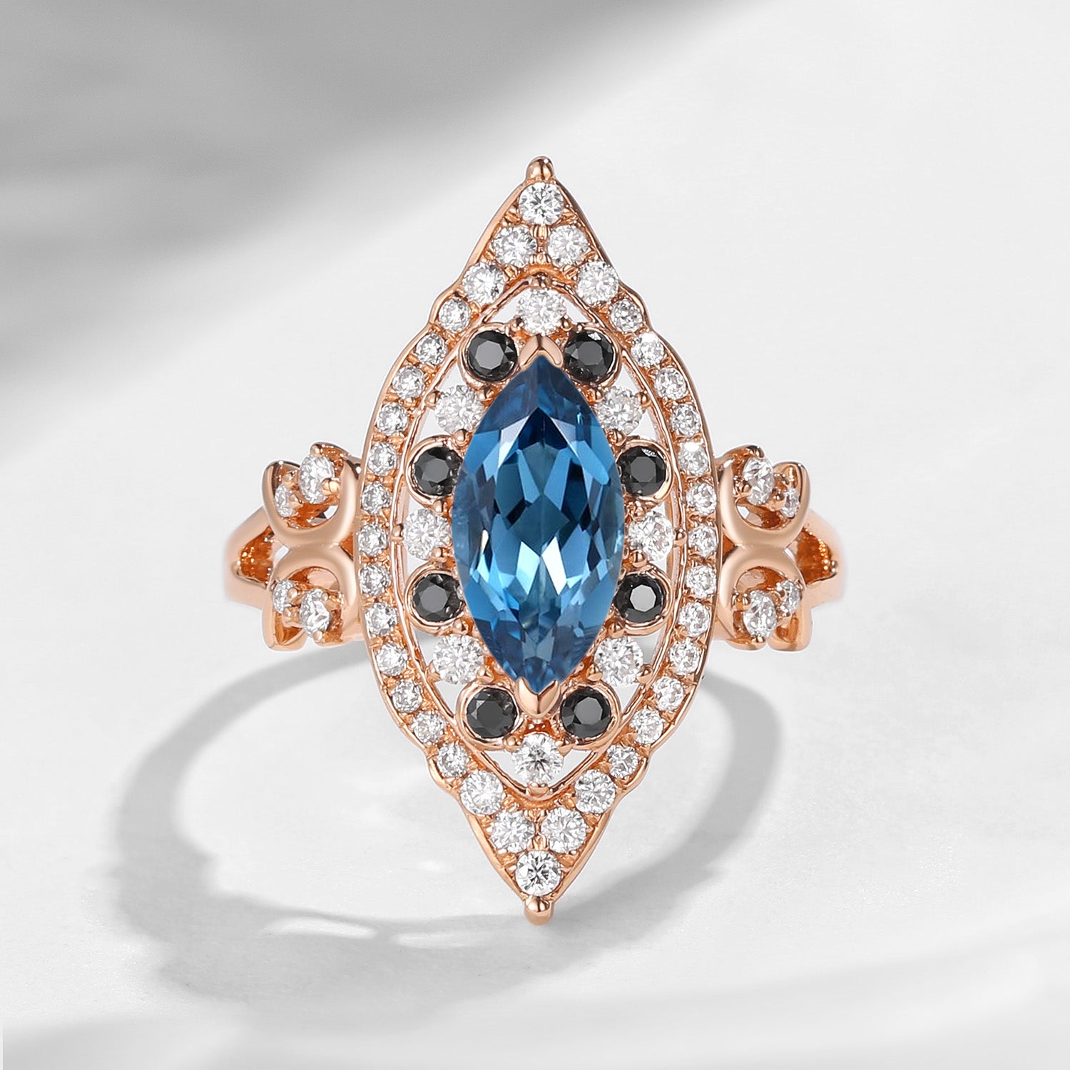 Maximalist Style Vintage Inspired Marquise Cut London Blue Topaz Engagement Ring