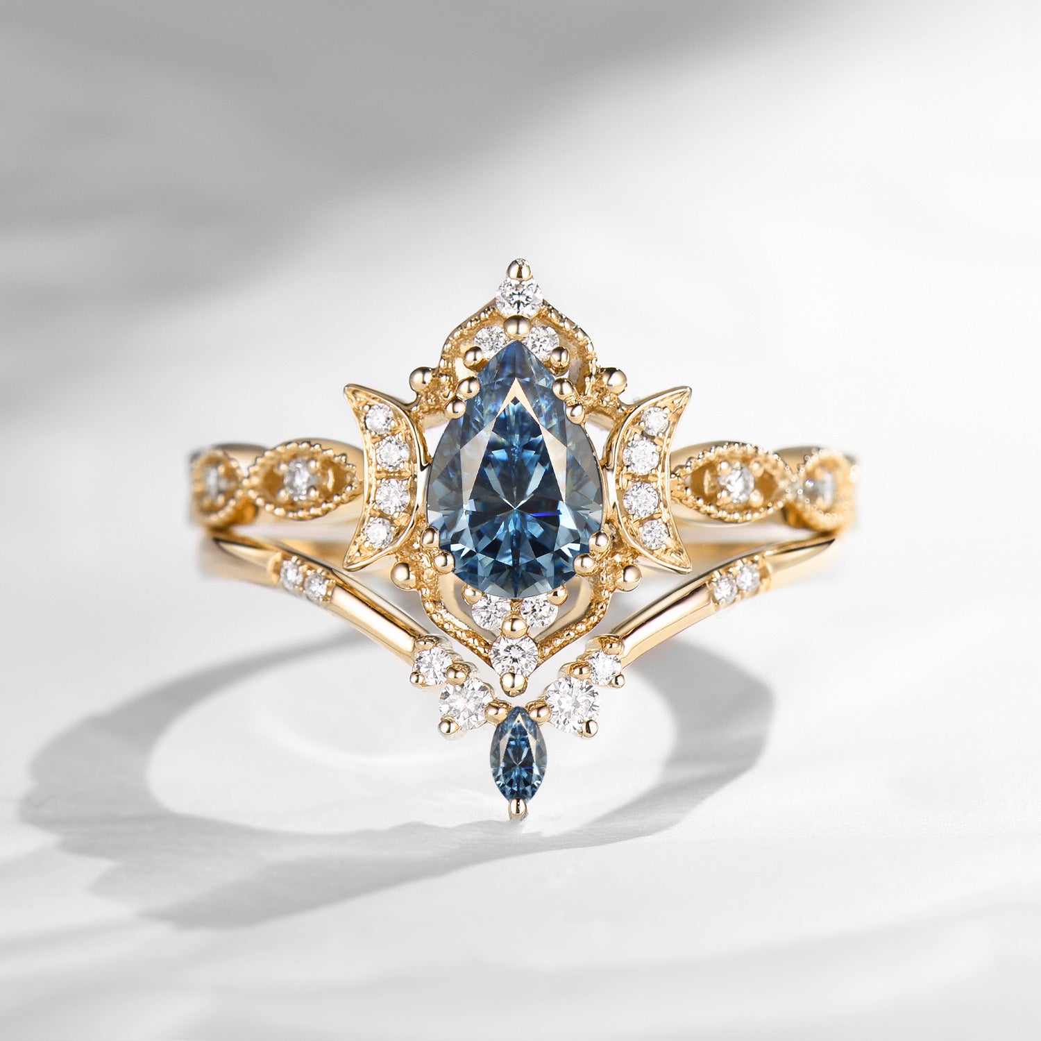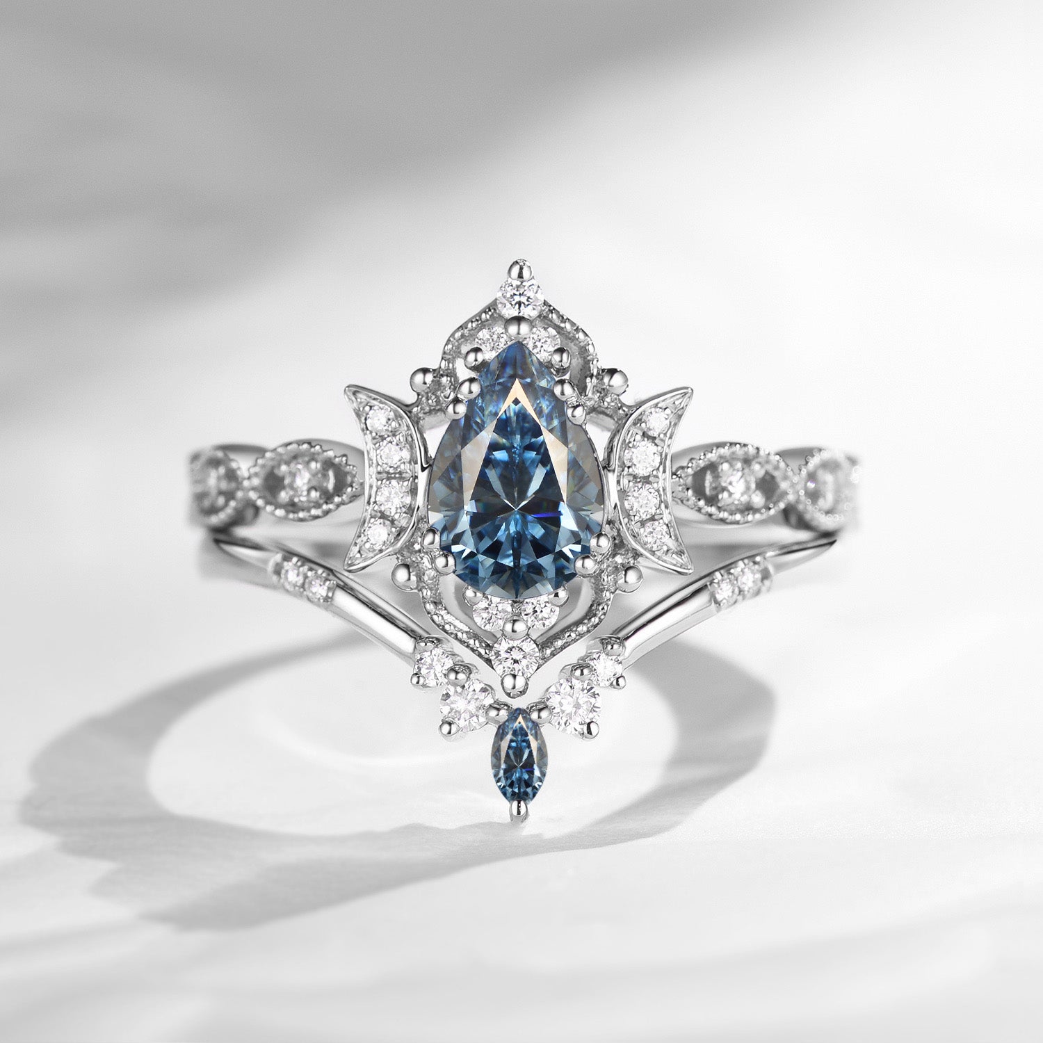 Crescent Moon | Pear Cut Blue Moissanite 'Ultra Galaxy' Engagement Ring Set 2pcs