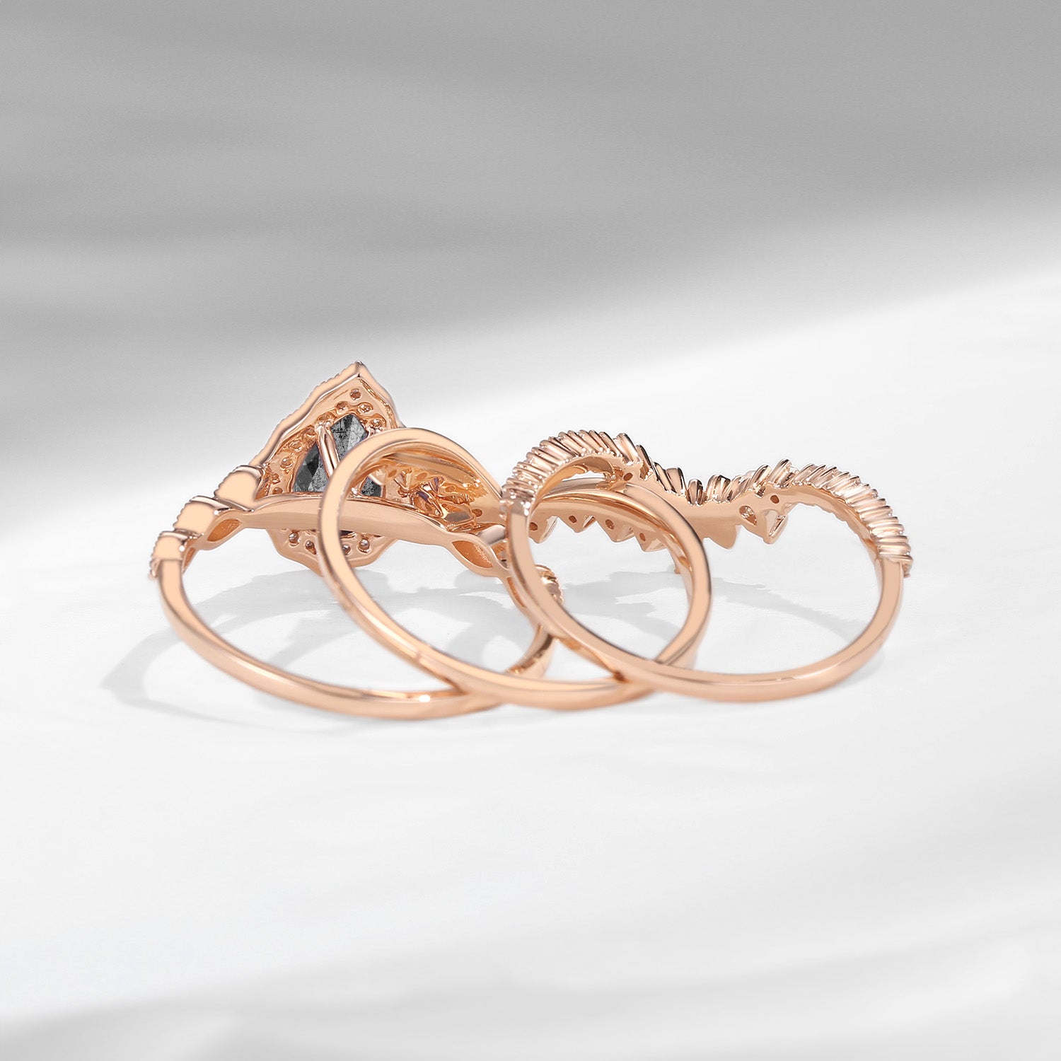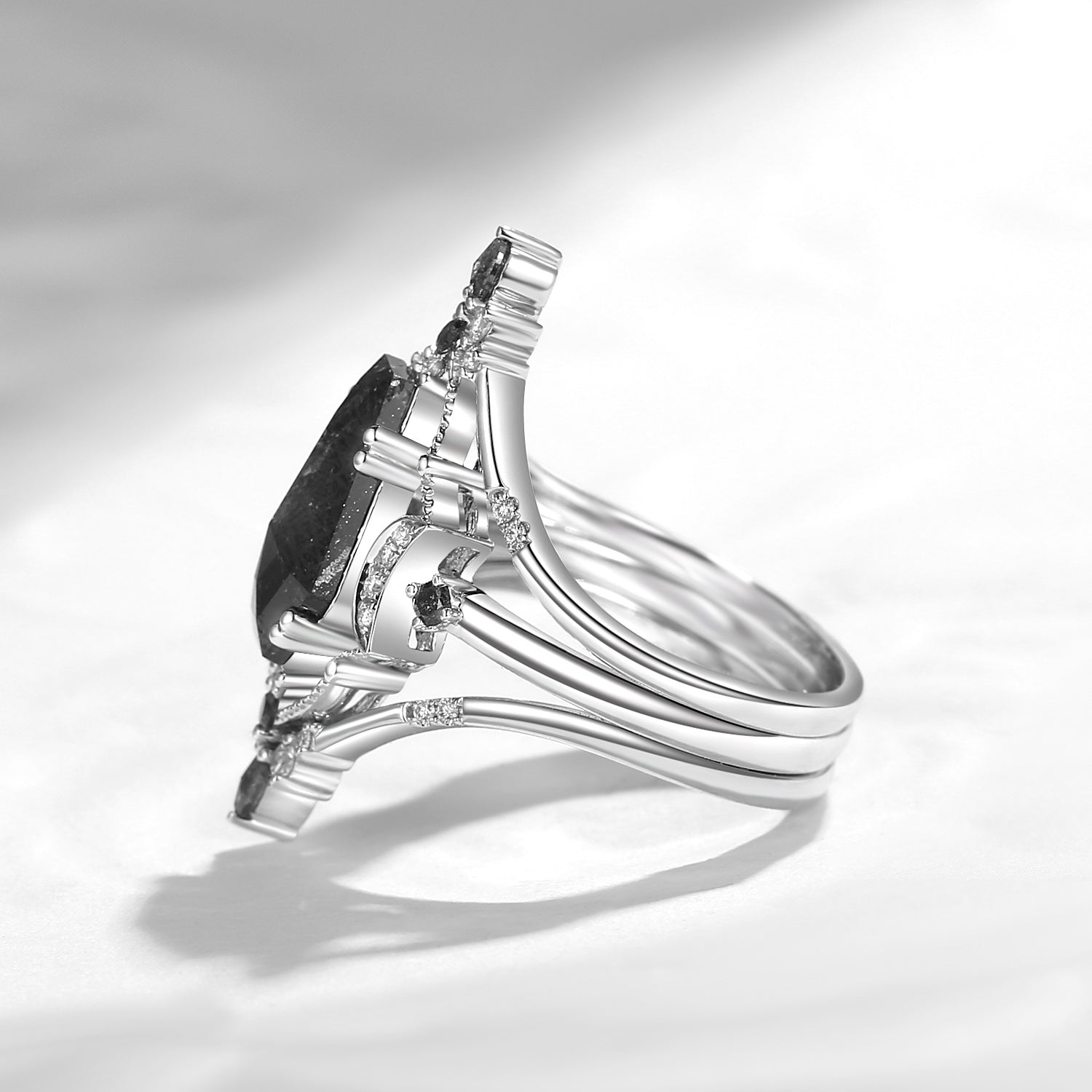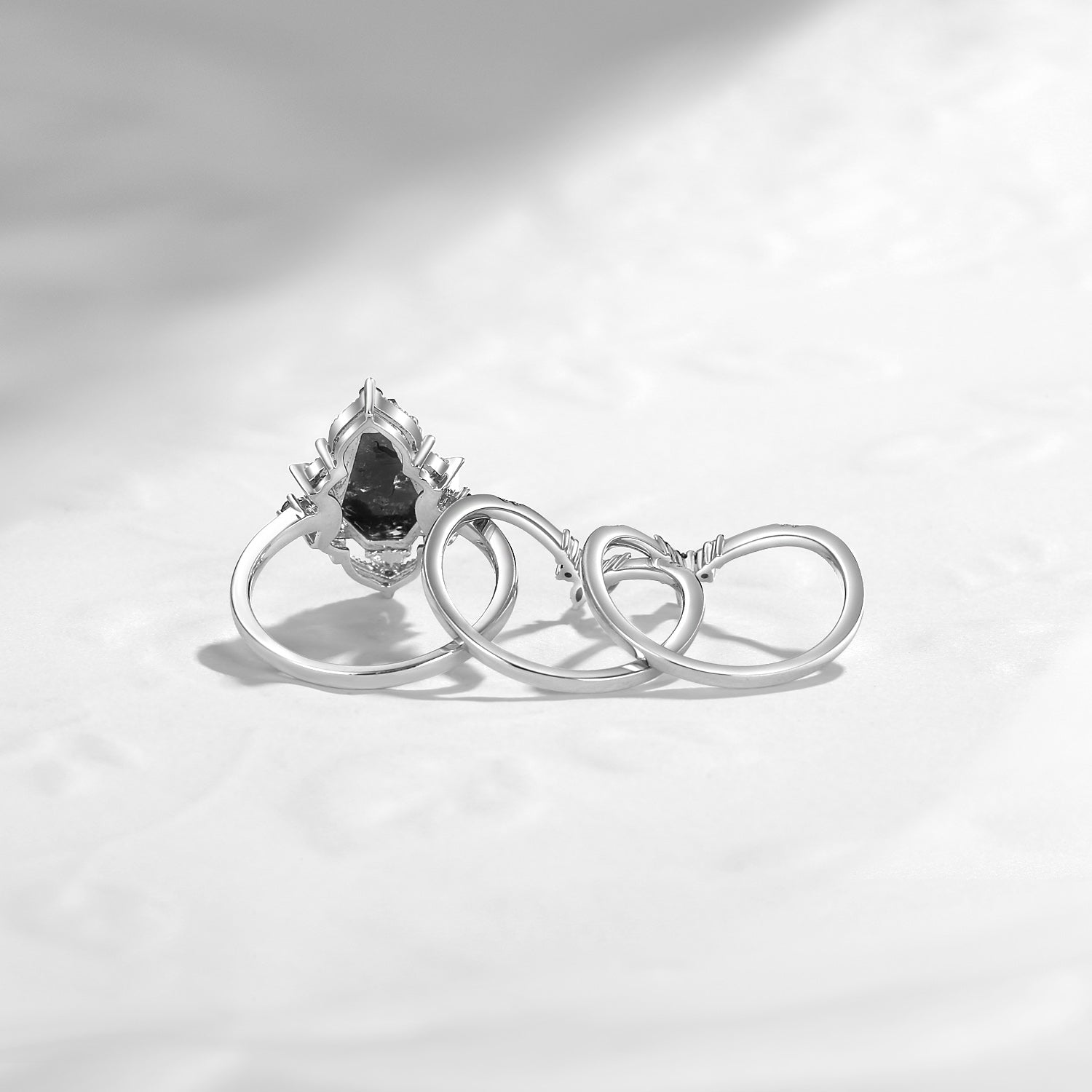 Crescent Moon | Coffin Cut Salt and Pepper Diamond Art-Deco Engagement Ring Set 3pcs