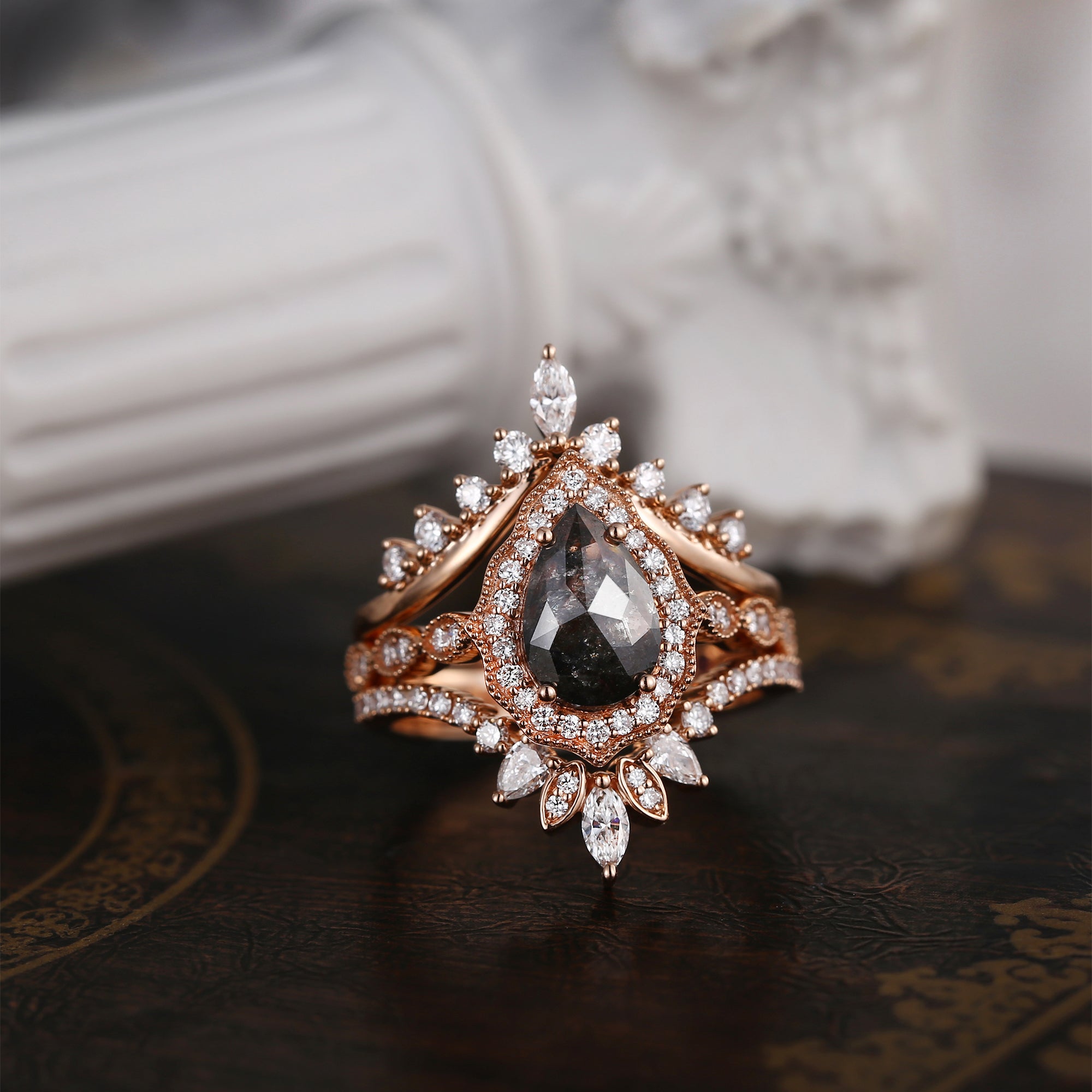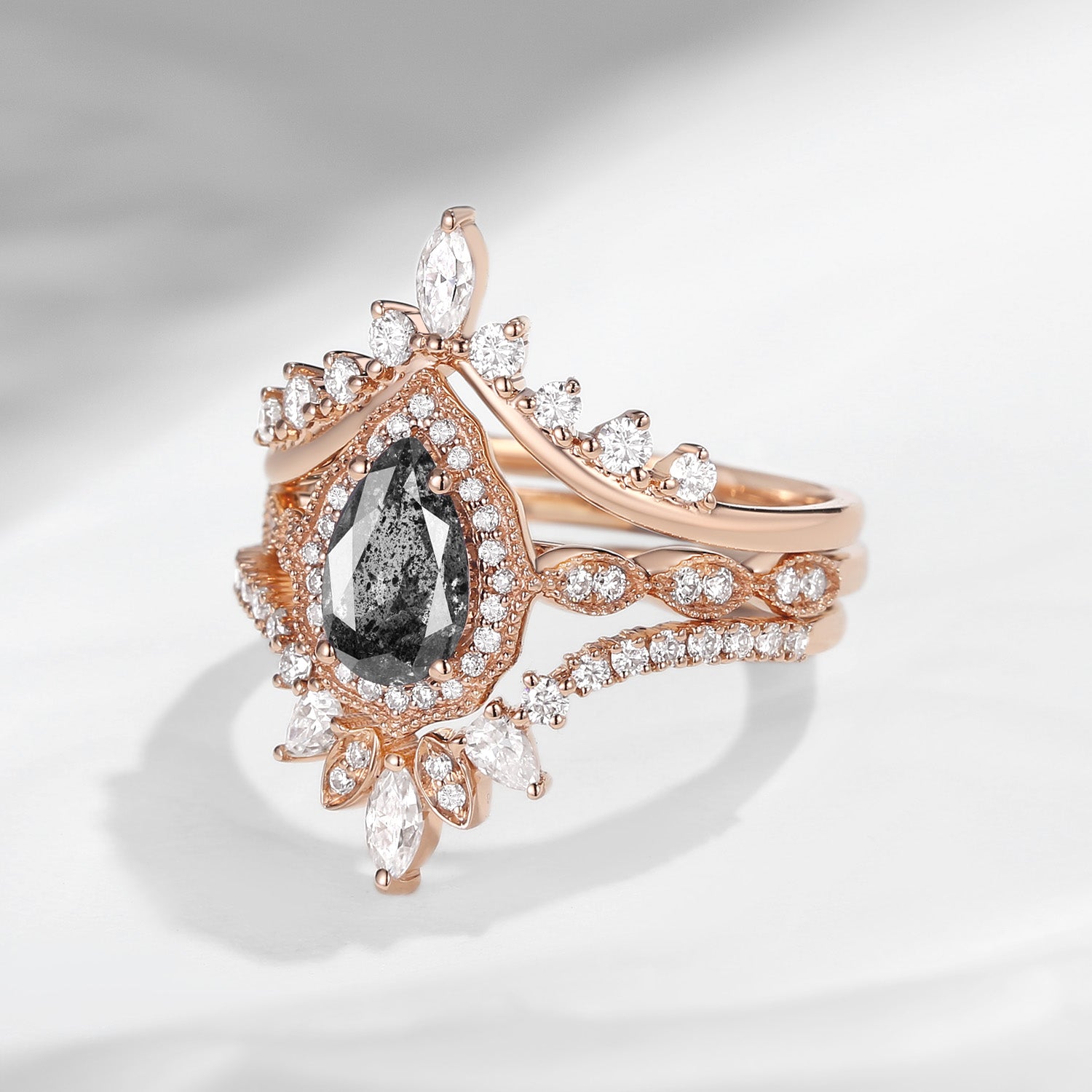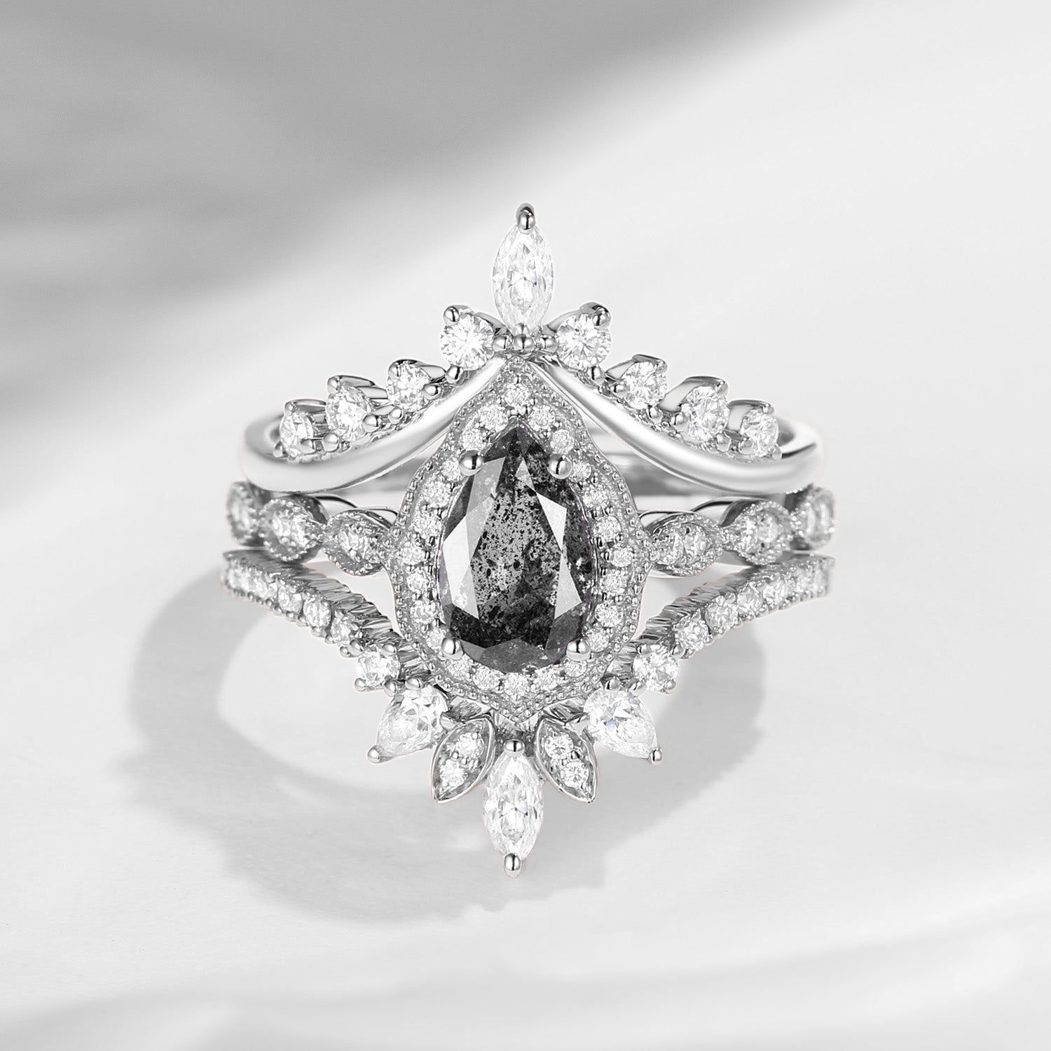Crescent Moon | Coffin Cut Salt and Pepper Diamond Art-Deco Engagement Ring Set 3pcs