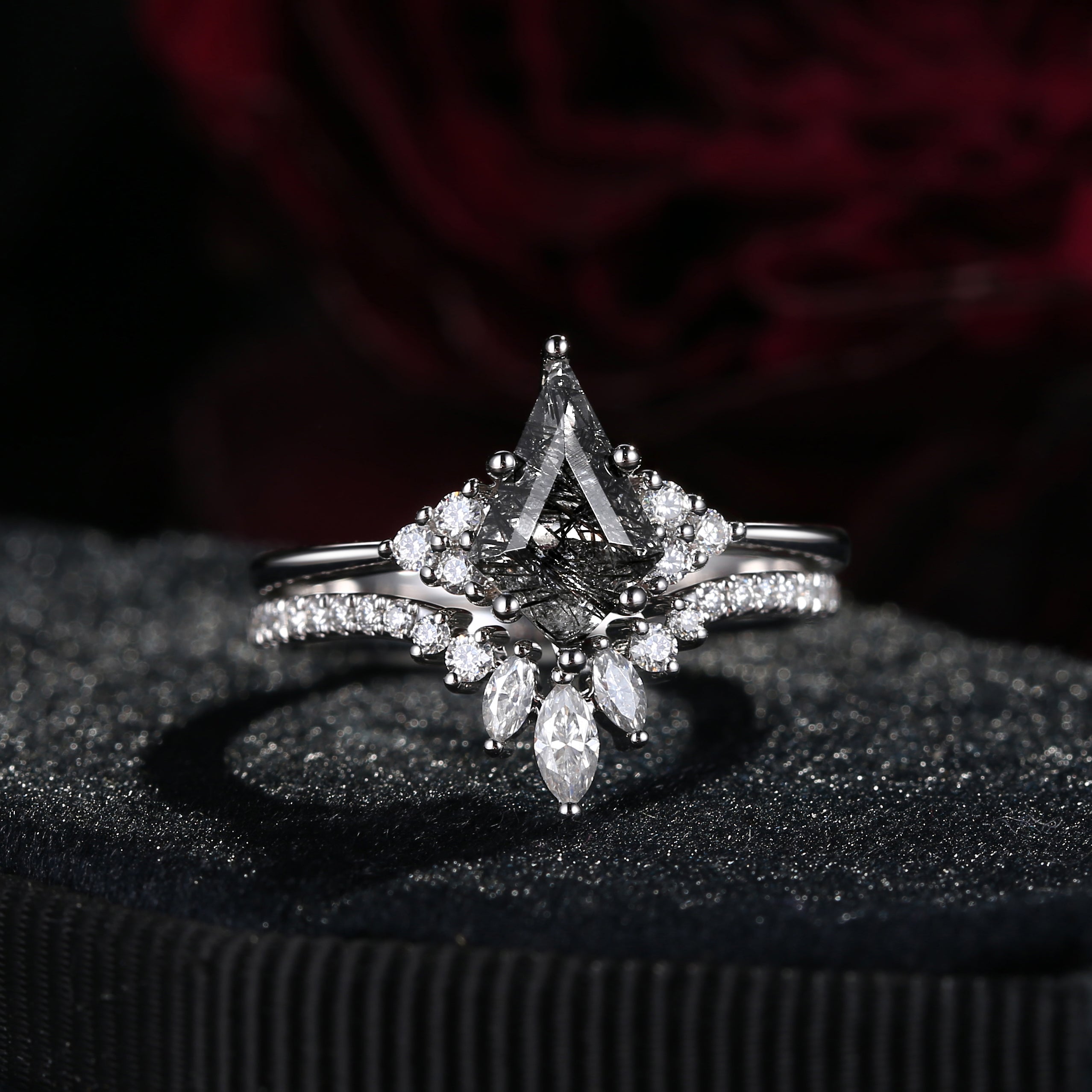 Art Deco Black Rutilated Quartz Kite Cut Engagement Ring Set 2pcs - Electra