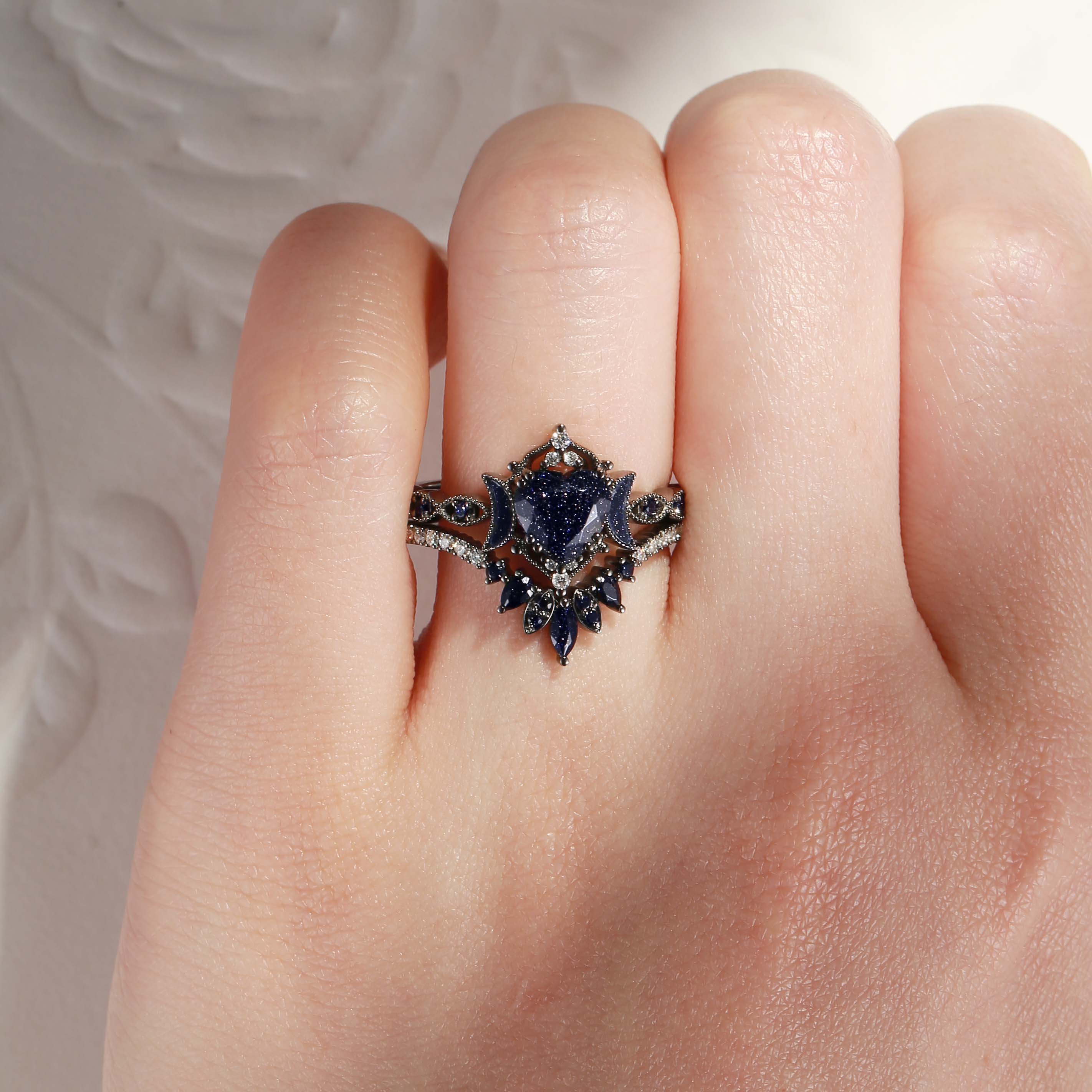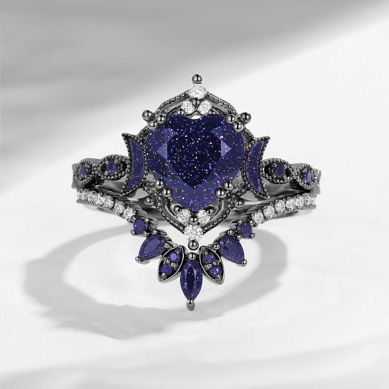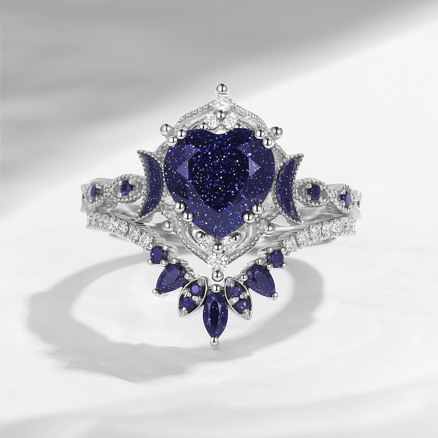 Crescent Moon | Heart Cut Blue Sandstone 'Ultra Galaxy' Engagement Ring Set 2pcs