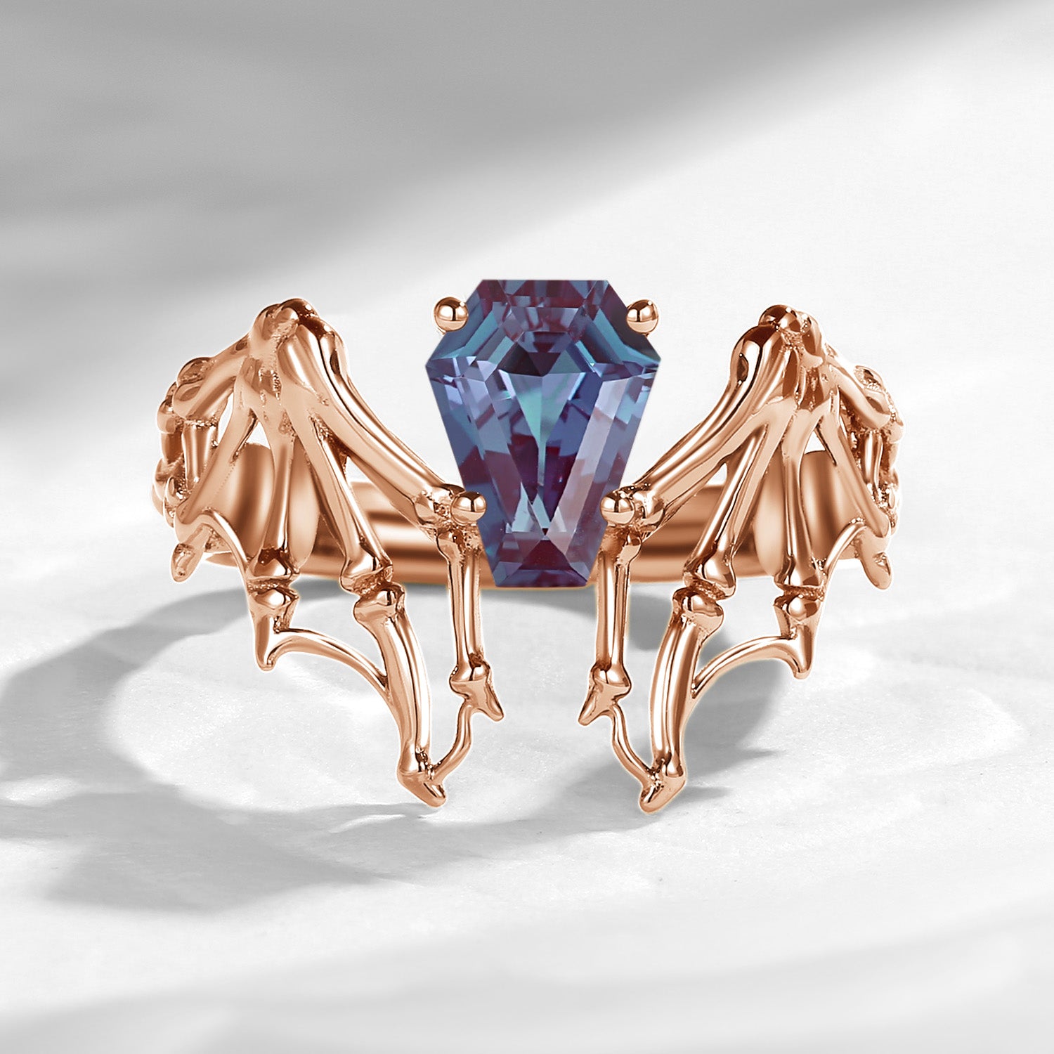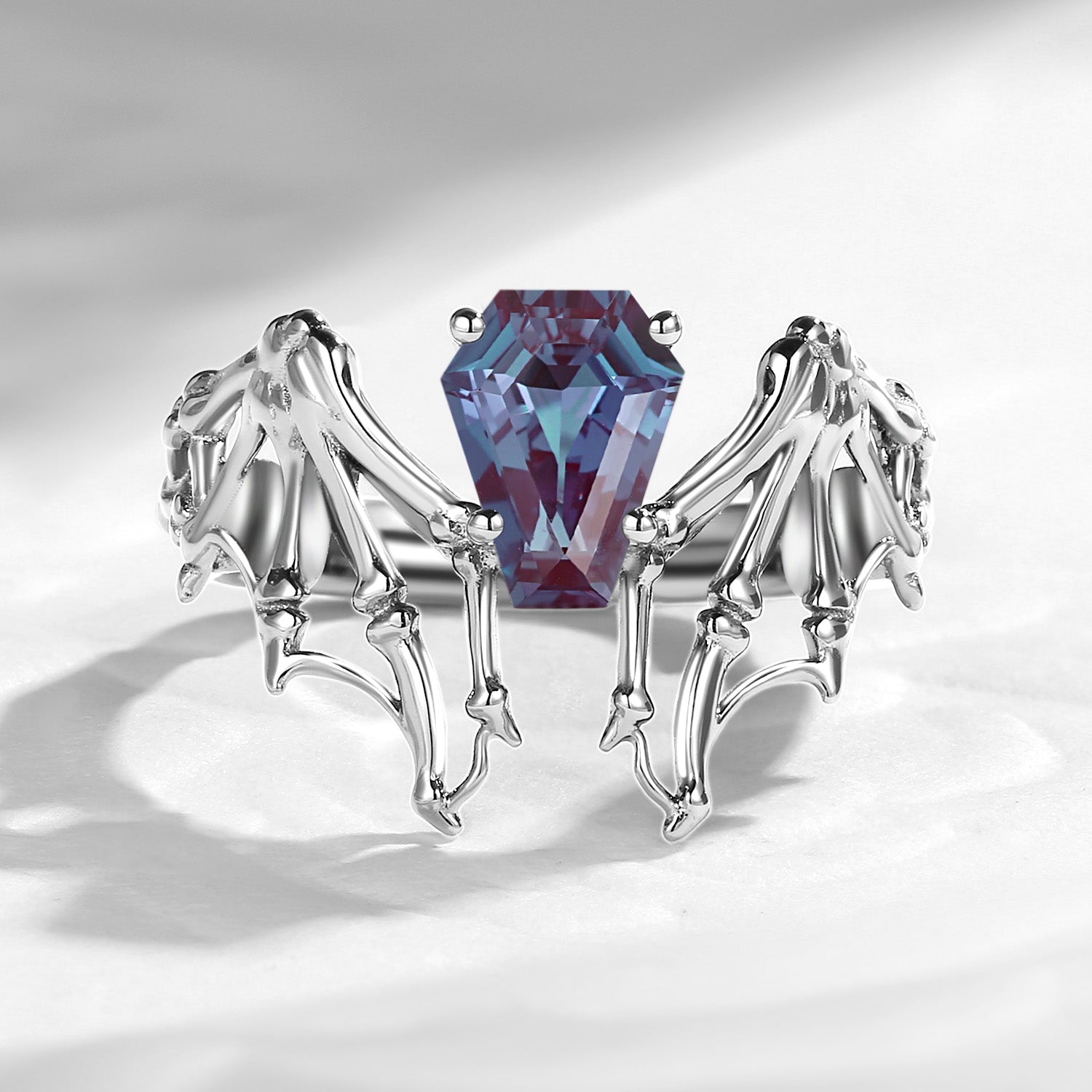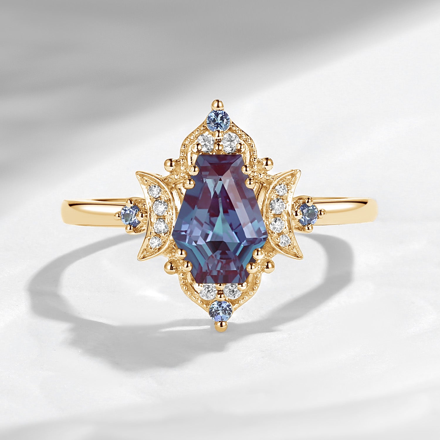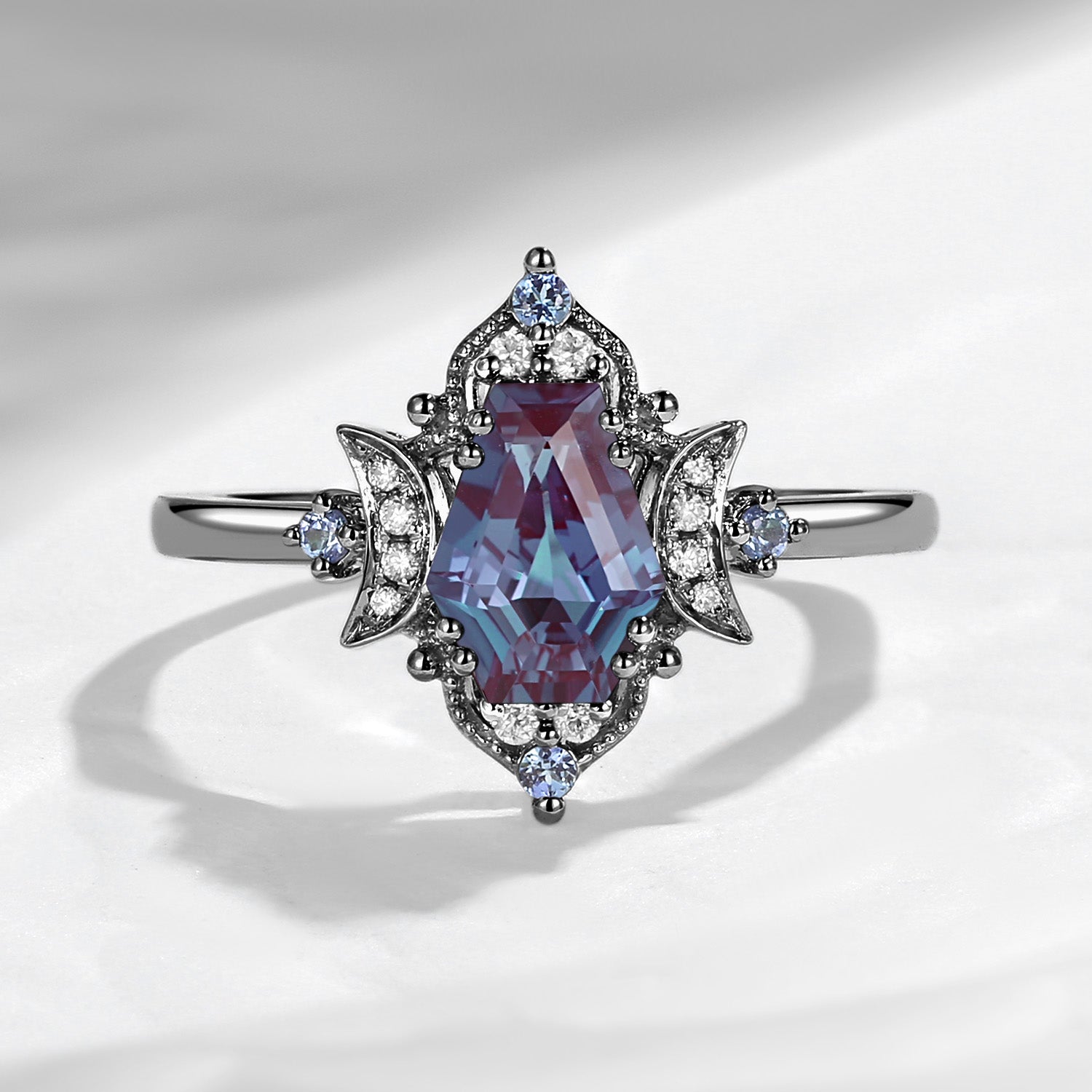 Crescent Moon | Coffin Faceted Lab Alexandrite Engagement Ring Set 3PCS