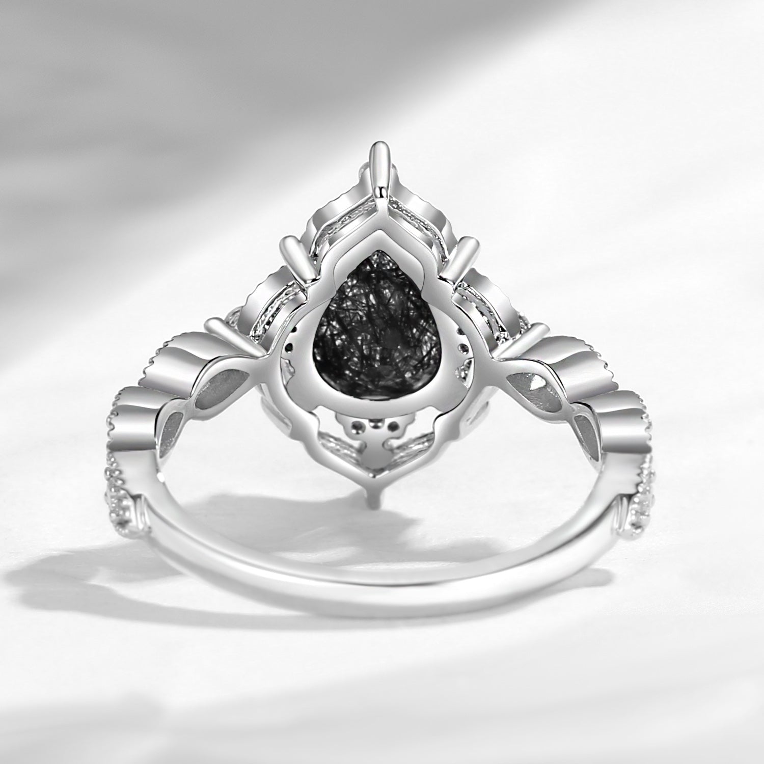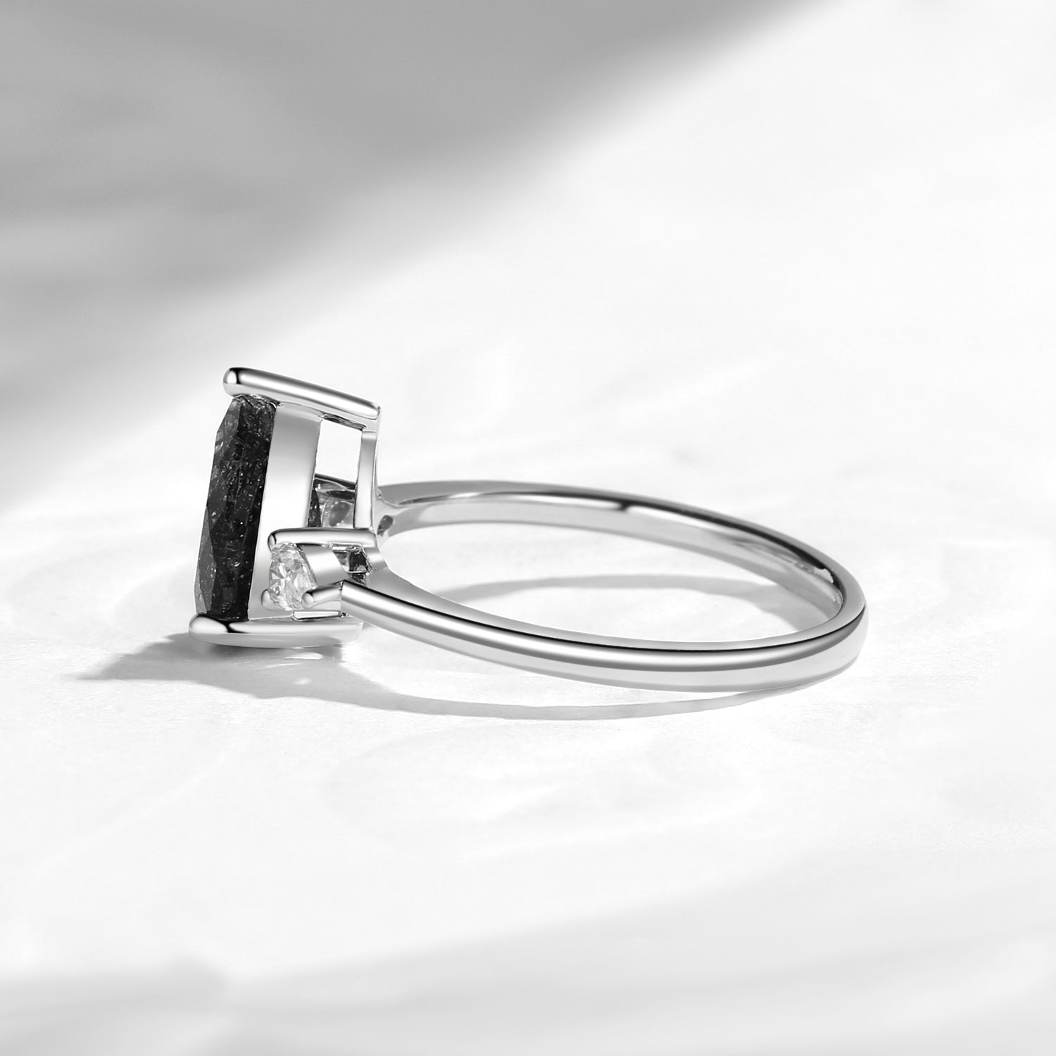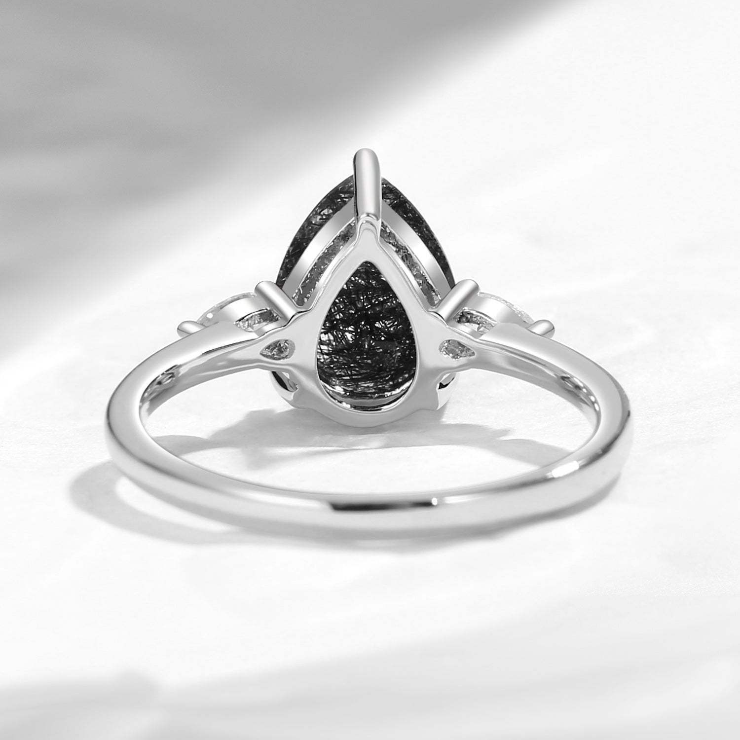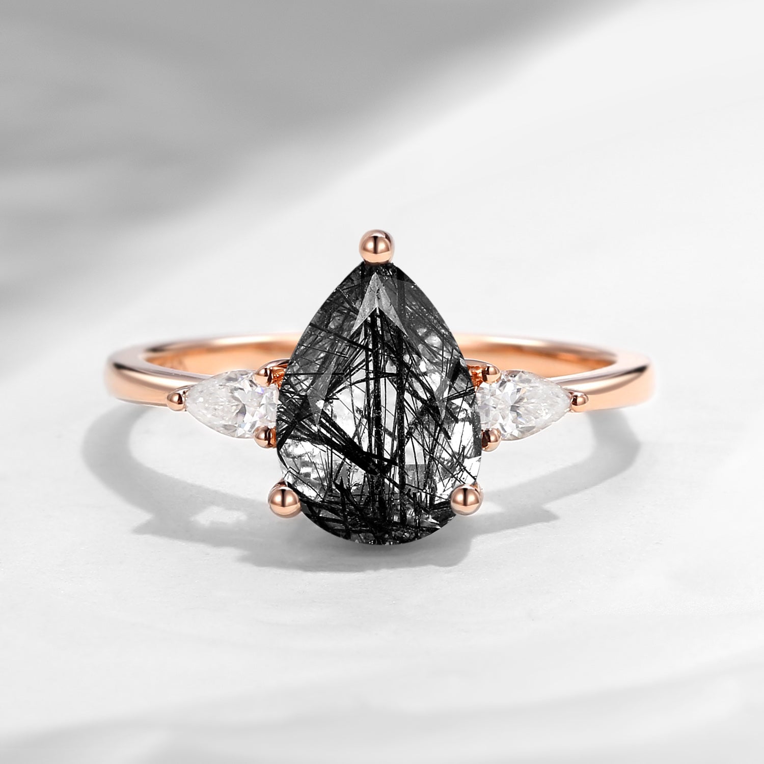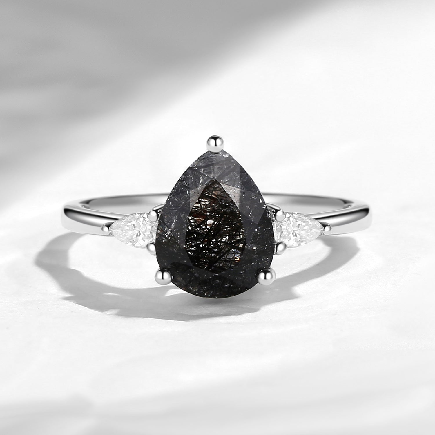 Pear Shaped Black Rutilated Quartz Three Stones Engagement Ring