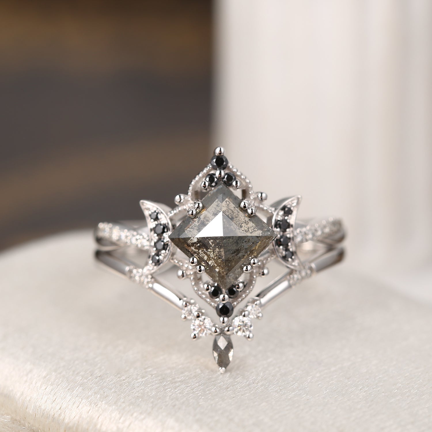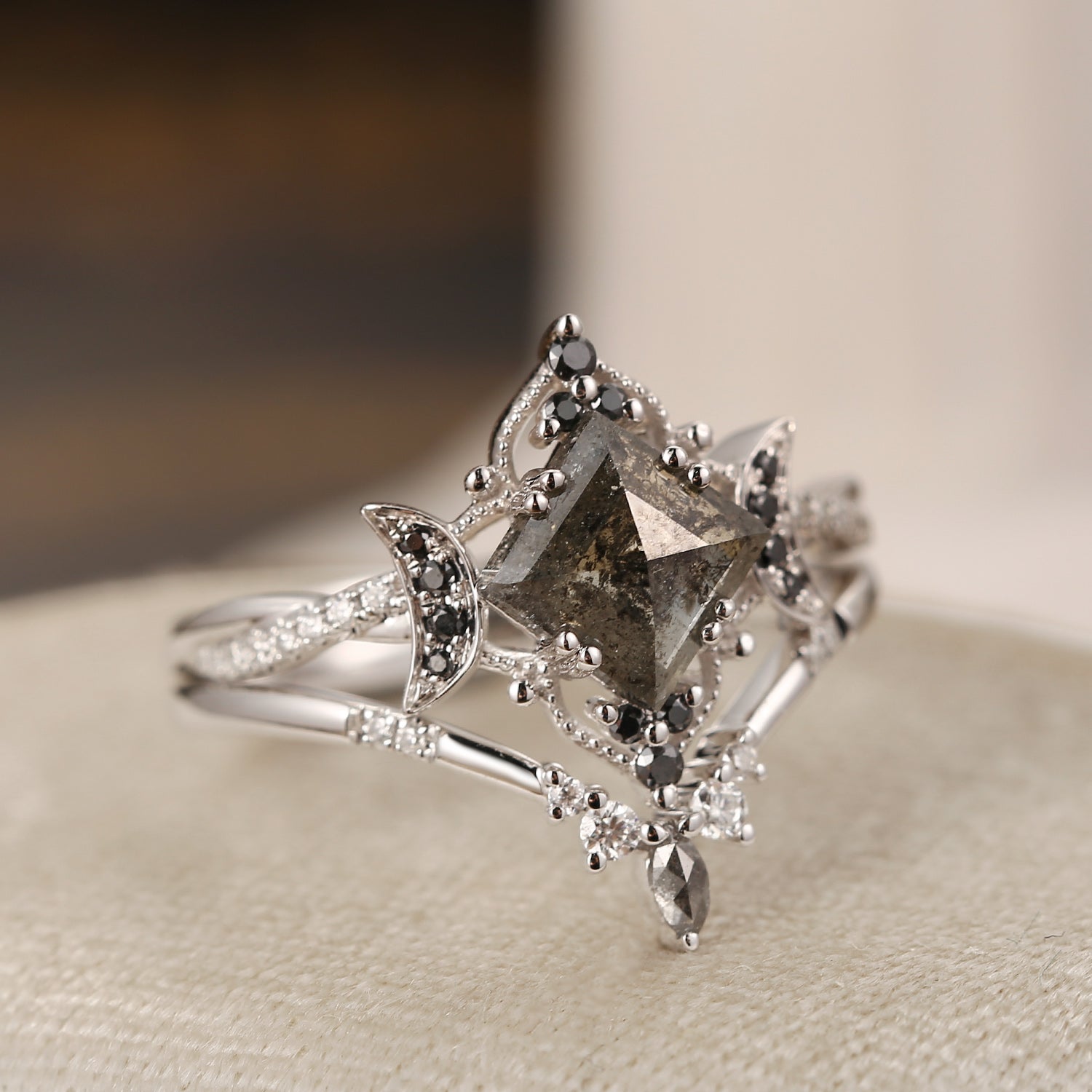 Crescent Moon | Rhombus Cut Salt and Pepper Diamond 'Noir' Engagement Ring Set 2pcs