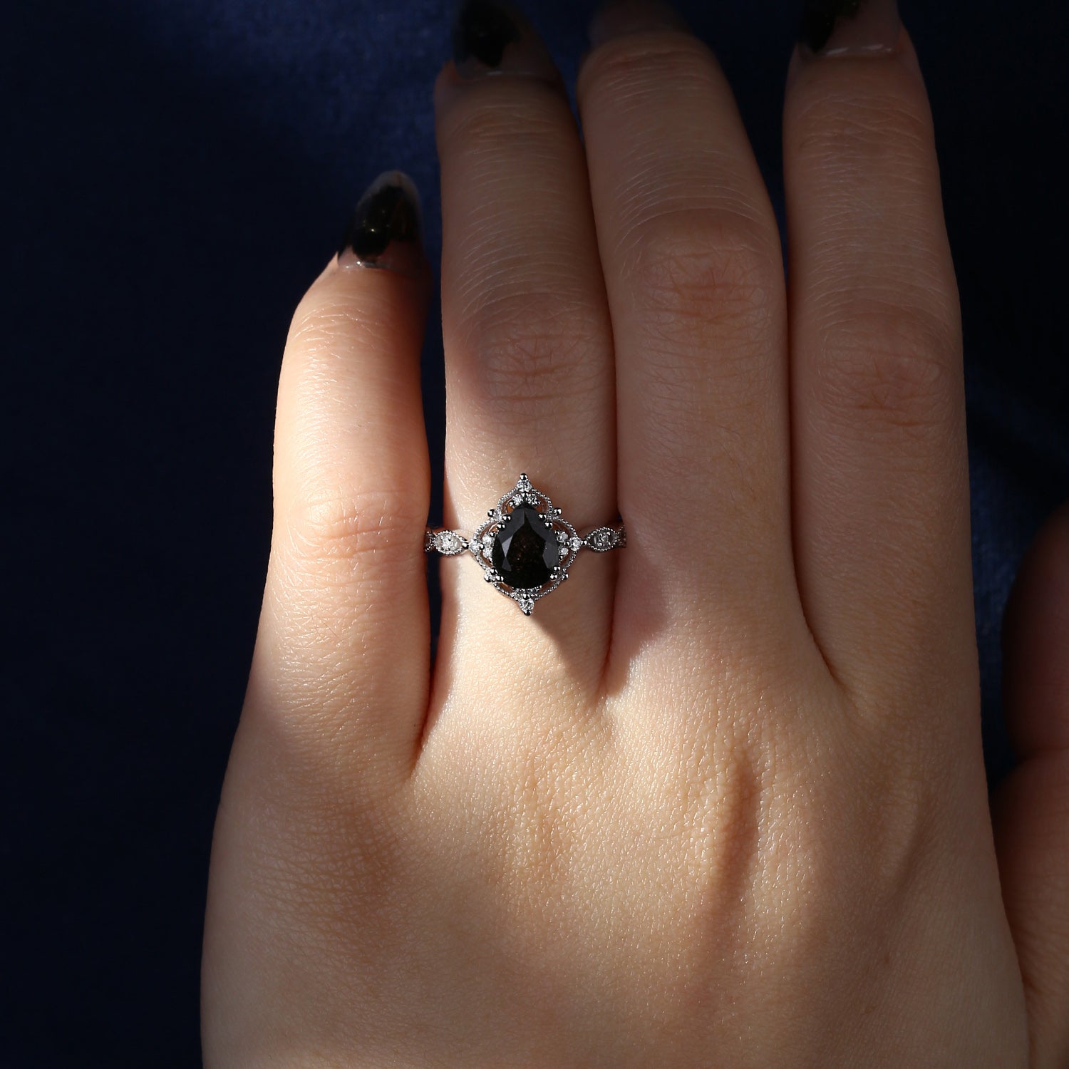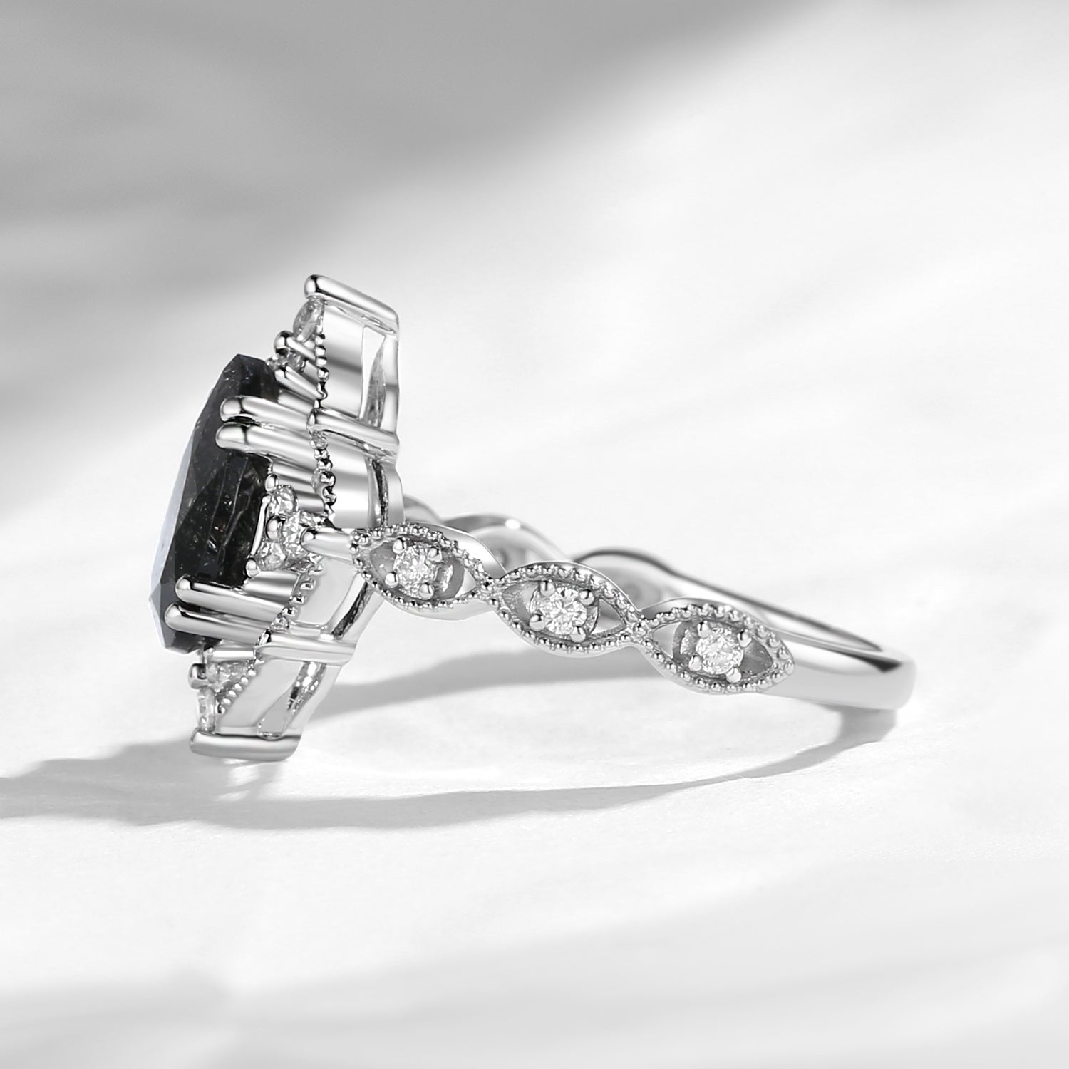 Kite Cut Black Rutilated Quartz Vintage Inspired Engagement Ring Set 2pcs