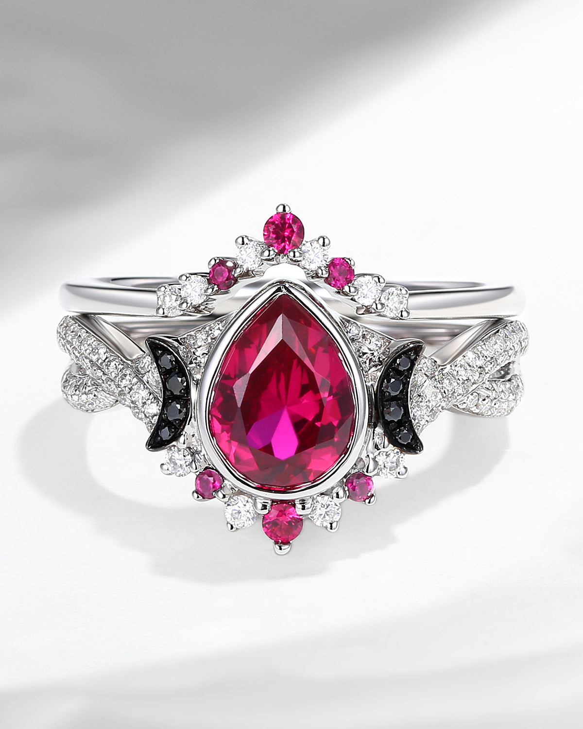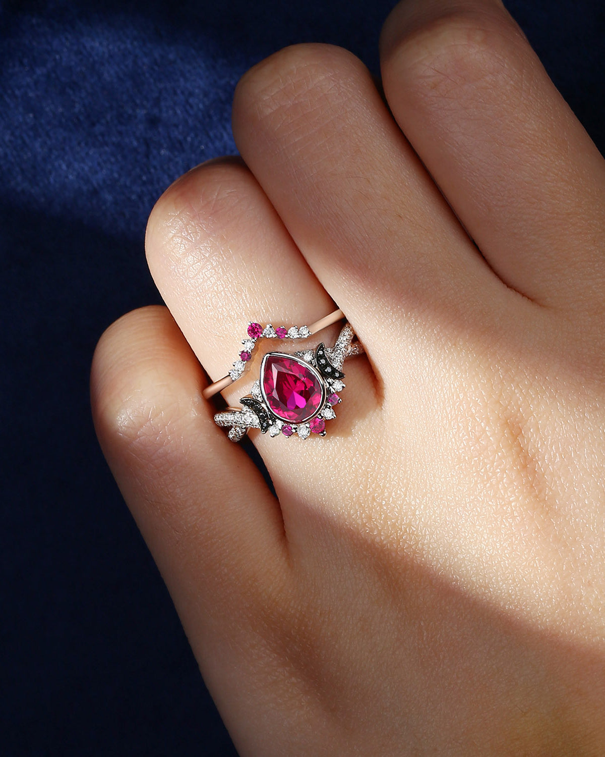 Crescent Moon | Infinity Pear Cut Lab Ruby Engagement Ring Set 2pcs- Dark Rose