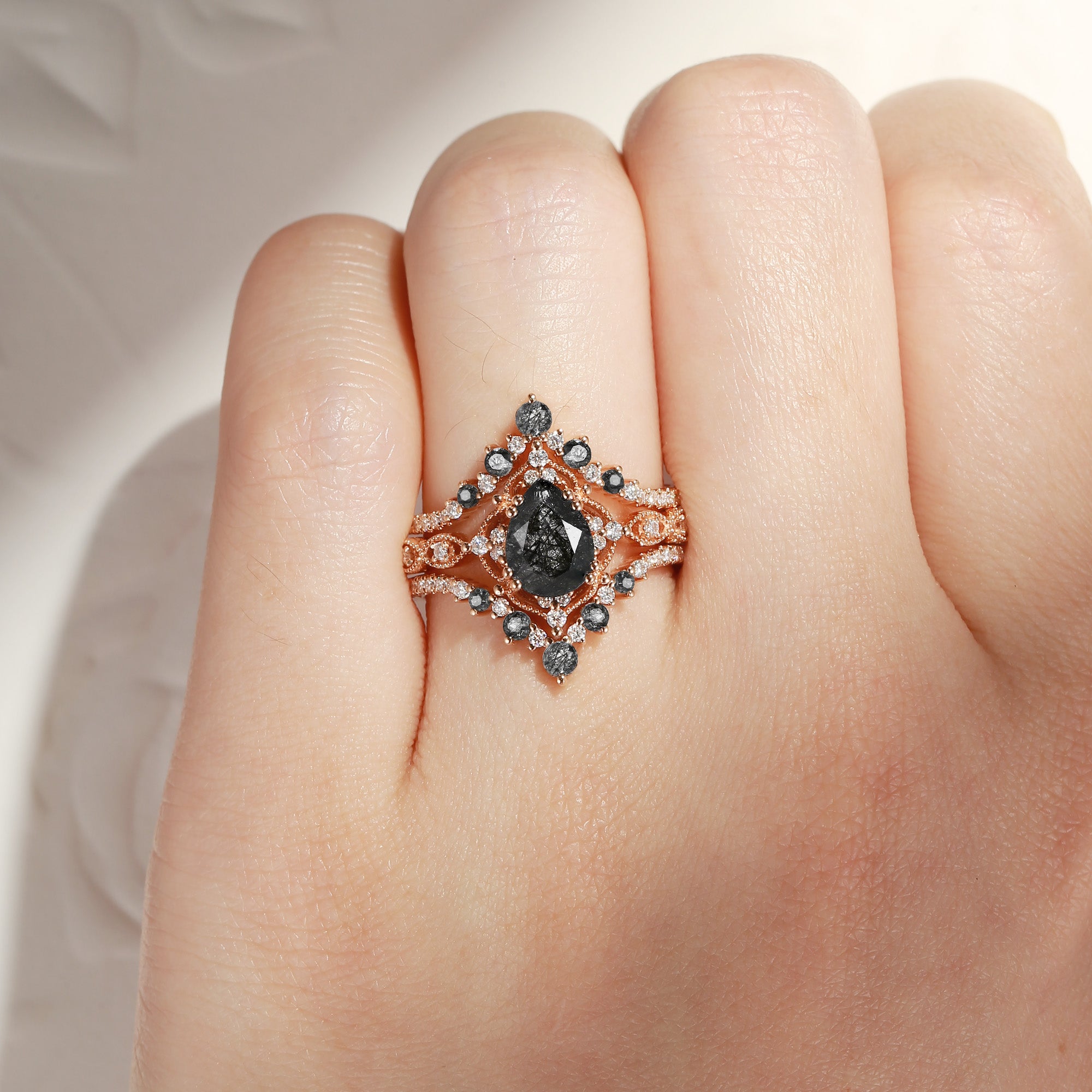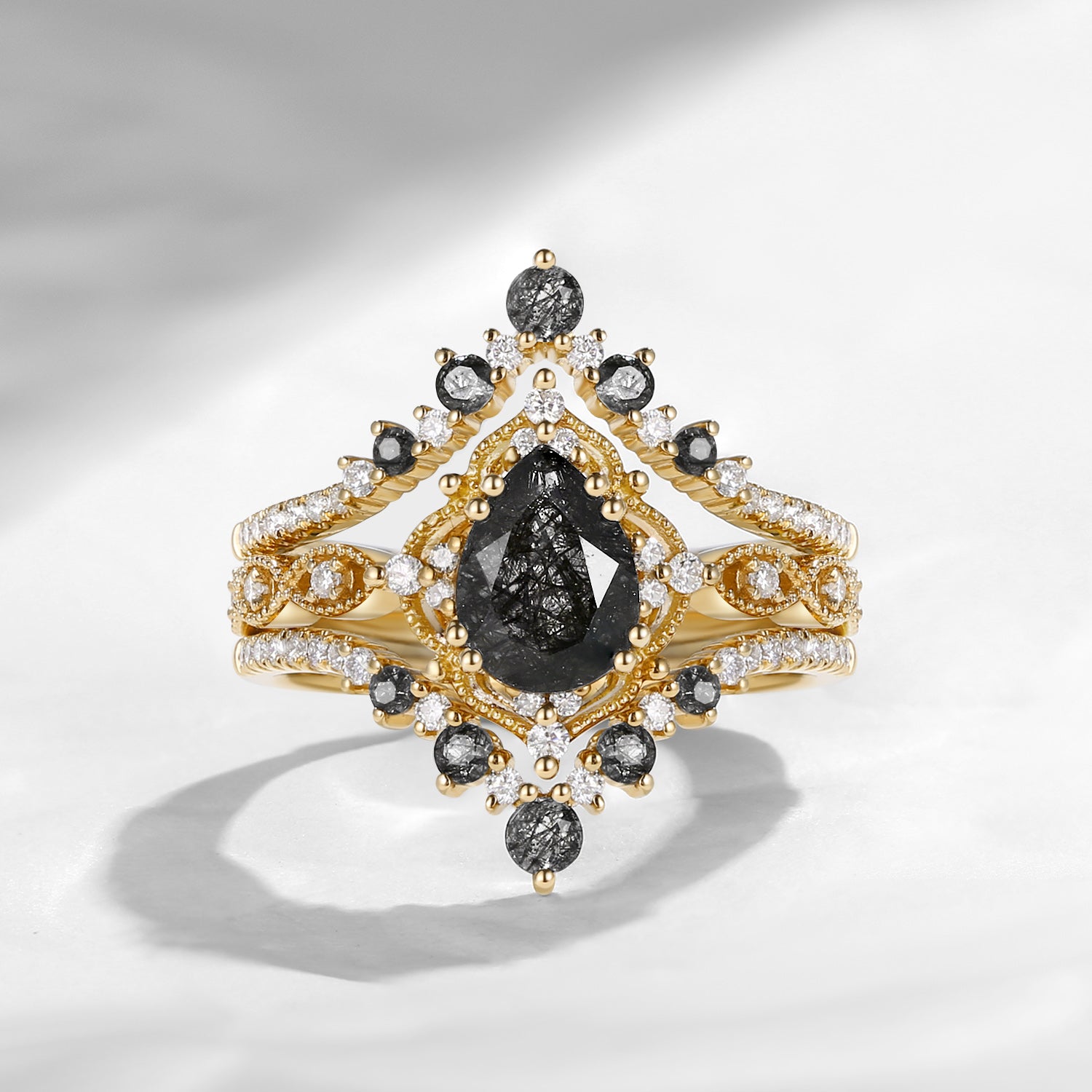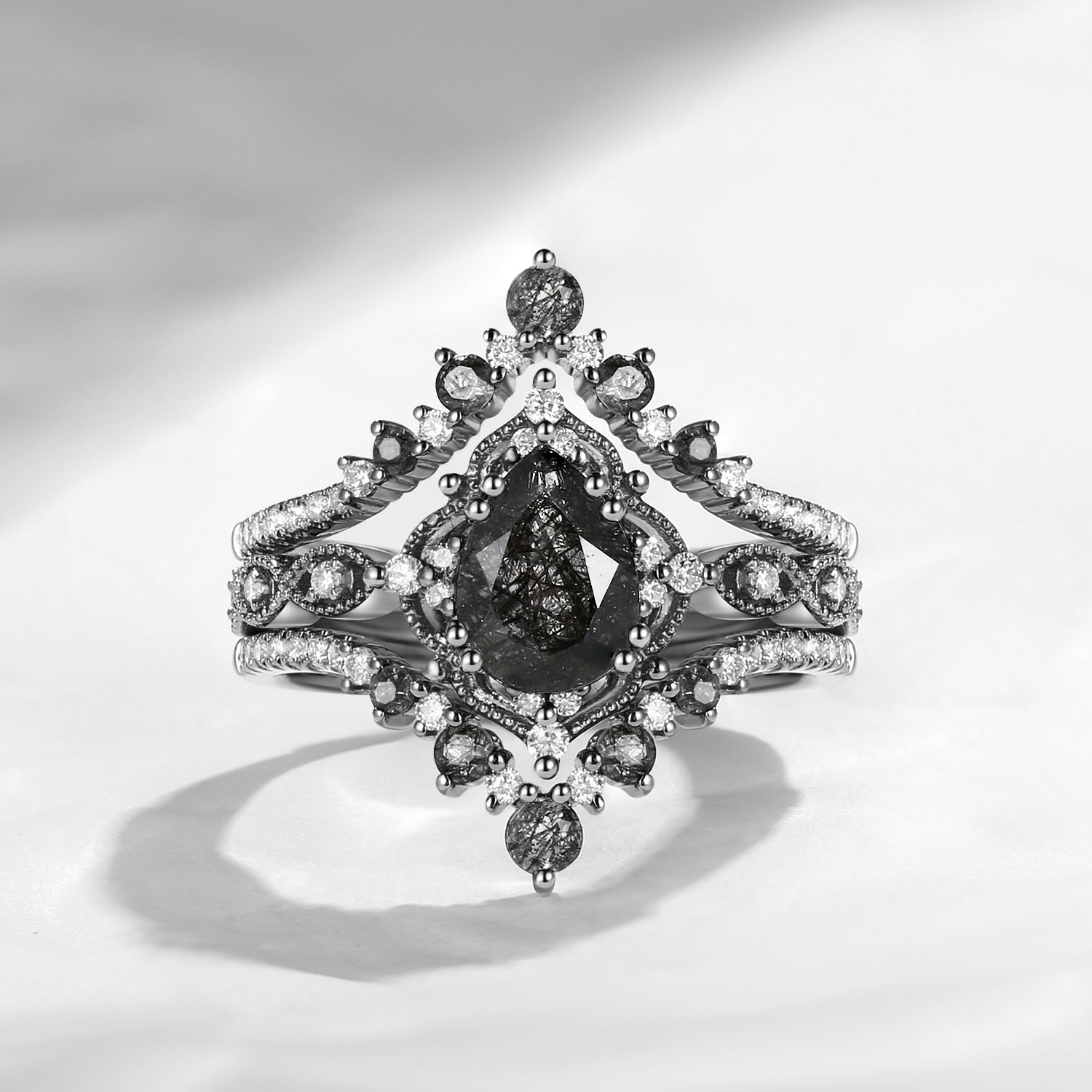 Pear Shaped Black Rutilated Quartz Antique Stacking Engagement Ring 2pcs - Evelyn