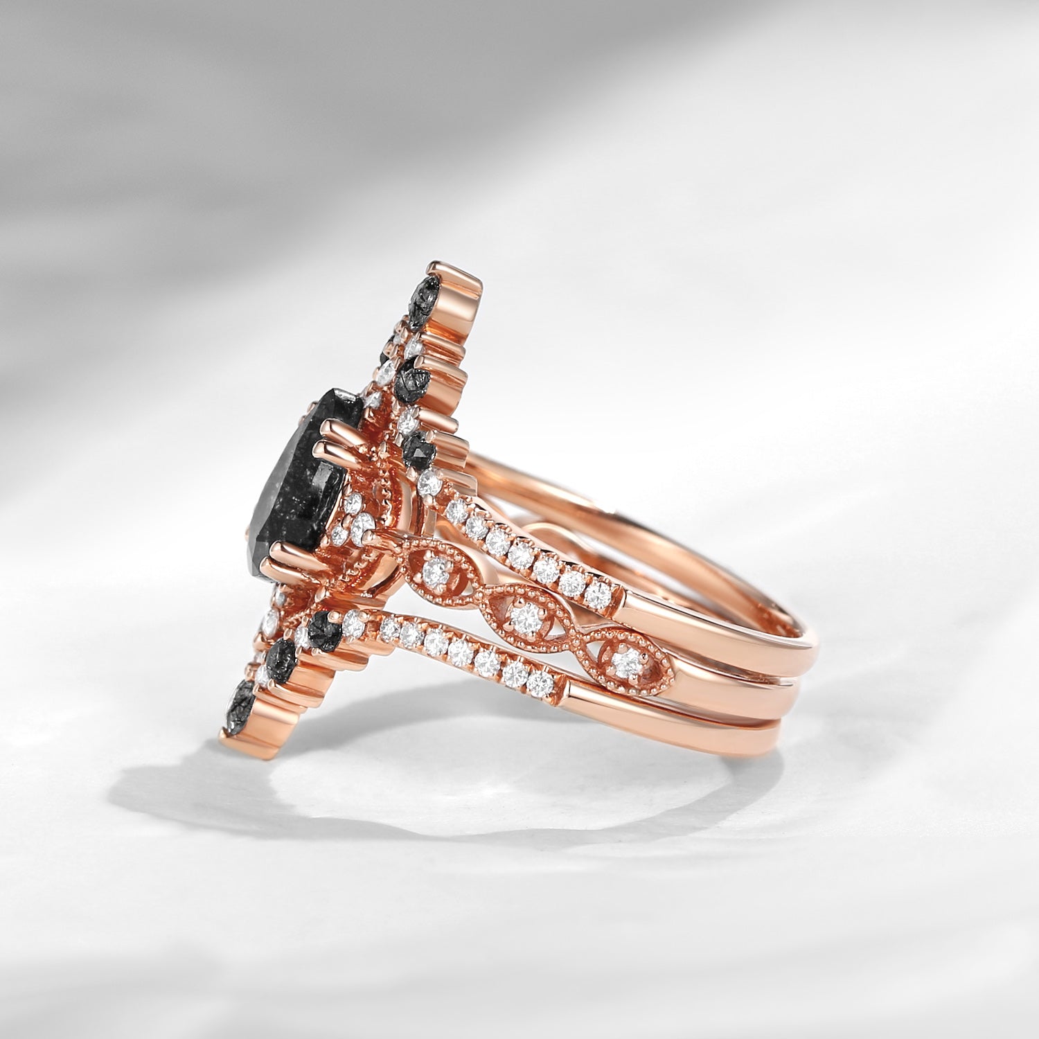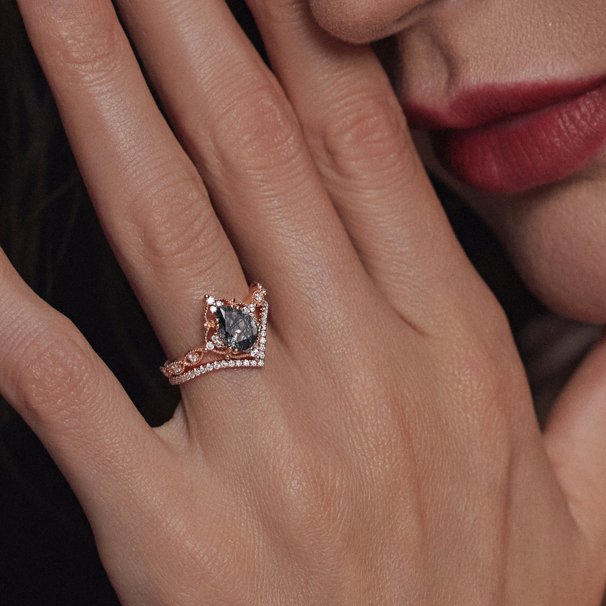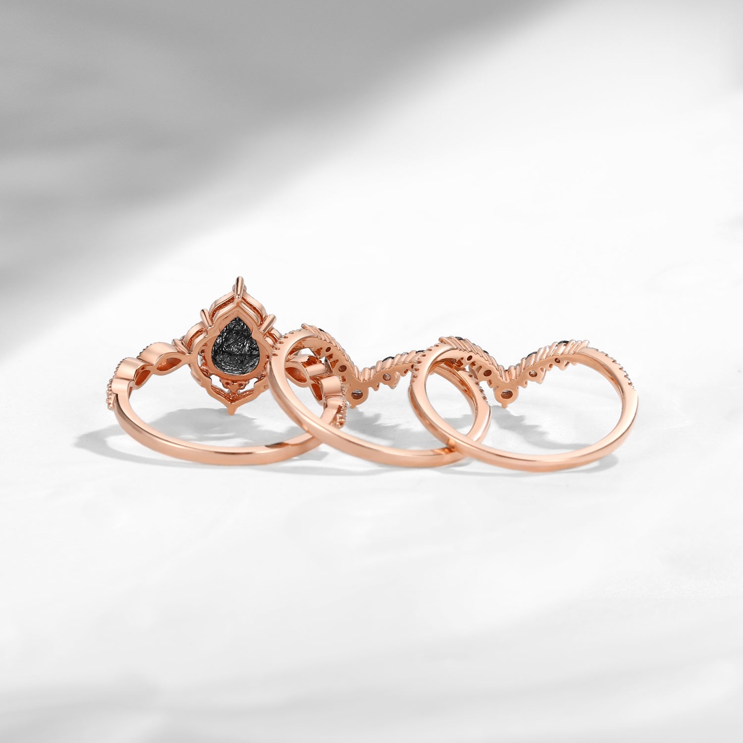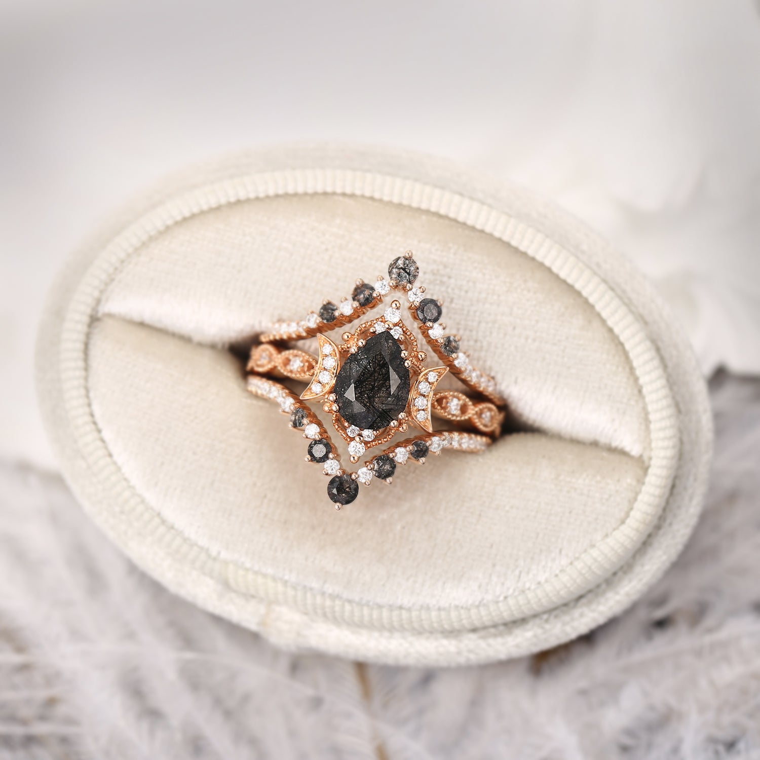 Pear Shaped Black Rutilated Quartz Antique Stacking Engagement Ring 2pcs - Evelyn