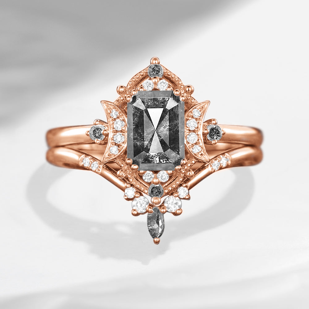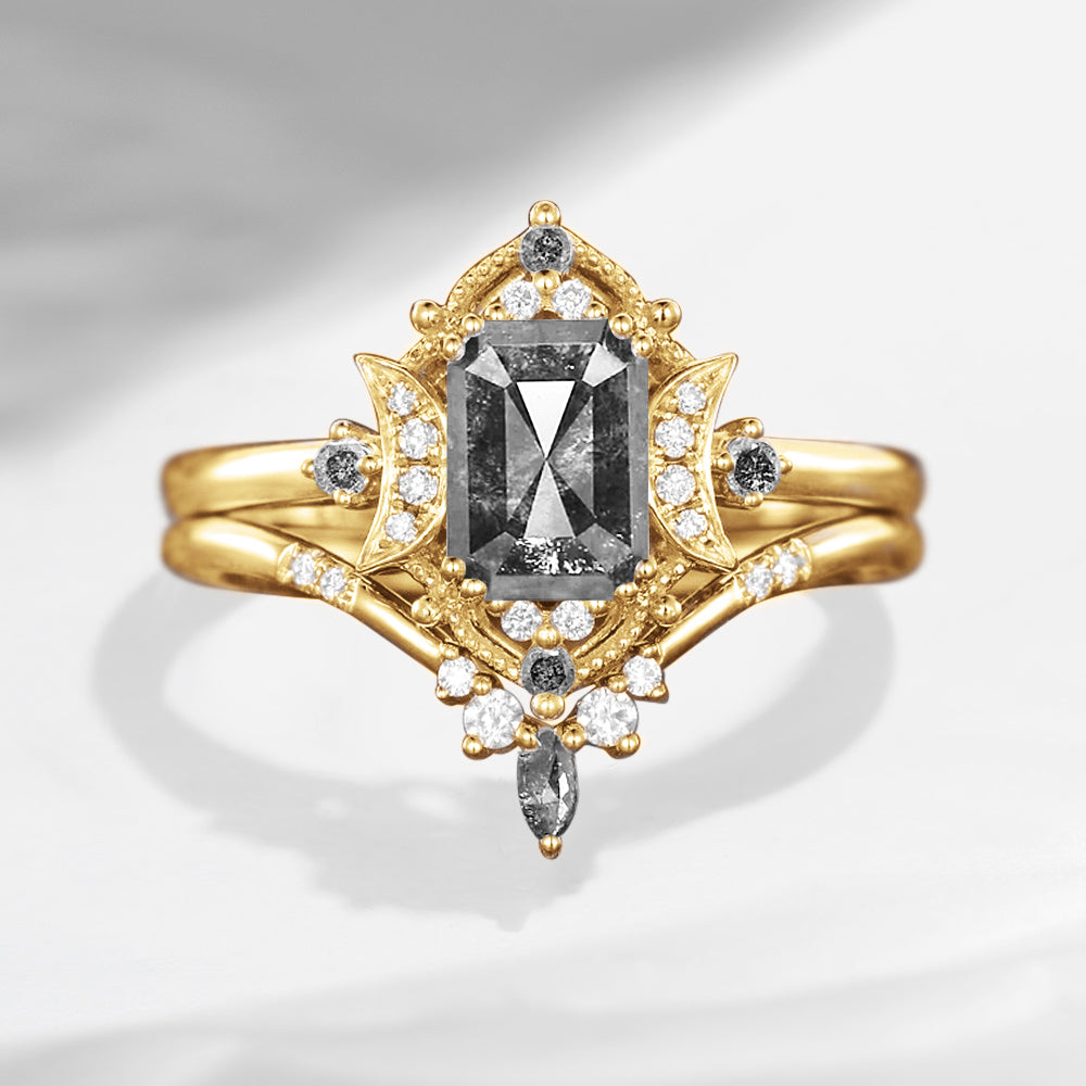 Crescent Moon | Emerald Cut Salt And Pepper Diamond Engagement Ring Set 2pcs