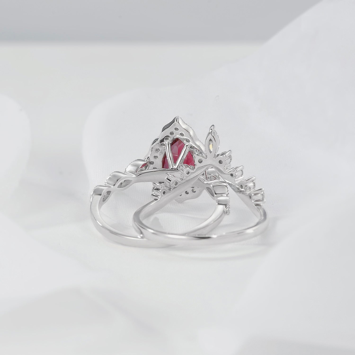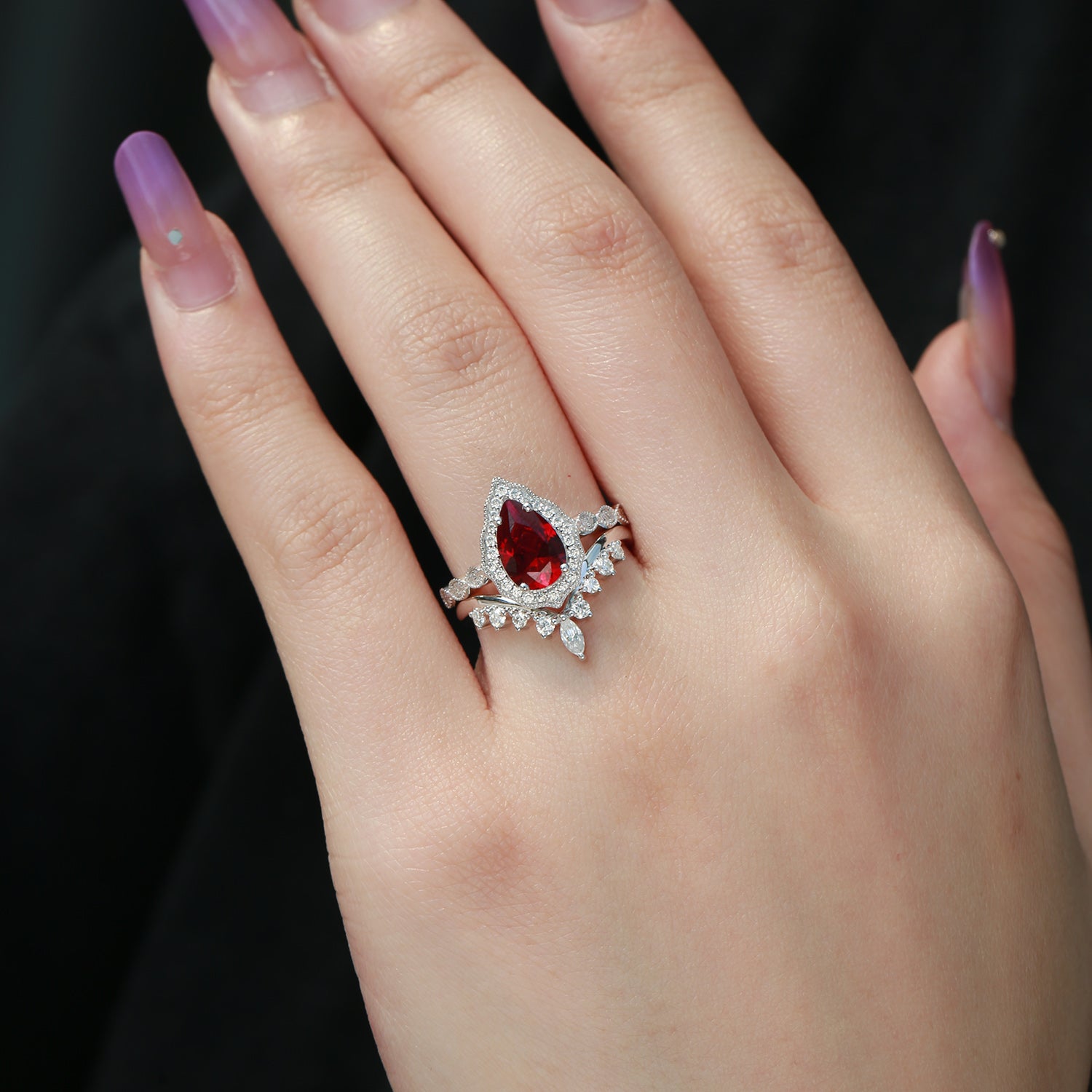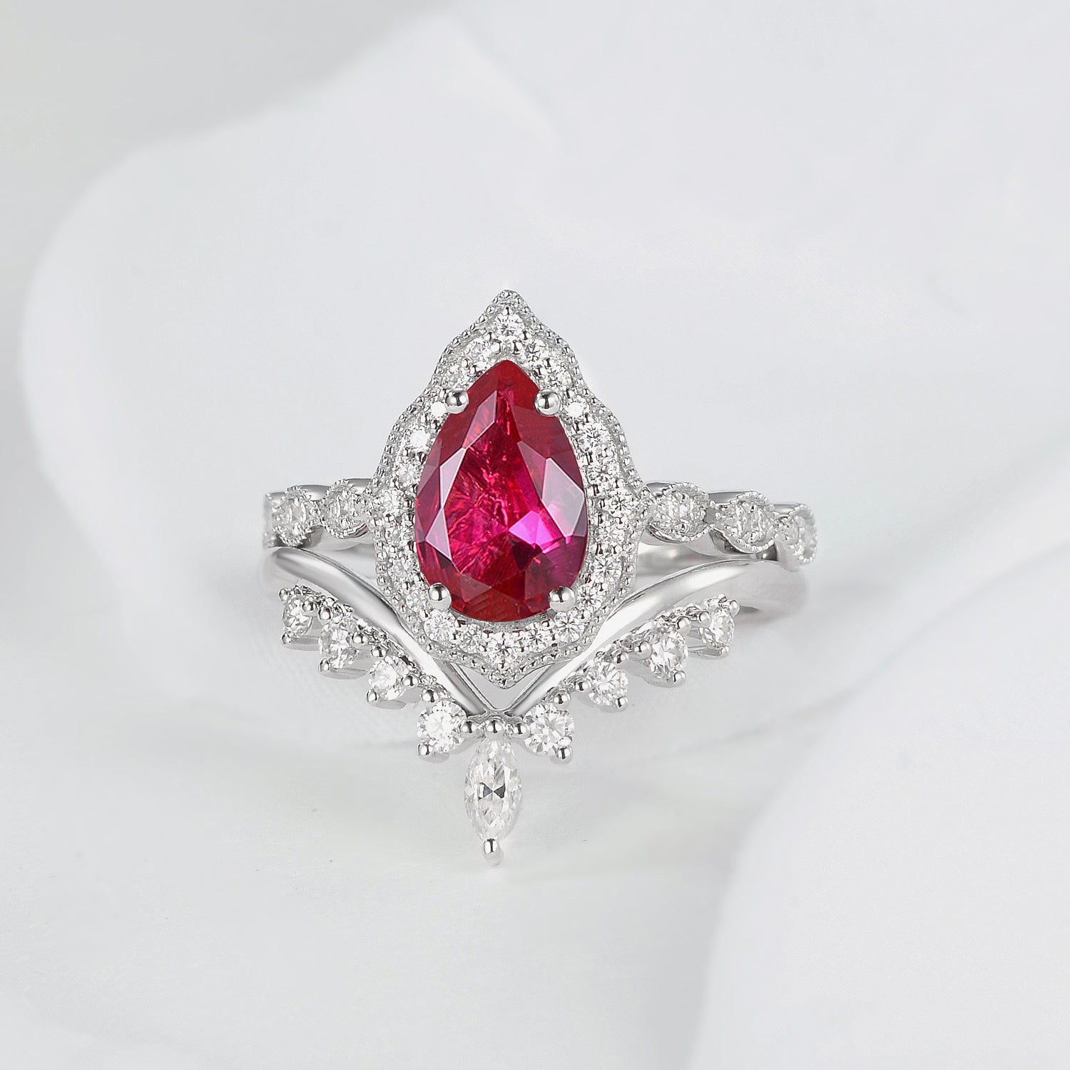 Vintage Lab Ruby Engagement Ring Set 2pcs