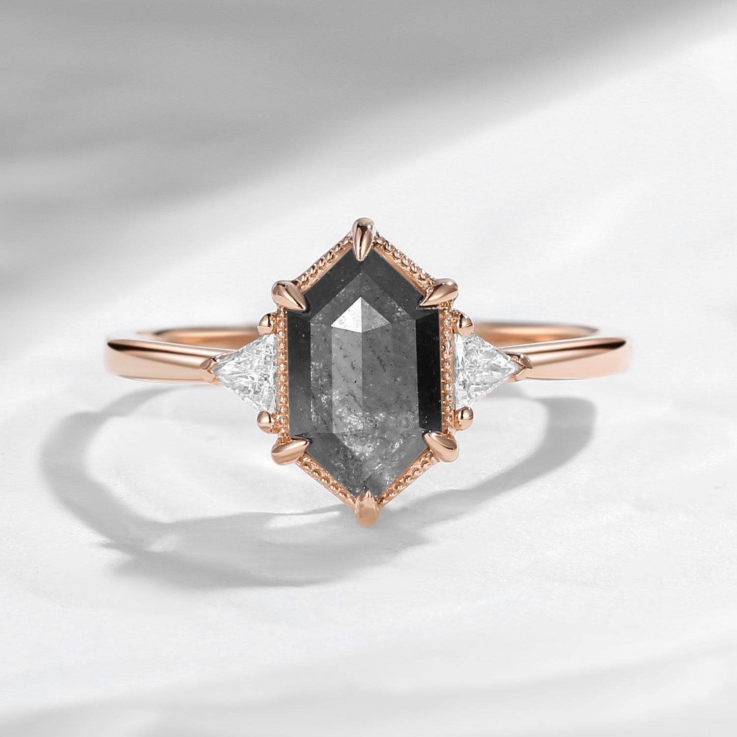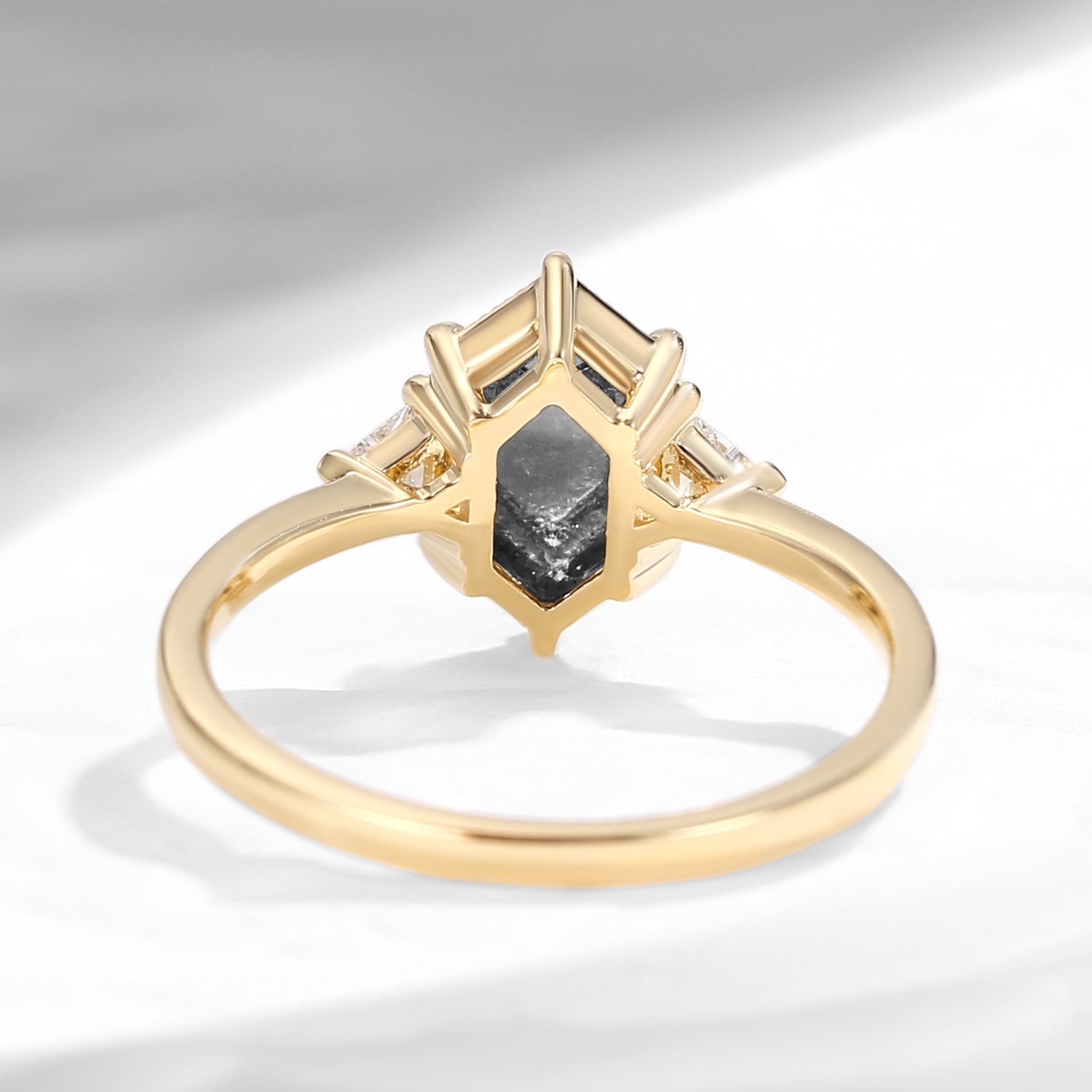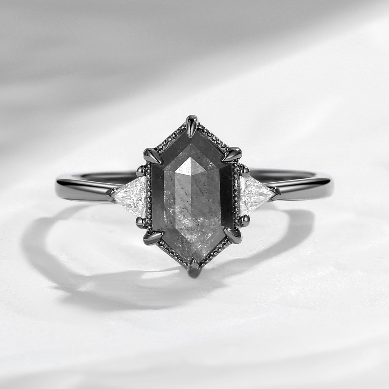 Long Hexagon Salt and Pepper Geometric Three-Stone Engagement Ring