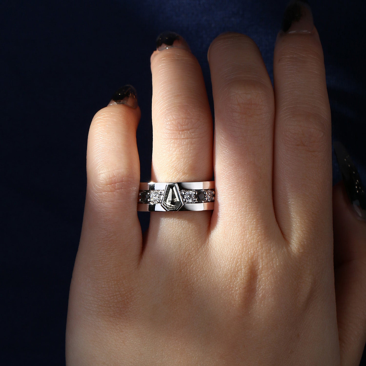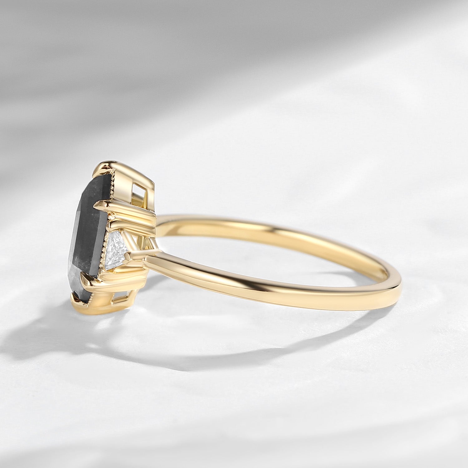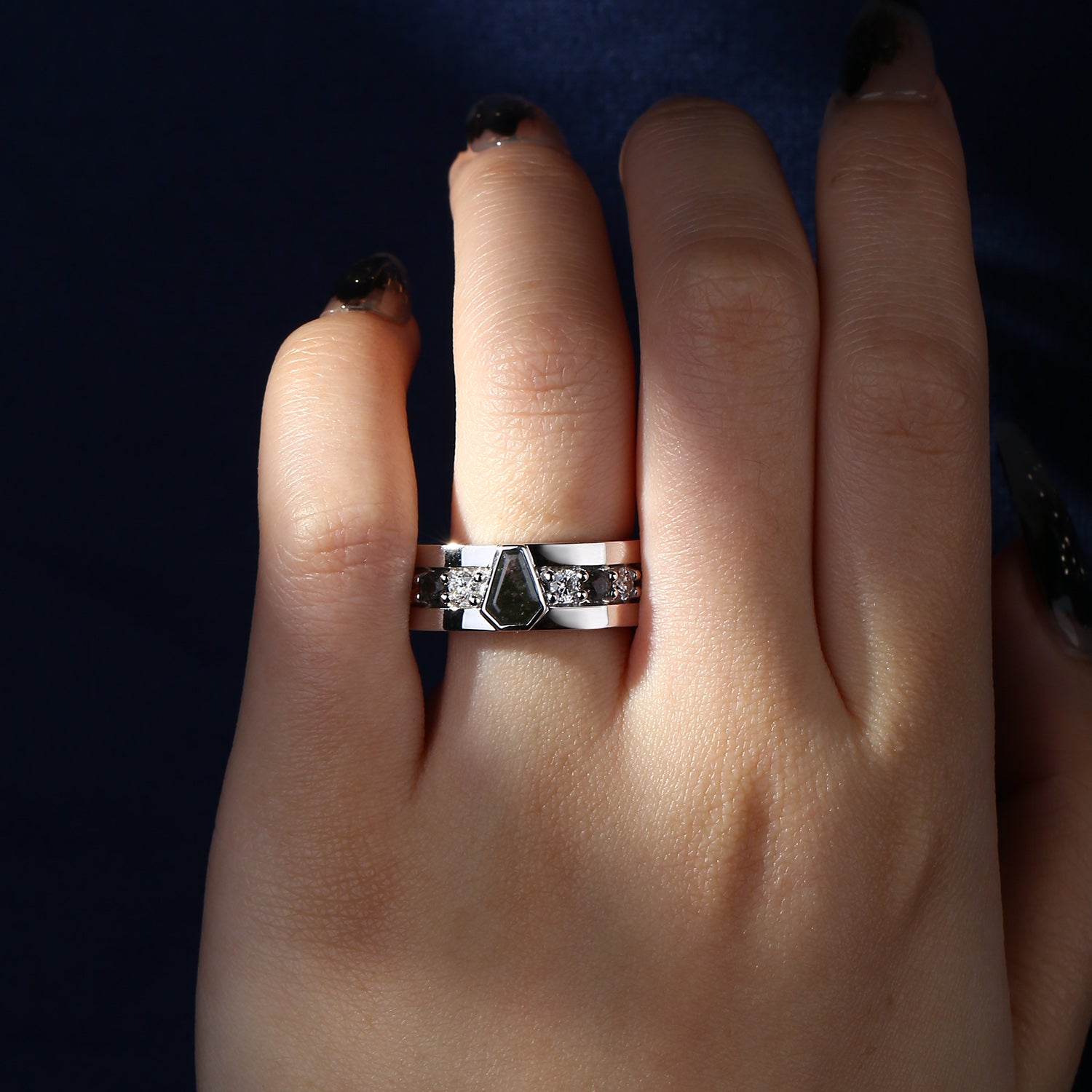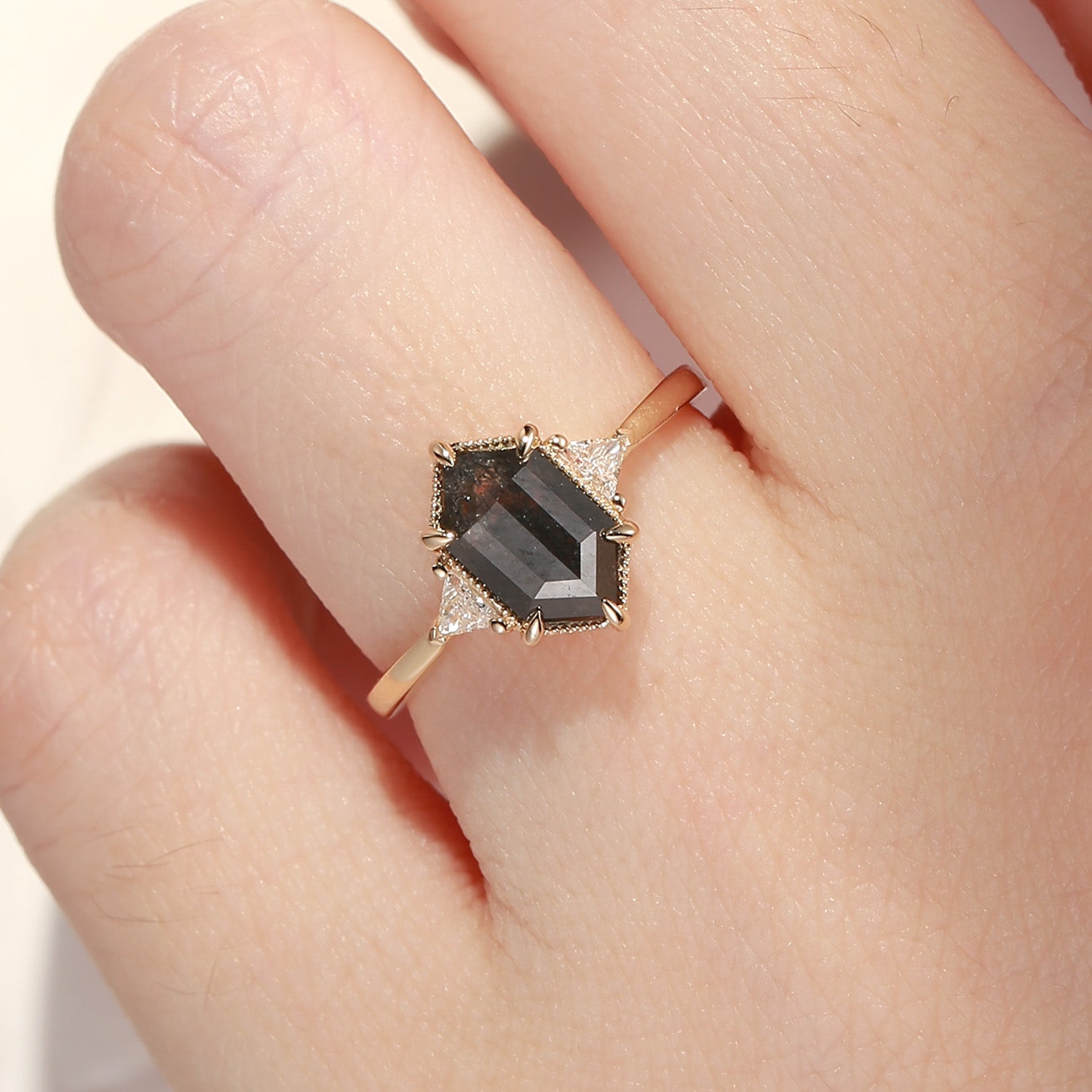 Long Hexagon Salt and Pepper Geometric Three-Stone Engagement Ring