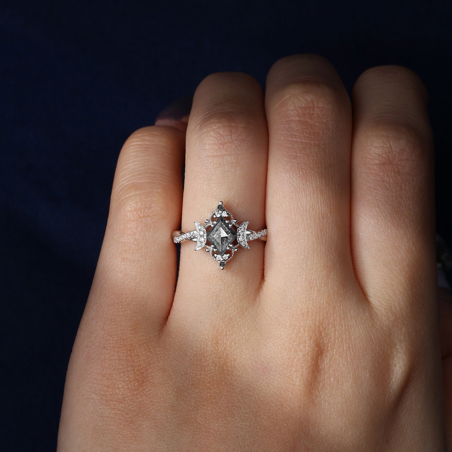 Crescent Moon | Coffin Cut Salt And Pepper Diamond Twisted Engagement Ring