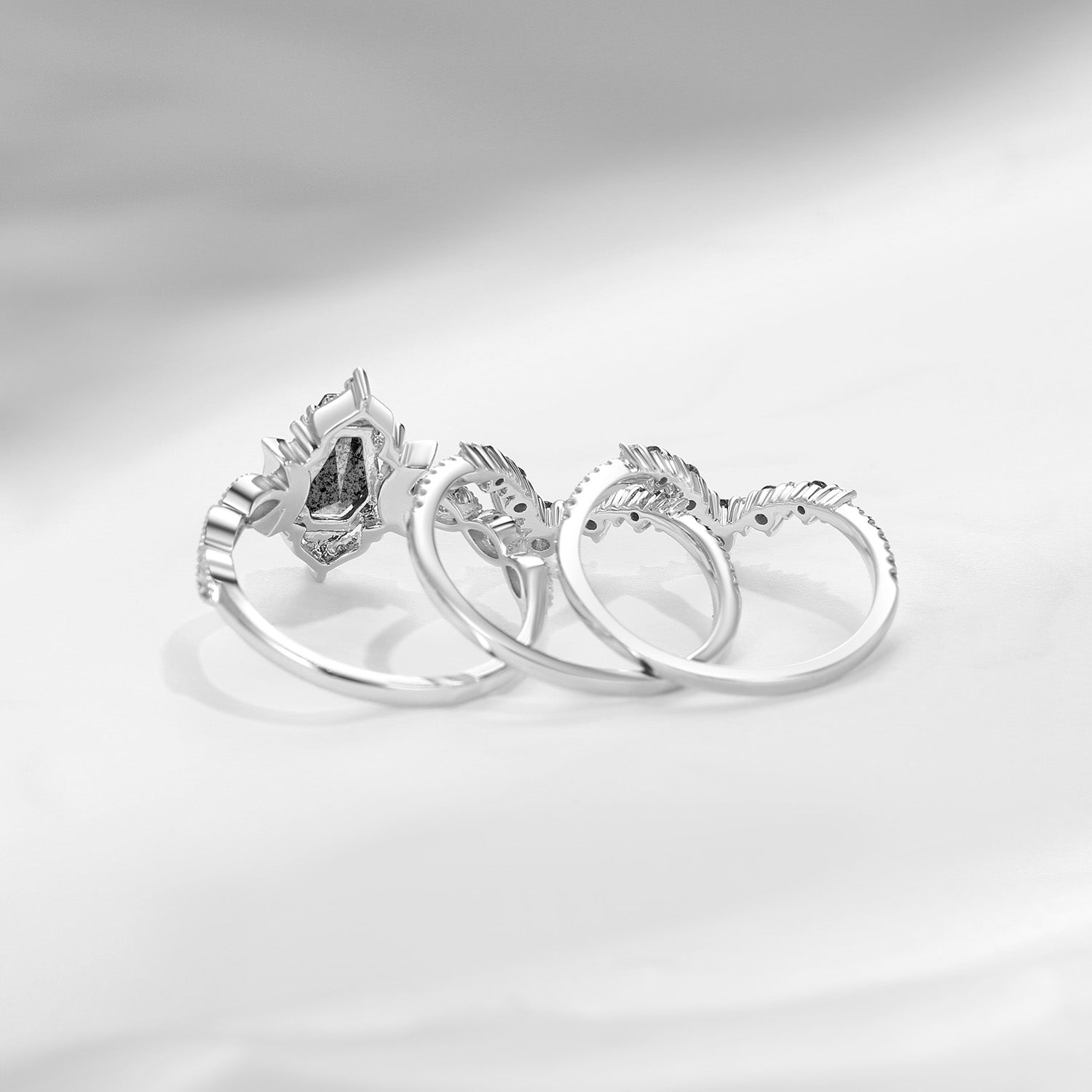 Crescent Moon | Coffin Cut Salt and Pepper Diamond 'Extravanganza' Engagement Ring Set 3pcs