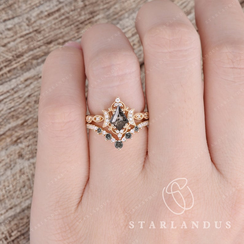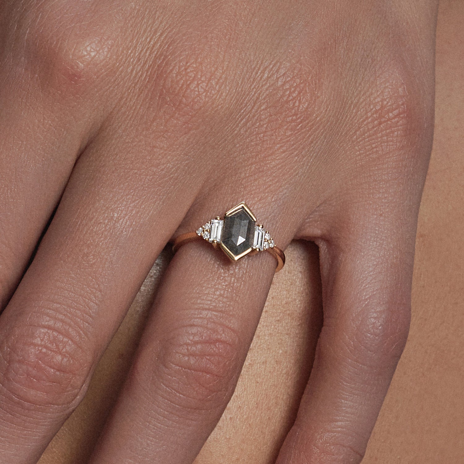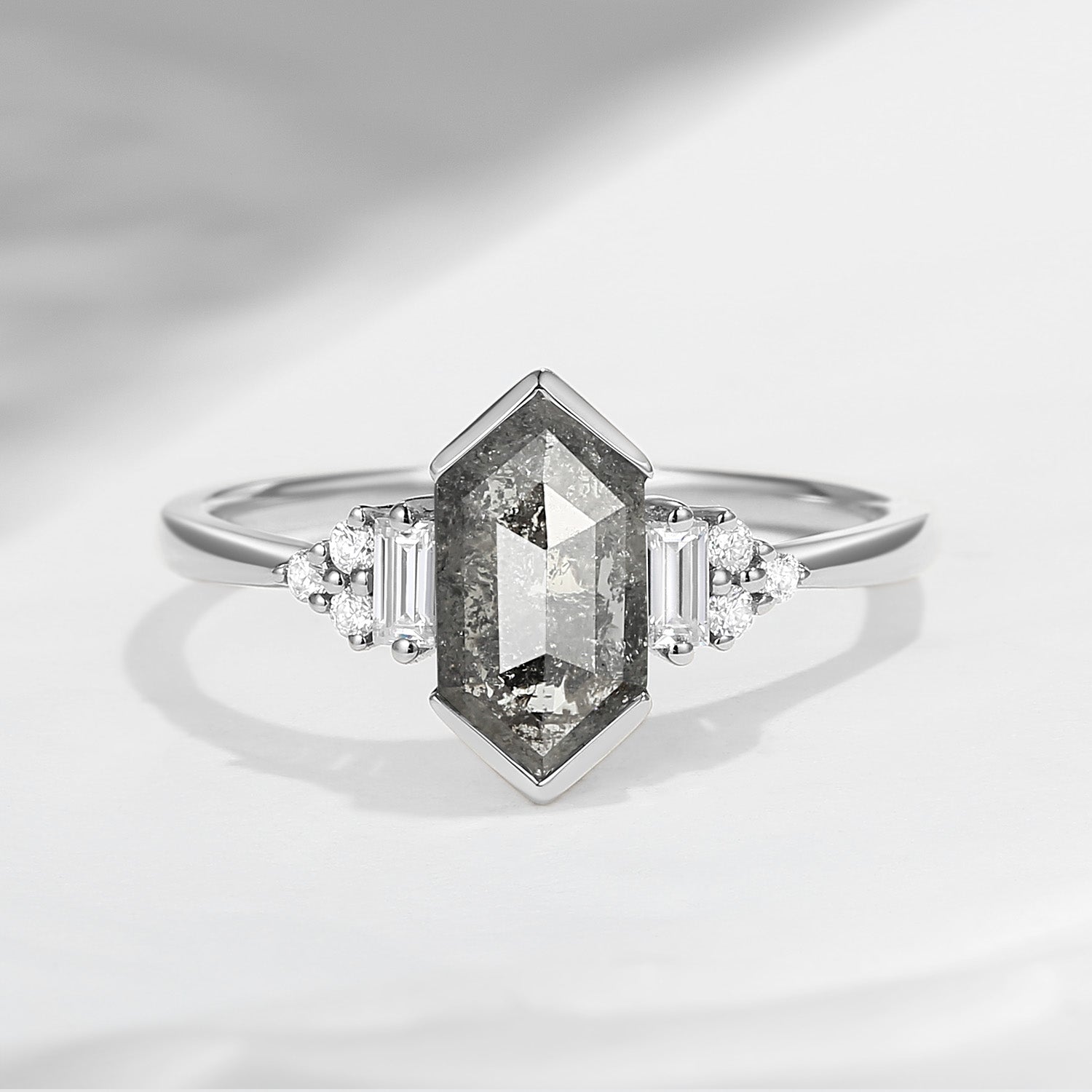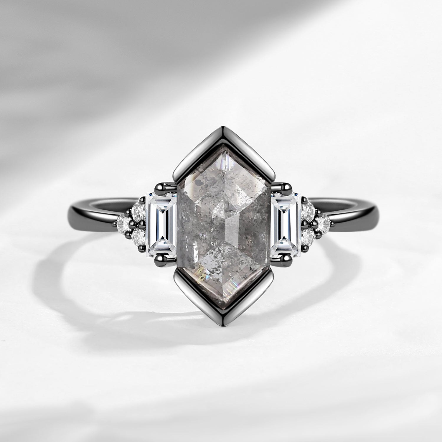 Crescent Moon | Hexagon Salt And Pepper Diamond Engagement Ring 2pcs