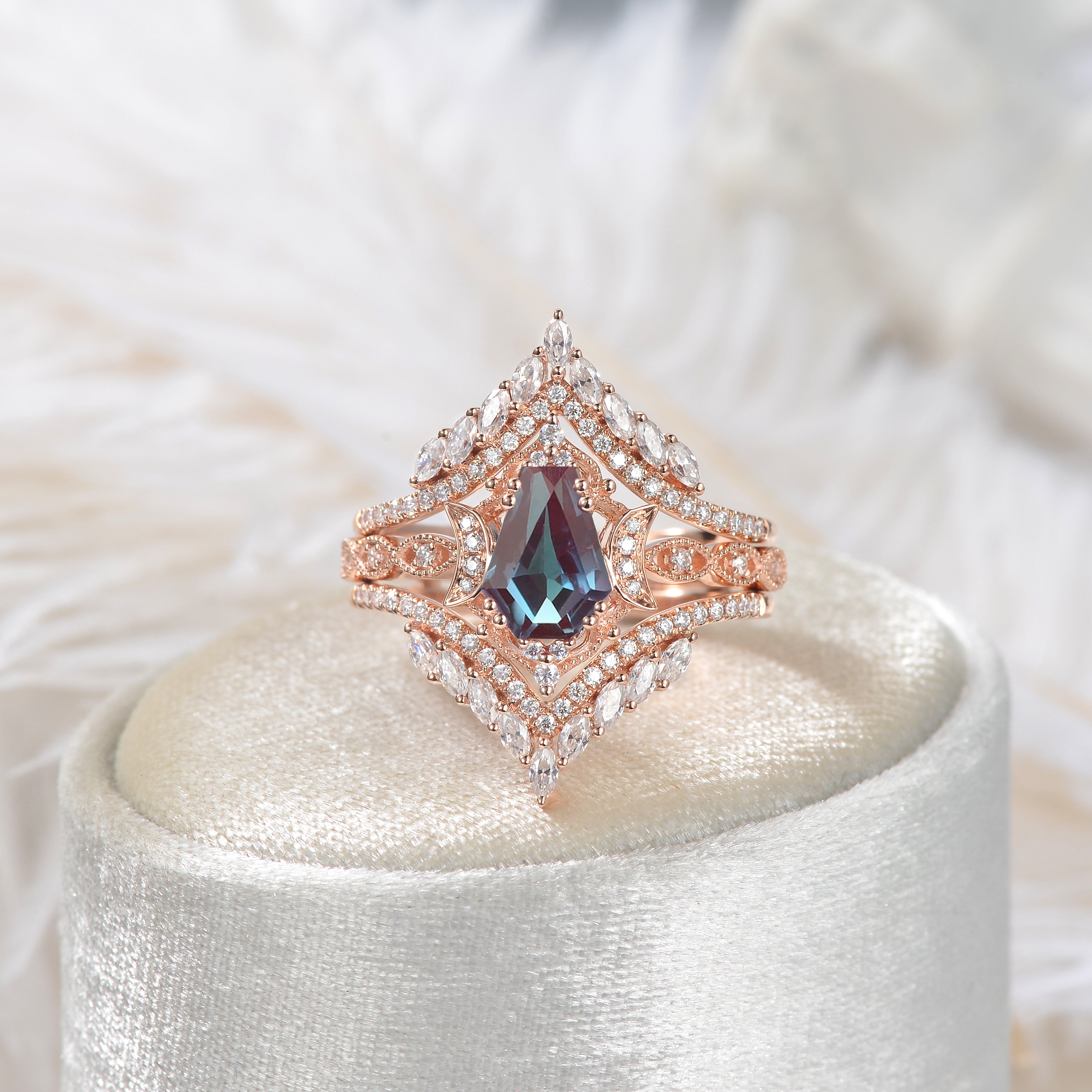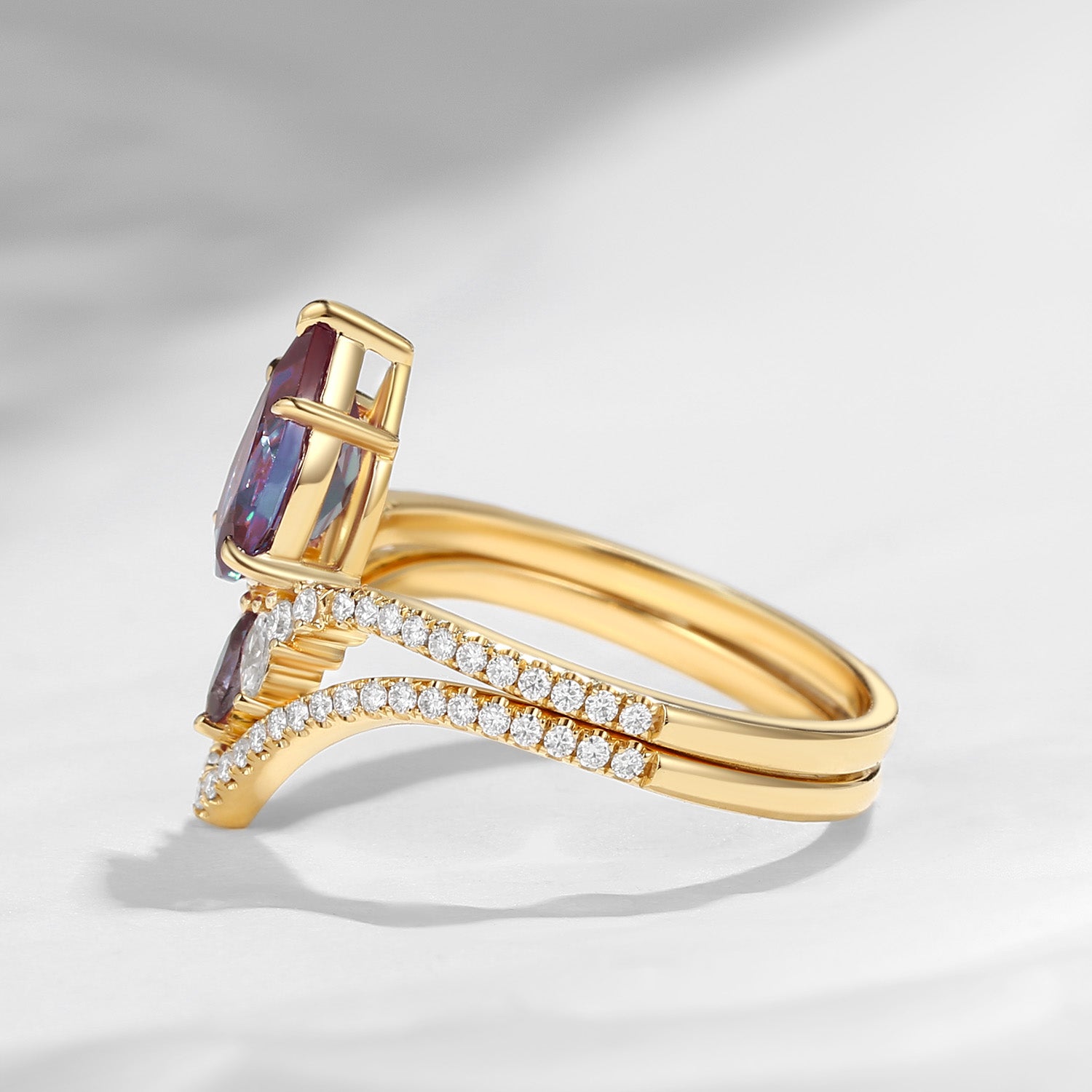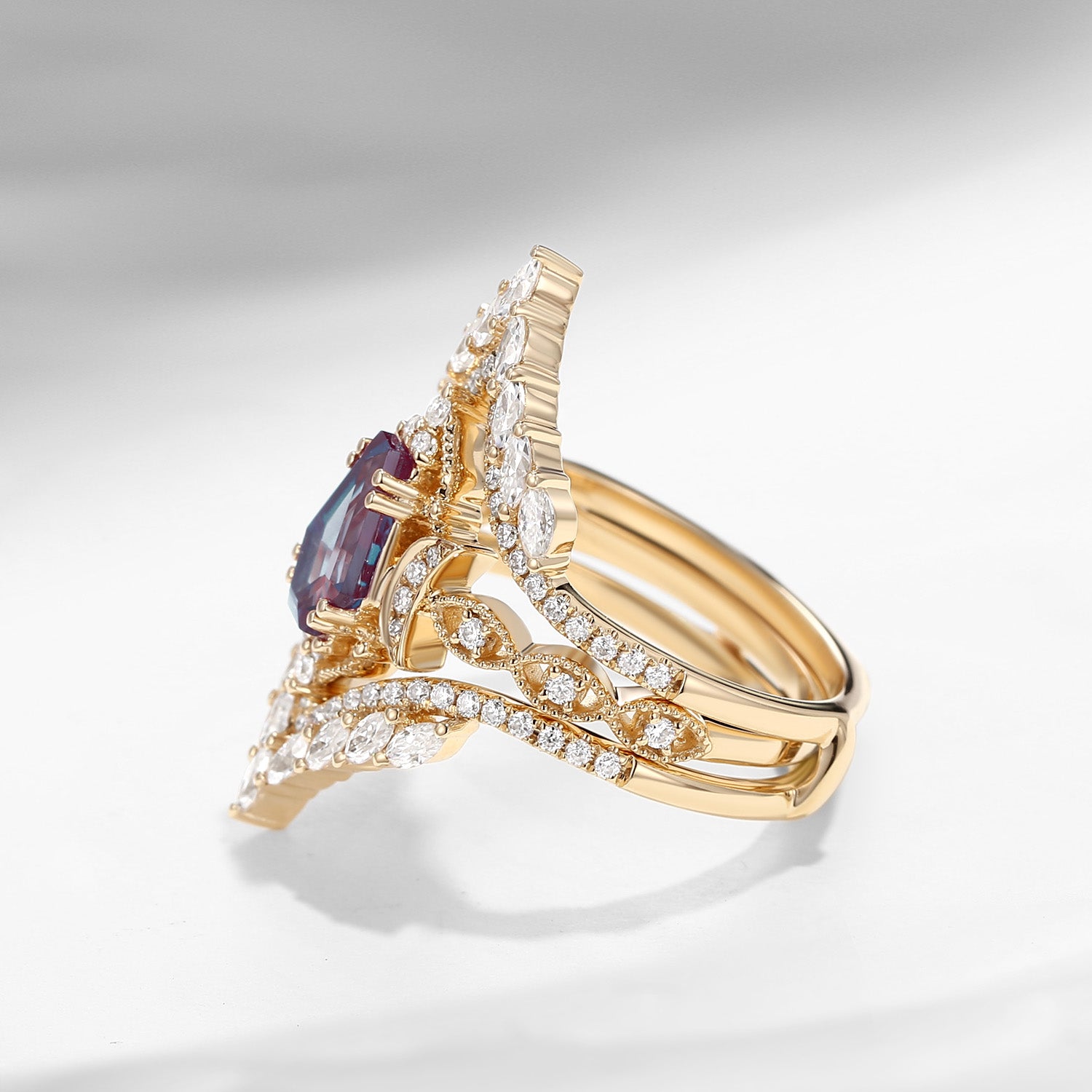 Crescent moon | Vintage Inspired Oval Alexandrite Engagement Ring Set 3PCS 18K