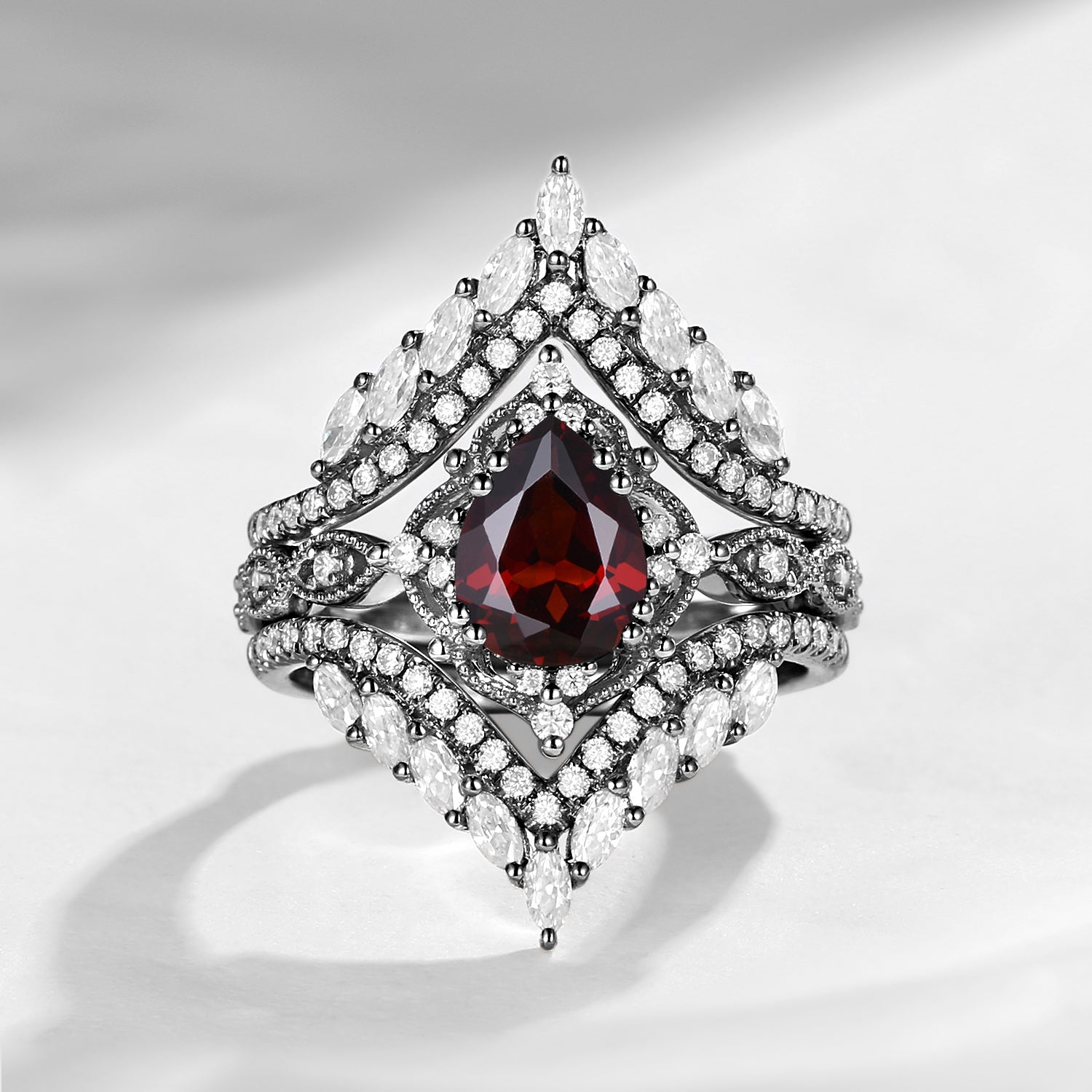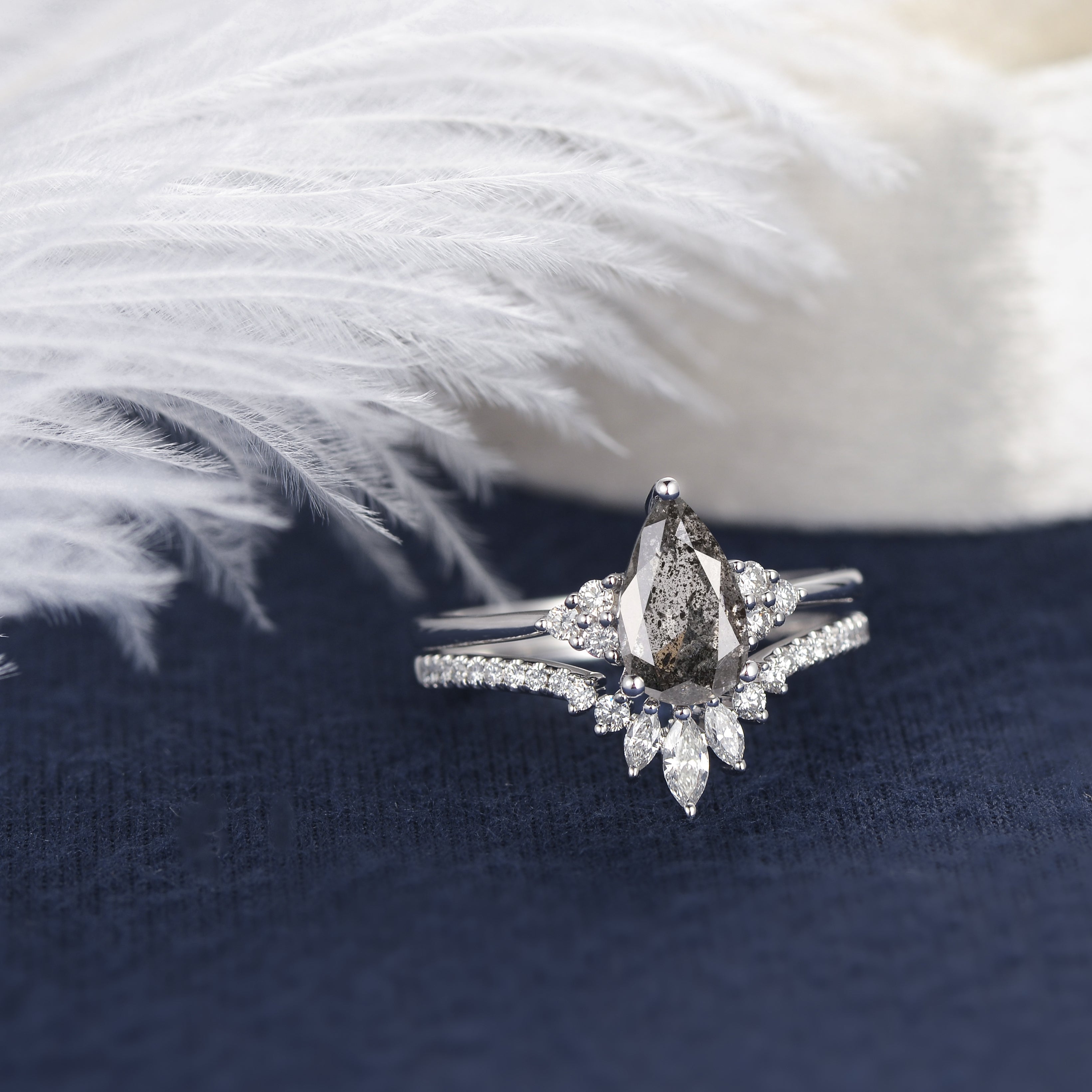 Pear Cut Salt and Pepper Diamond Cluster Engagement Ring Set 2pcs - Vivian