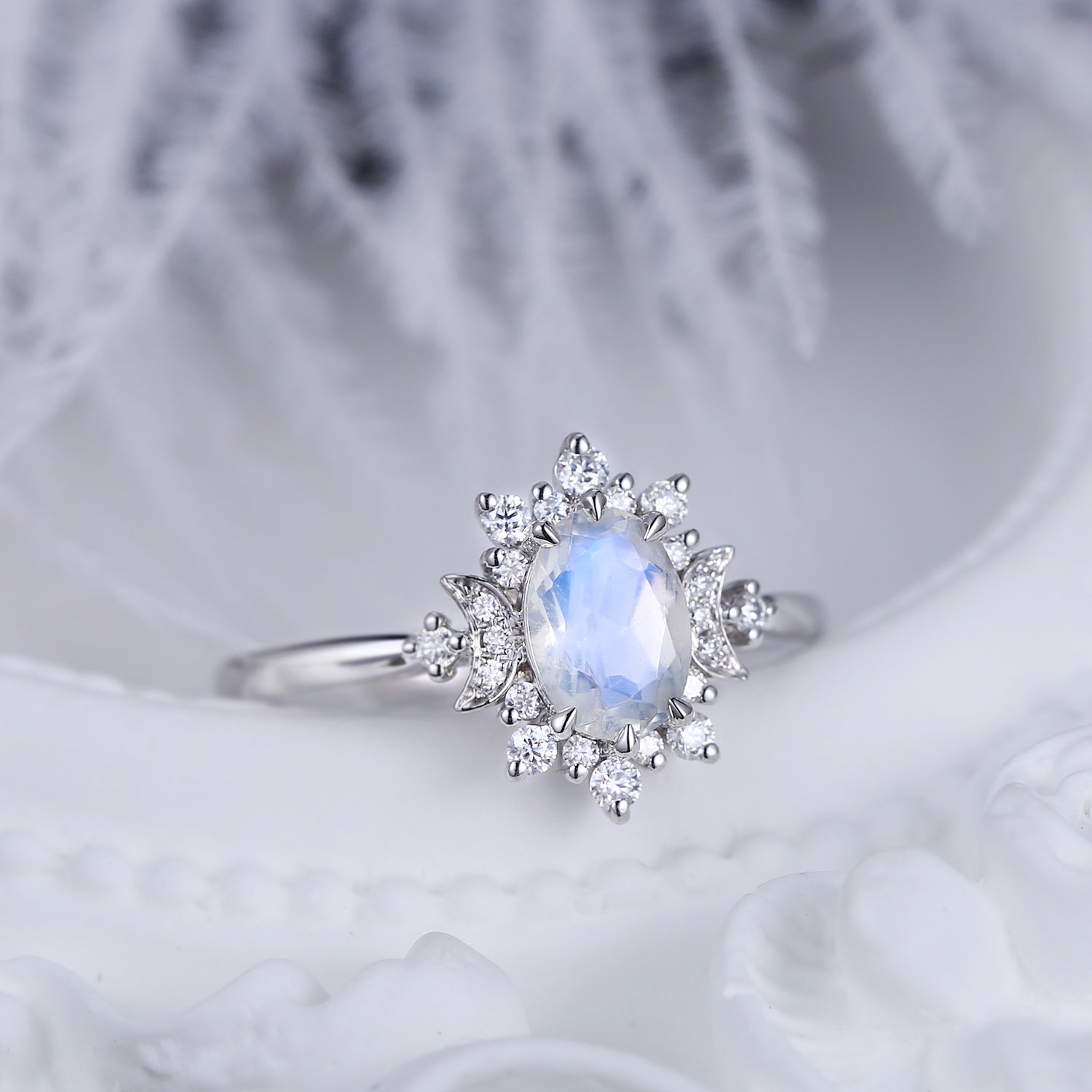 Crescent Moon | Oval Snowflake Halo Moonstone Engagement Ring - Moonlight In Vermont