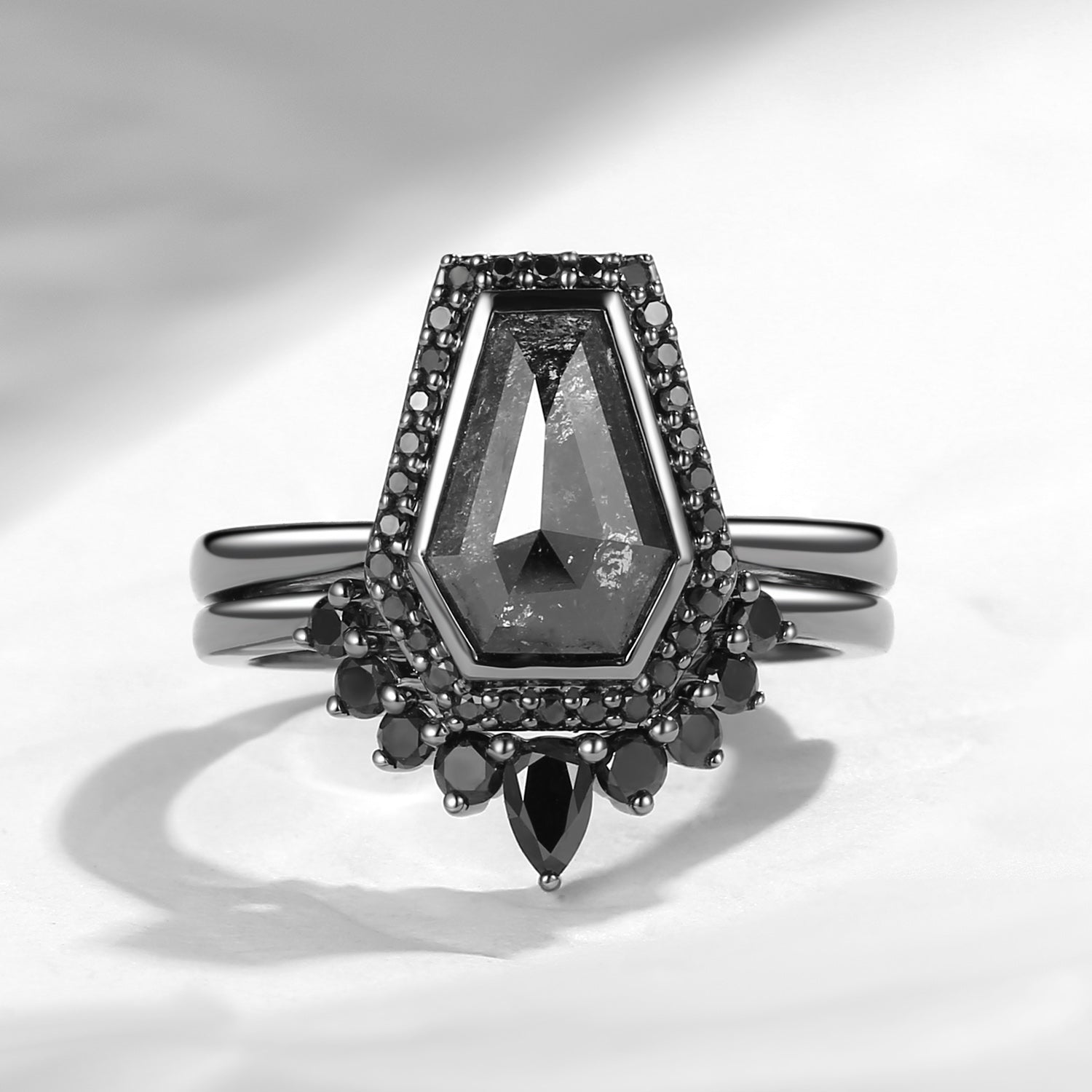 Coffin Cut Salt And Pepper Diamond Engagement Ring Set 2pcs - Goth Girl