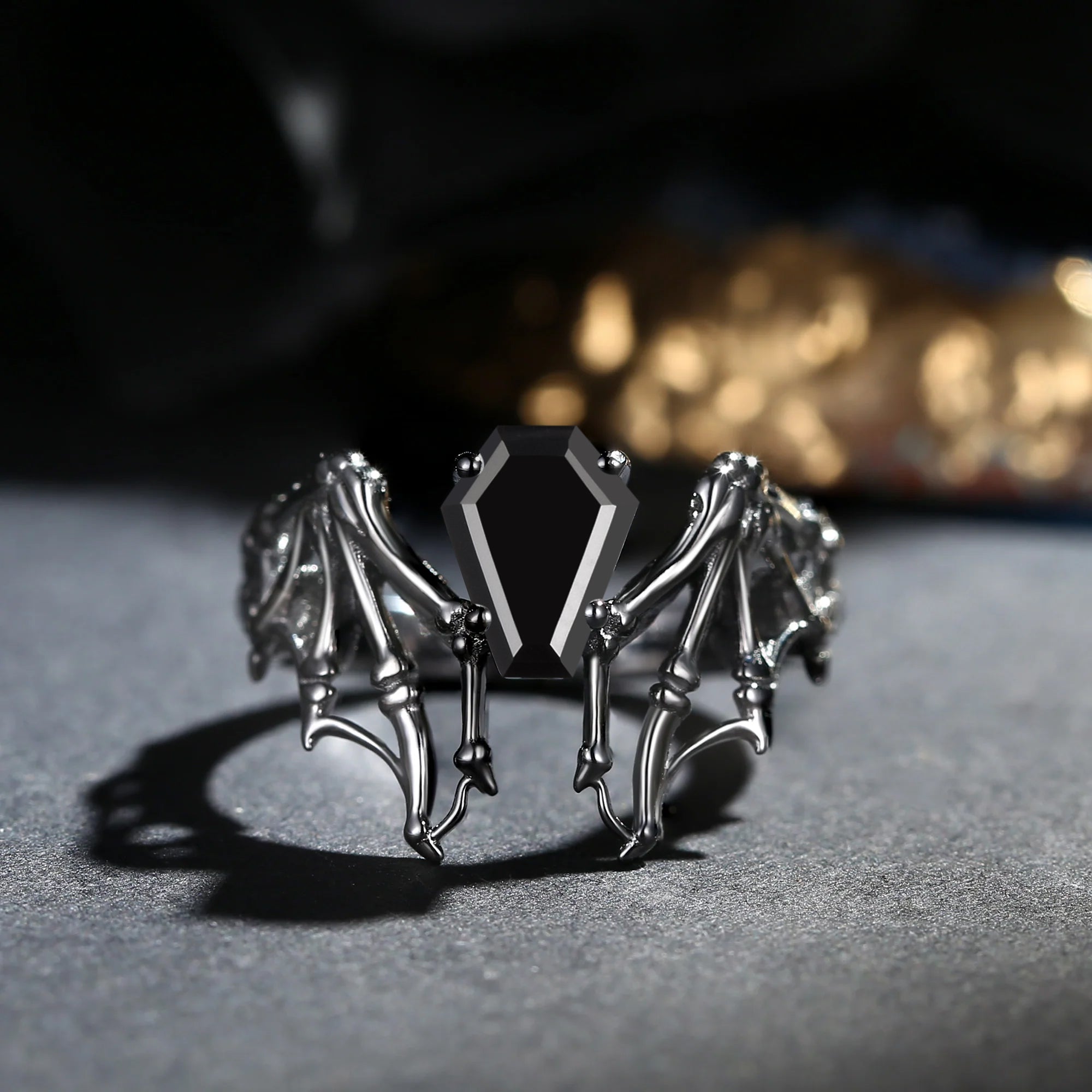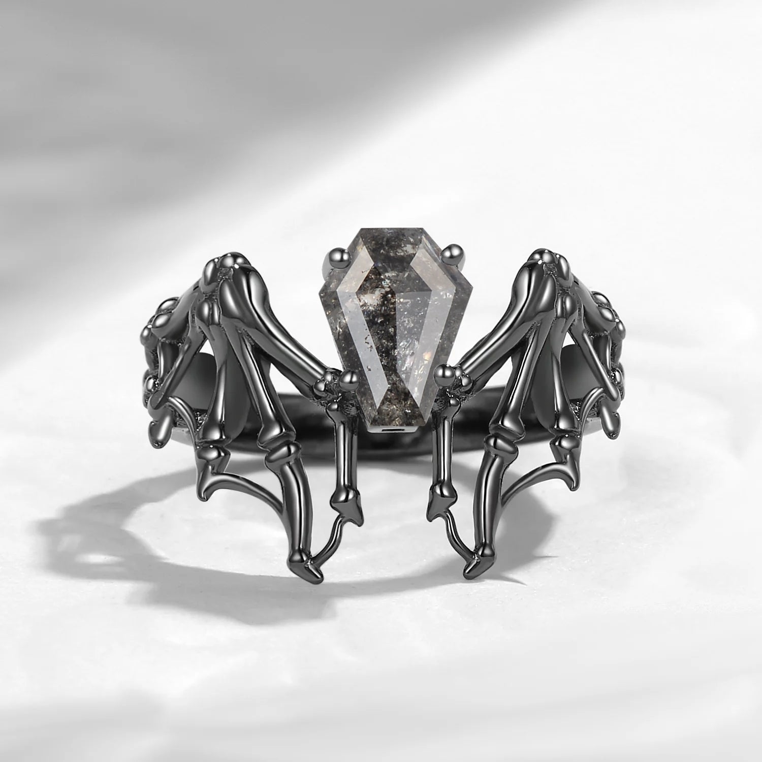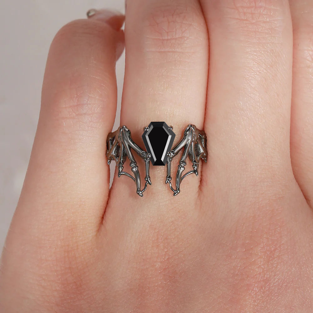 Garnet Coffin Cut Vintage Inspired Black Gold Engagement Ring - Bat Ring