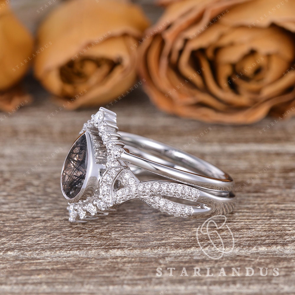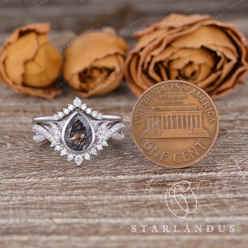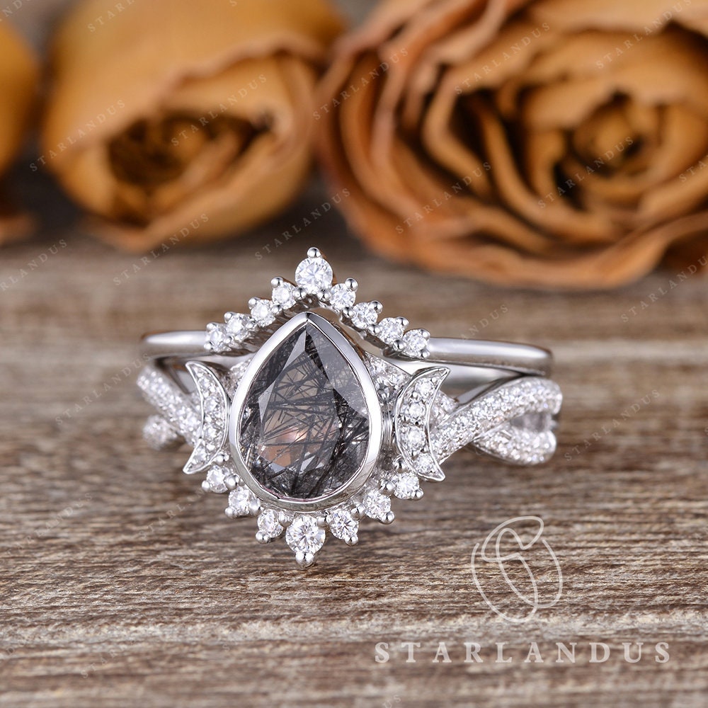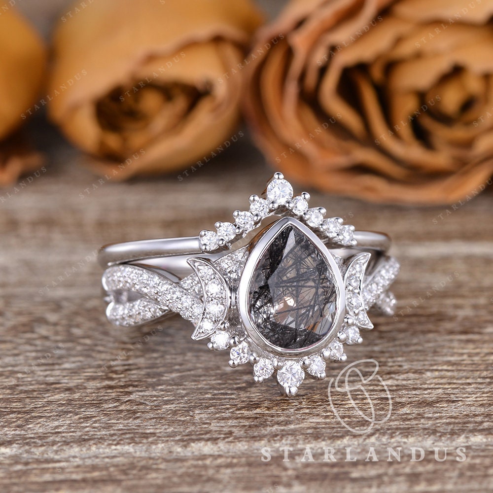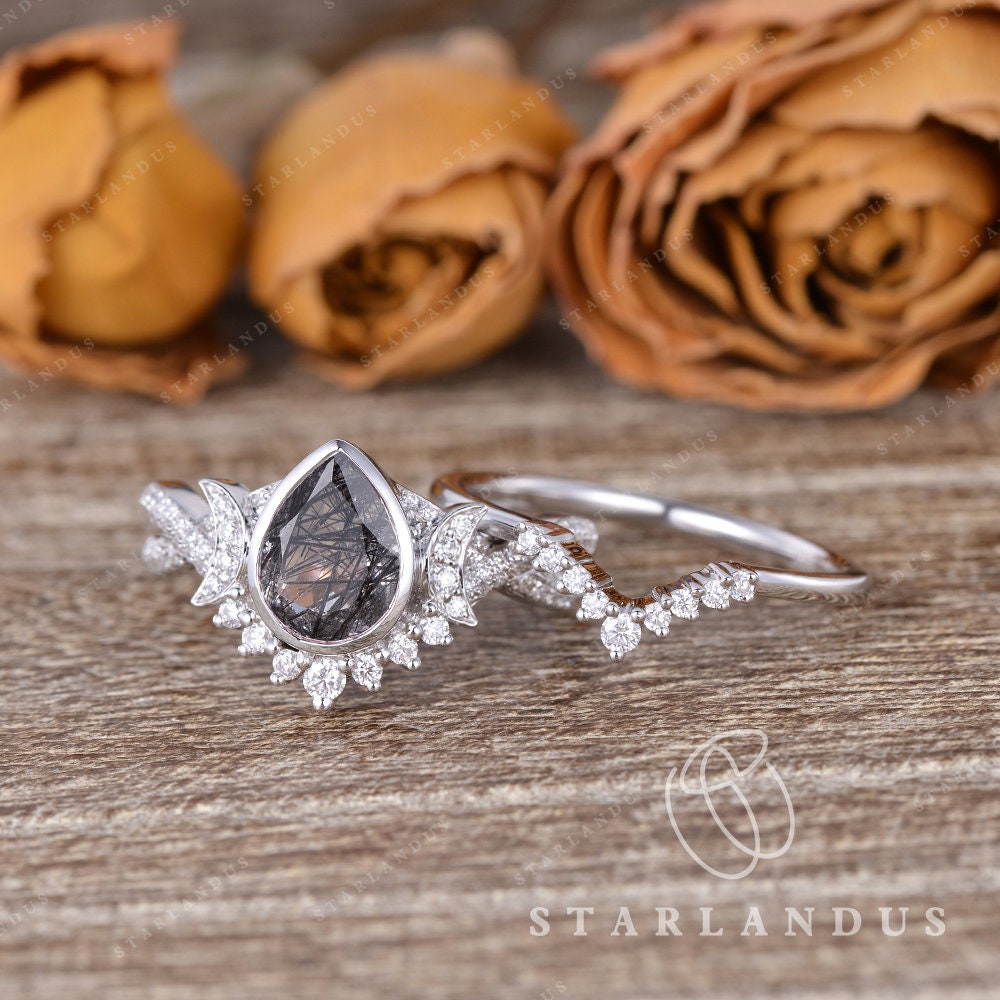 Crescent Moon | Pear Shaped Black Rutilated Quartz Engagement Ring Set 2pcs 18k - Waning Moon