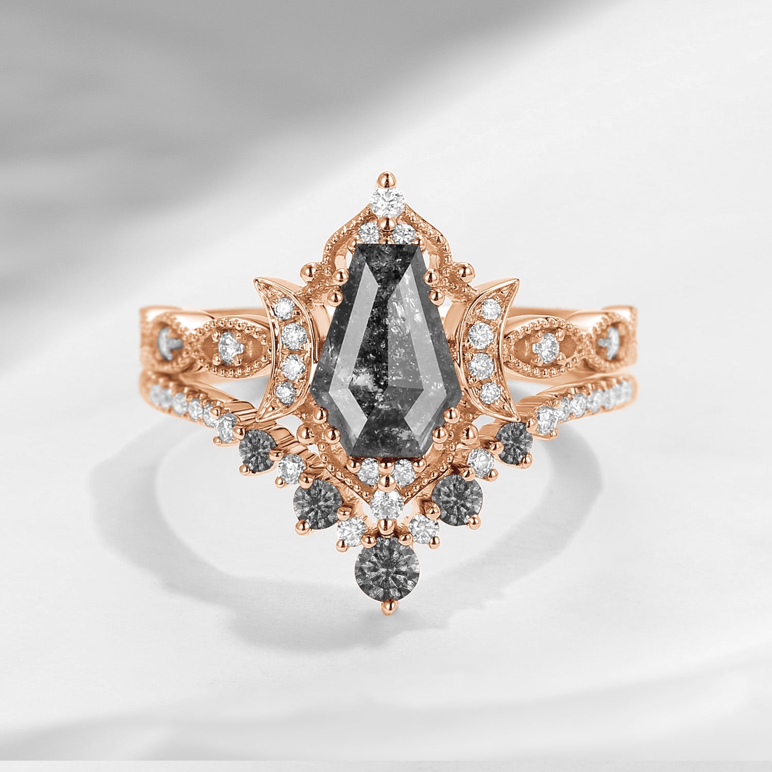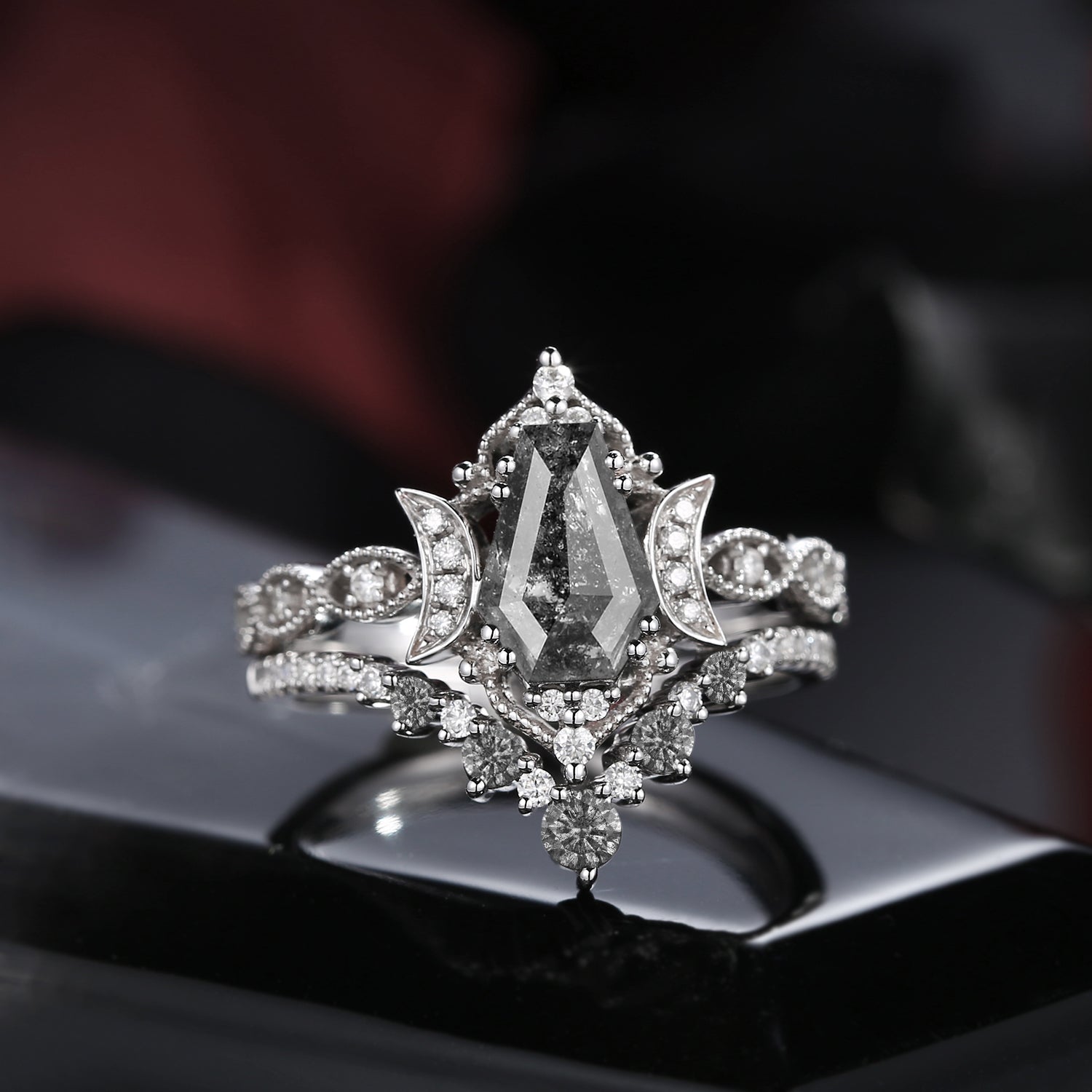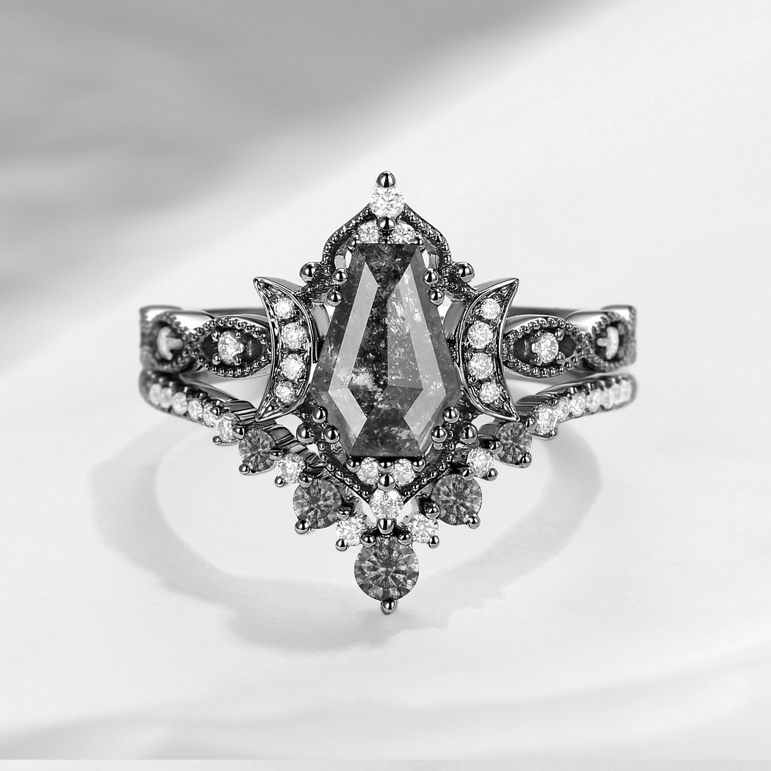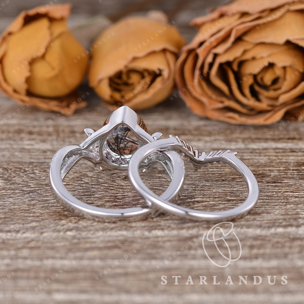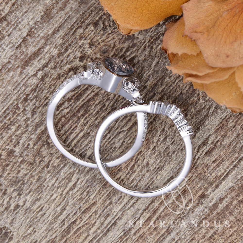 Crescent Moon | Pear Shaped Black Rutilated Quartz Engagement Ring Set 2pcs 18k - Waning Moon