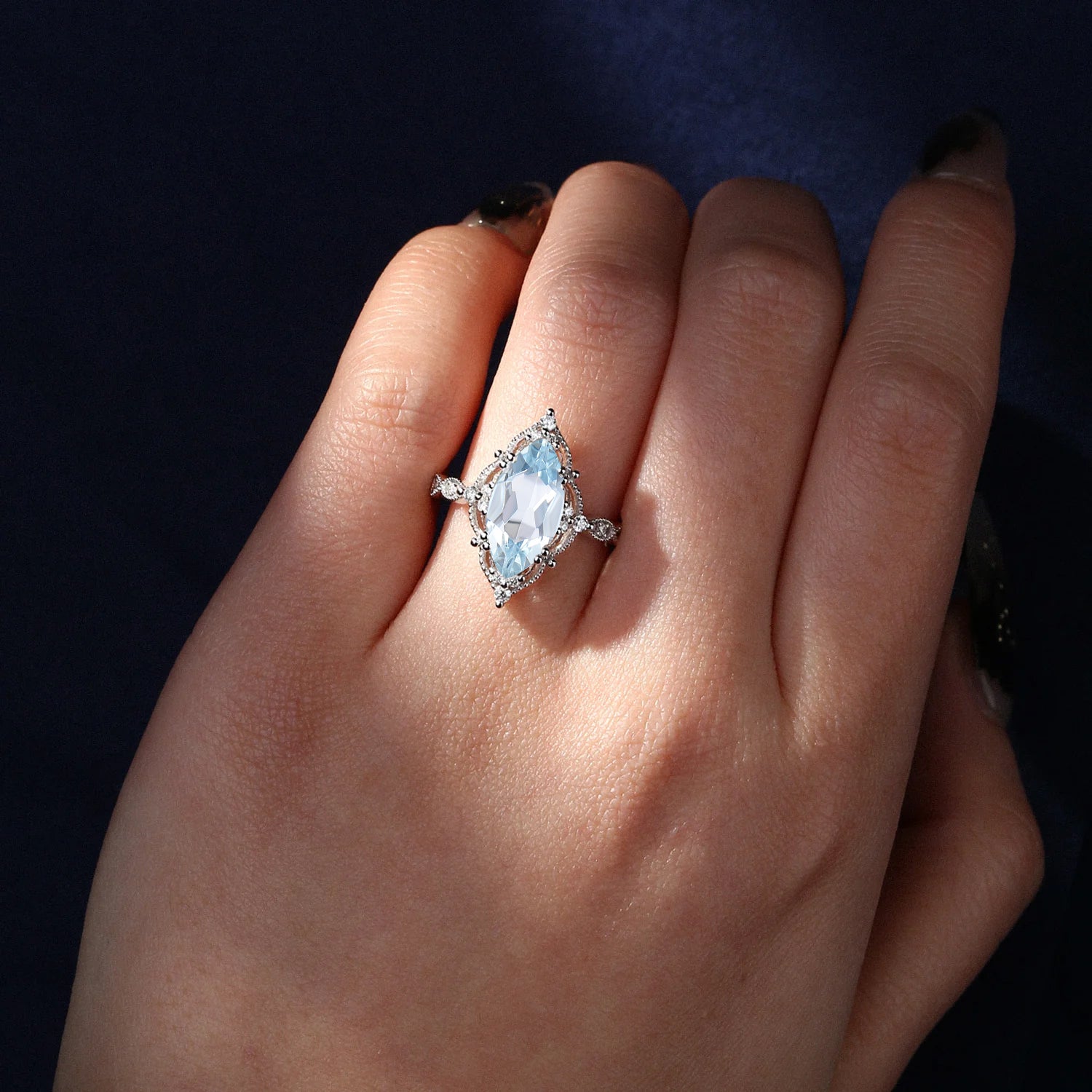 18K Unique Marquise Aquamarine Vintage Inspired Engagement Ring
