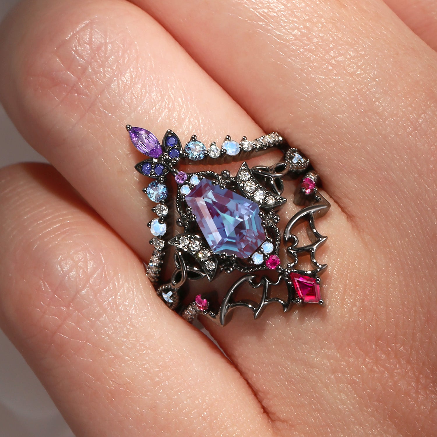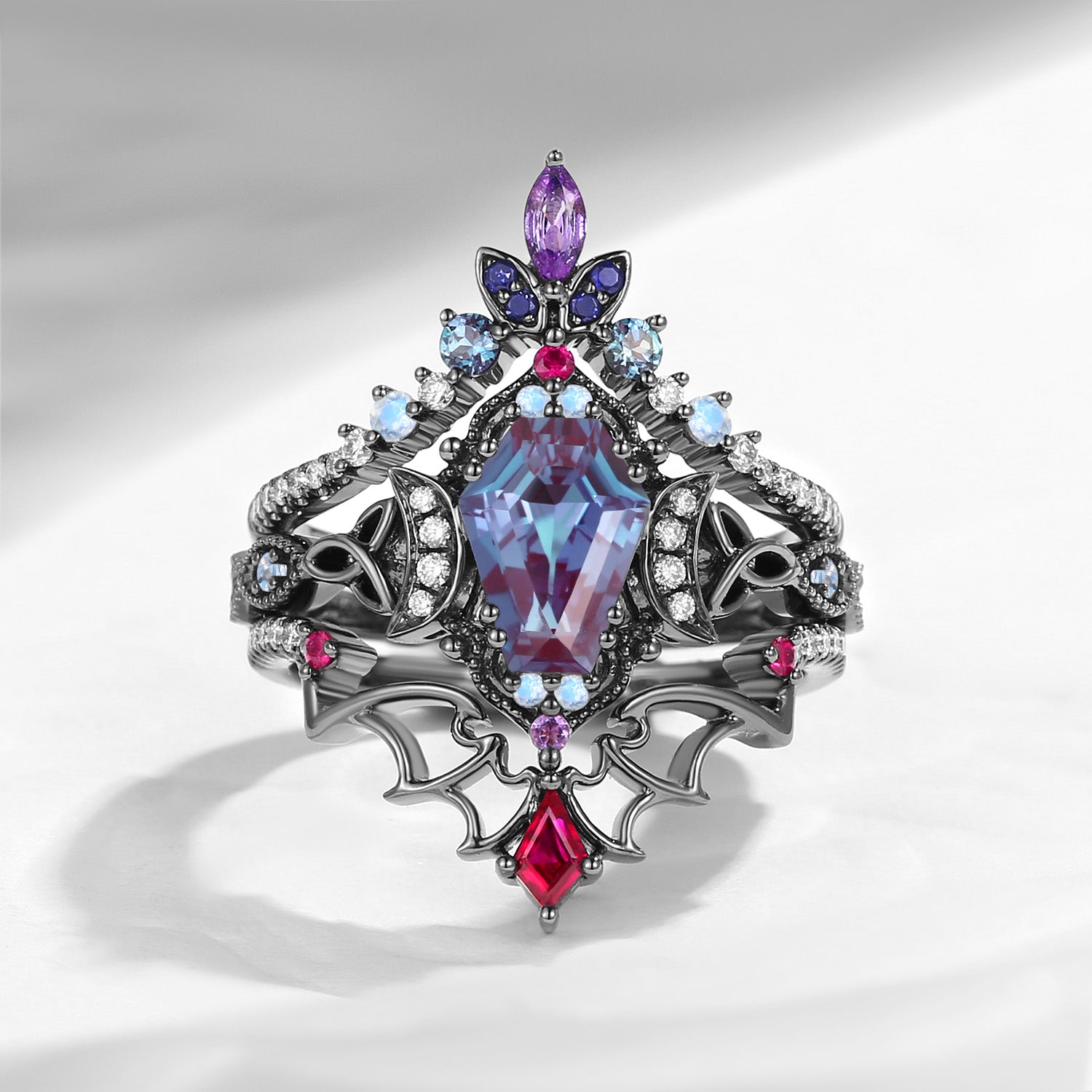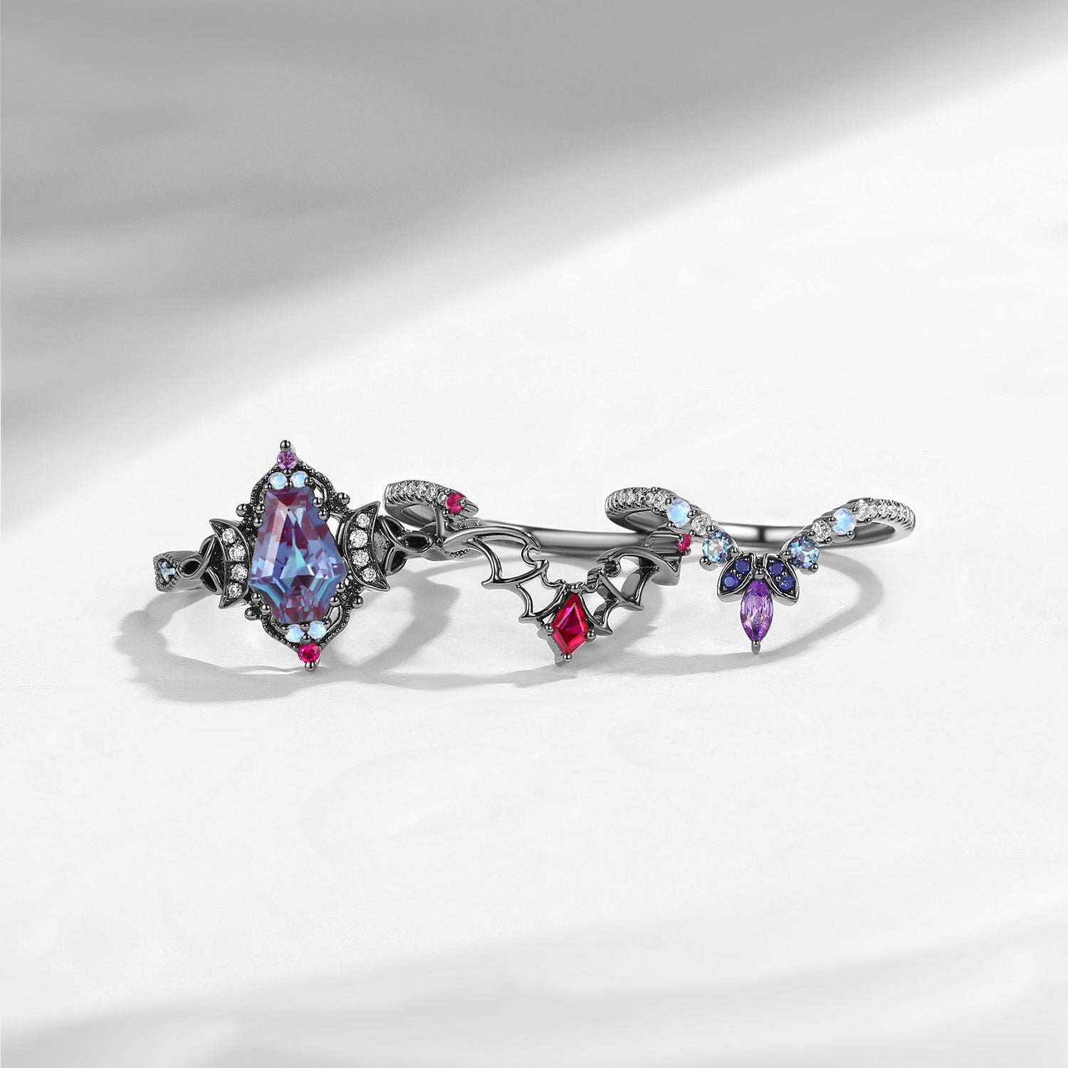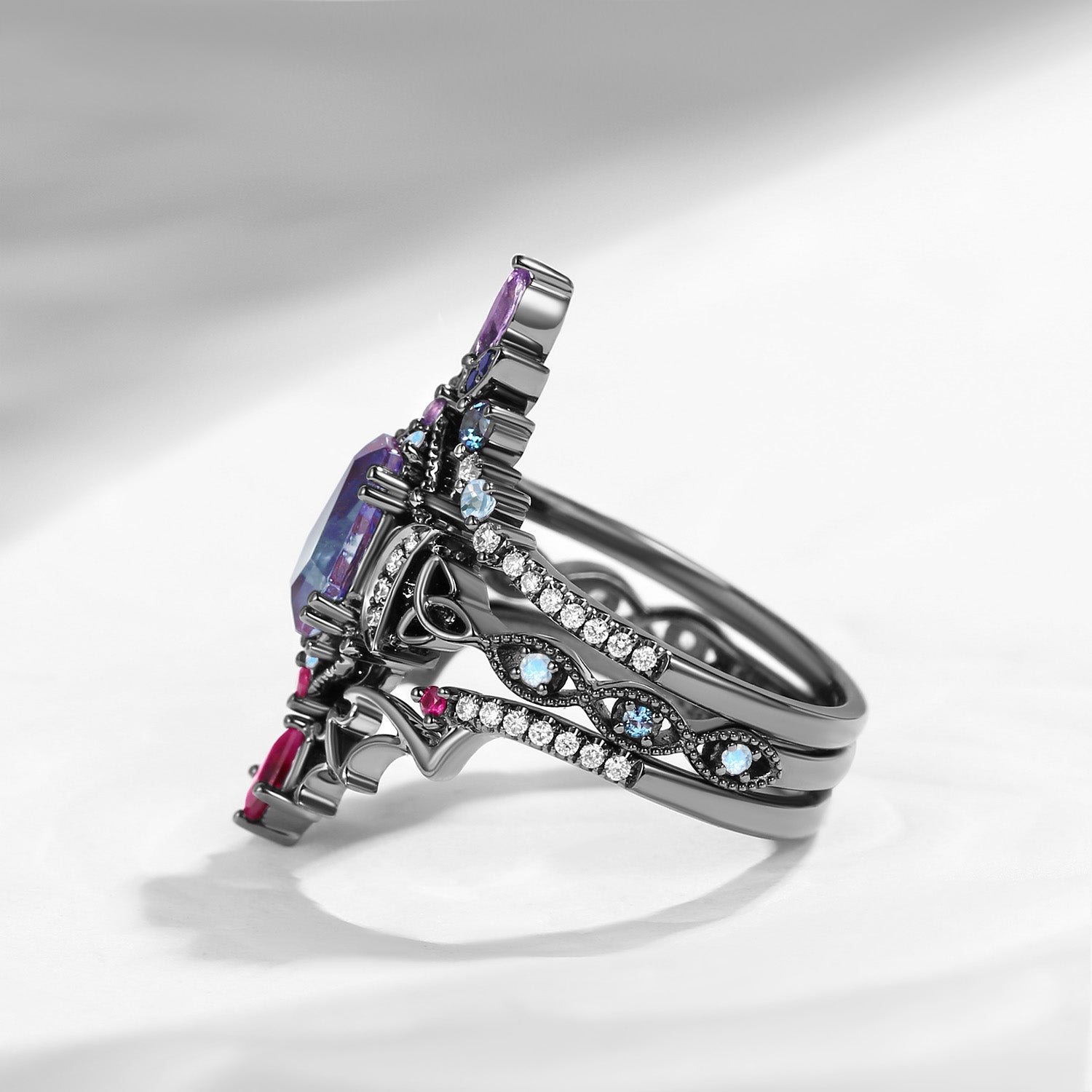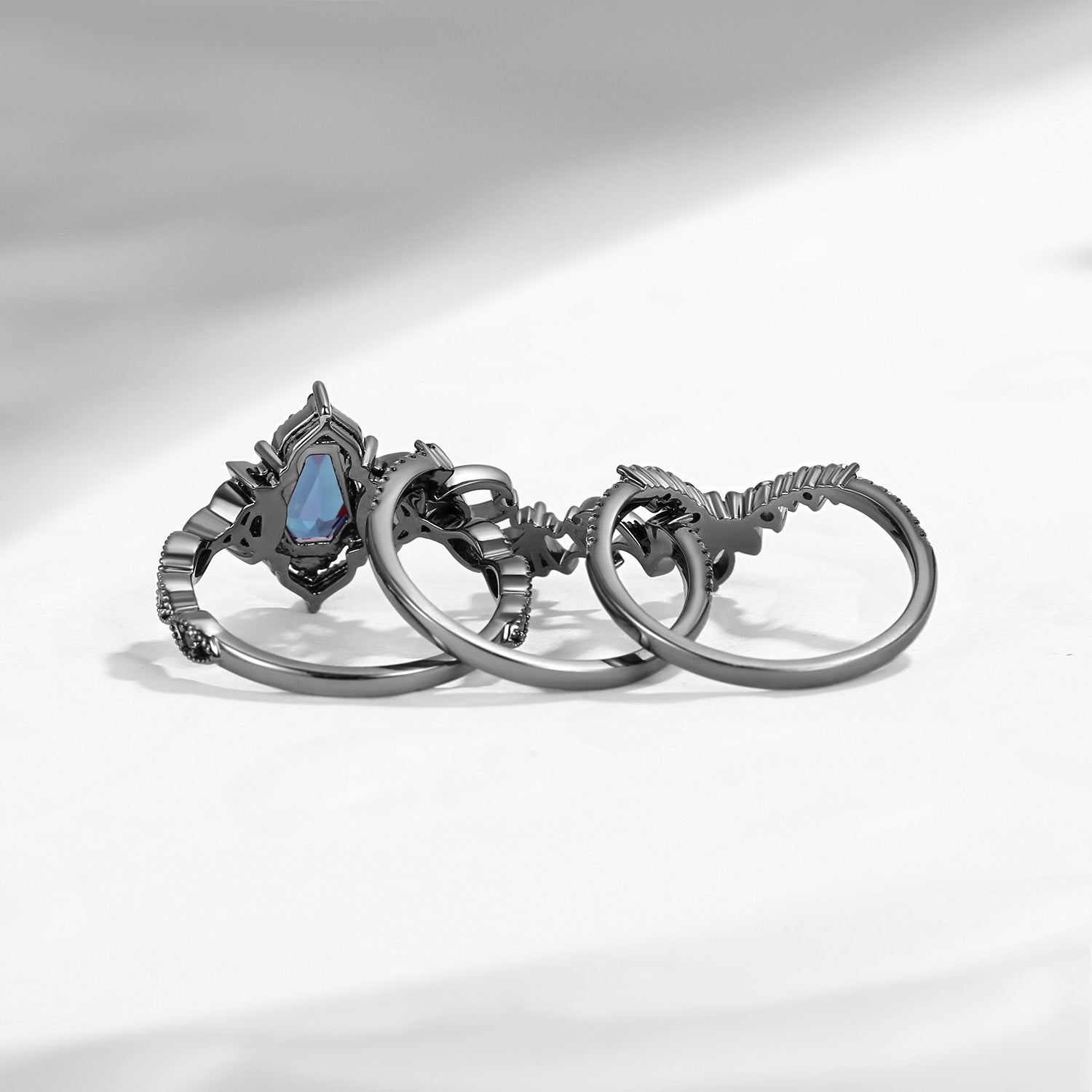 Crescent Moon | Coffin Cut Lab Alexandrite Black Gold Celtic Knot Ring Set 3pcs